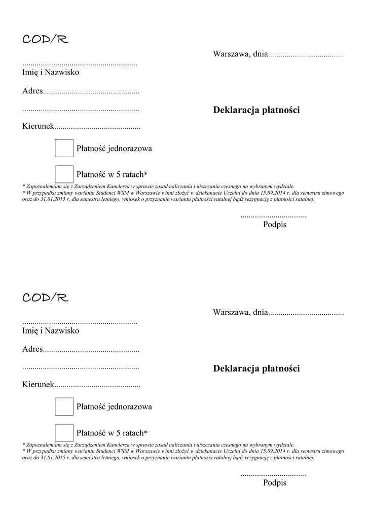 COD/R Warszawa, dnia..................................... ........................................................ Imię i Nazwisko Adres............................................... ......................................................... Deklaracja płatności Kierunek.......................................... Płatność jednorazowa Płatność w 5 ratach* * Zapoznałem/am się z Zarządzeniem Kanclerza w sprawie zasad naliczania i uiszczania czesnego na wybranym wydziale. * W przypadku zmiany wariantu Studenci WSM w Warszawie winni złożyć w dziekanacie Uczelni do dnia 15.09.2014 r. dla semestru zimowego oraz do 31.01.2015 r. dla semestru letniego, wniosek o przyznanie wariantu płatności ratalnej bądź rezygnację z płatności ratalnej. ................................ Podpis COD/R Warszawa, dnia..................................... ........................................................ Imię i Nazwisko Adres............................................... ......................................................... Deklaracja płatności Kierunek.......................................... Płatność jednorazowa Płatność w 5 ratach* * Zapoznałem/am się z Zarządzeniem Kanclerza w sprawie zasad naliczania i uiszczania czesnego na wybranym wydziale. * W przypadku zmiany wariantu Studenci WSM w Warszawie winni złożyć w dziekanacie Uczelni do dnia 15.09.2014 r. dla semestru zimowego oraz do 31.01.2015 r. dla semestru letniego, wniosek o przyznanie wariantu płatności ratalnej bądź rezygnację z płatności ratalnej. ................................ Podpis