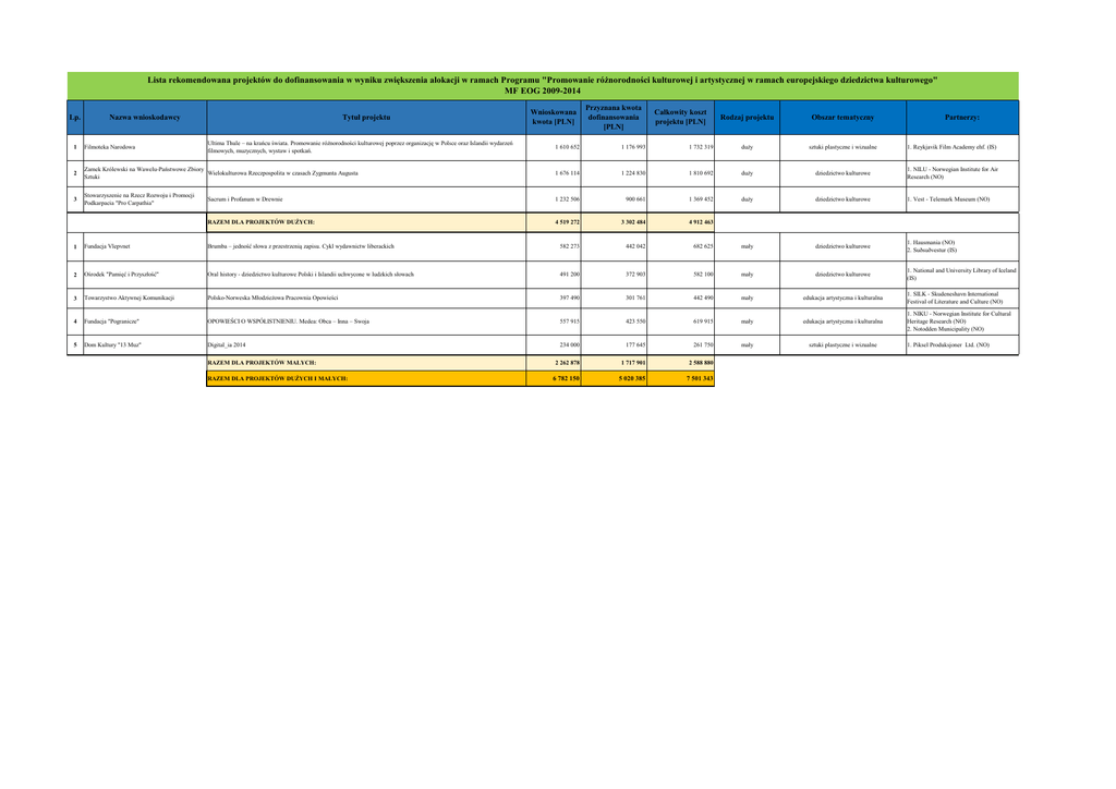 Lista rekomendowana projektów do dofinansowania w wyniku zwiększenia alokacji w ramach Programu "Promowanie różnorodności kulturowej i artystycznej w ramach europejskiego dziedzictwa kulturowego" MF EOG 2009-2014 Lp. Nazwa wnioskodawcy 1 Filmoteka Narodowa 2 3 Tytuł projektu Ultima Thule – na krańcu świata. Promowanie różnorodności kulturowej poprzez organizację w Polsce oraz Islandii wydarzeń filmowych, muzycznych, wystaw i spotkań. Wnioskowana kwota [PLN] Przyznana kwota dofinansowania [PLN] Całkowity koszt projektu [PLN] Rodzaj projektu Obszar tematyczny Partnerzy: 1 610 652 1 176 993 1 732 319 duży sztuki plastyczne i wizualne 1. Reykjavik Film Academy ehf. (IS) Zamek Królewski na Wawelu-Państwowe Zbiory Wielokulturowa Rzeczpospolita w czasach Zygmunta Augusta Sztuki 1 676 114 1 224 830 1 810 692 duży dziedzictwo kulturowe 1. NILU - Norwegian Institute for Air Research (NO) Stowarzyszenie na Rzecz Rozwoju i Promocji Podkarpacia "Pro Carpathia" Sacrum i Profanum w Drewnie 1 232 506 900 661 1 369 452 duży dziedzictwo kulturowe 1. Vest - Telemark Museum (NO) RAZEM DLA PROJEKTÓW DUŻYCH: 4 519 272 3 302 484 4 912 463 1 Fundacja Vlepvnet Brumba – jedność słowa z przestrzenią zapisu. Cykl wydawnictw liberackich 582 273 442 042 682 625 mały dziedzictwo kulturowe 1. Hausmania (NO) 2. Suðsuðvestur (IS) 2 Ośrodek "Pamięć i Przyszłość" Oral history - dziedzictwo kulturowe Polski i Islandii uchwycone w ludzkich słowach 491 200 372 903 582 100 mały dziedzictwo kulturowe 1. National and University Library of Iceland (IS) 3 Towarzystwo Aktywnej Komunikacji Polsko-Norweska Młodzieżowa Pracownia Opowieści 397 490 301 761 442 490 mały edukacja artystyczna i kulturalna 1. SILK - Skudeneshavn International Festival of Literature and Culture (NO) 4 Fundacja "Pogranicze" OPOWIEŚCI O WSPÓŁISTNIENIU. Medea: Obca – Inna – Swoja 557 915 423 550 619 915 mały edukacja artystyczna i kulturalna 1. NIKU - Norwegian Institute for Cultural Heritage Research (NO) 2. Notodden Municipality (NO) 5 Dom Kultury "13 Muz" Digital_ia 2014 mały sztuki plastyczne i wizualne RAZEM DLA PROJEKTÓW MAŁYCH: RAZEM DLA PROJEKTÓW DUŻYCH I MAŁYCH: 234 000 177 645 261 750 2 262 878 1 717 901 2 588 880 6 782 150 5 020 385 7 501 343 1. Piksel Produksjoner Ltd. (NO)