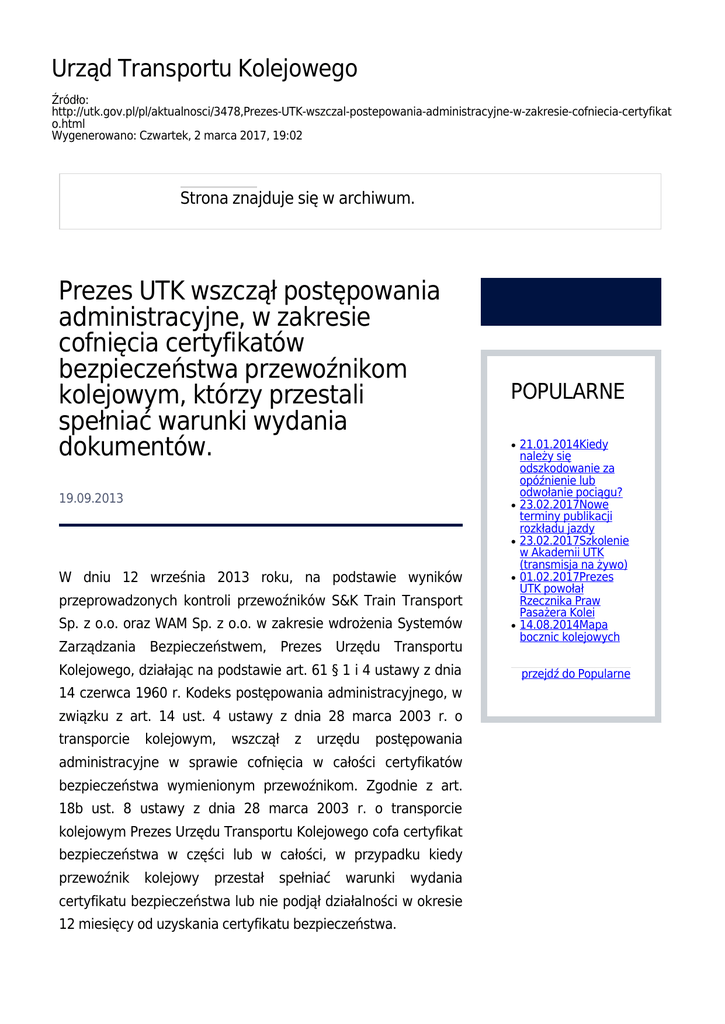 Urząd Transportu Kolejowego Źródło: http://utk.gov.pl/pl/aktualnosci/3478,Prezes-UTK-wszczal-postepowania-administracyjne-w-zakresie-cofniecia-certyfikat o.html Wygenerowano: Czwartek, 2 marca 2017, 19:02 Strona znajduje się w archiwum. Prezes UTK wszczął postępowania administracyjne, w zakresie cofnięcia certyfikatów bezpieczeństwa przewoźnikom kolejowym, którzy przestali spełniać warunki wydania dokumentów. 19.09.2013 POPULARNE ● ● ● W dniu 12 września 2013 roku, na podstawie wyników ● przeprowadzonych kontroli przewoźników S&K Train Transport Sp. z o.o. oraz WAM Sp. z o.o. w zakresie wdrożenia Systemów Zarządzania Bezpieczeństwem, Prezes Urzędu Transportu Kolejowego, działając na podstawie art. 61 § 1 i 4 ustawy z dnia 14 czerwca 1960 r. Kodeks postępowania administracyjnego, w związku z art. 14 ust. 4 ustawy z dnia 28 marca 2003 r. o transporcie kolejowym, wszczął z urzędu postępowania administracyjne w sprawie cofnięcia w całości certyfikatów bezpieczeństwa wymienionym przewoźnikom. Zgodnie z art. 18b ust. 8 ustawy z dnia 28 marca 2003 r. o transporcie kolejowym Prezes Urzędu Transportu Kolejowego cofa certyfikat bezpieczeństwa w części lub w całości, w przypadku kiedy przewoźnik kolejowy przestał spełniać warunki wydania certyfikatu bezpieczeństwa lub nie podjął działalności w okresie 12 miesięcy od uzyskania certyfikatu bezpieczeństwa. ● 21.01.2014Kiedy należy się odszkodowanie za opóźnienie lub odwołanie pociągu? 23.02.2017Nowe terminy publikacji rozkładu jazdy 23.02.2017Szkolenie w Akademii UTK (transmisja na żywo) 01.02.2017Prezes UTK powołał Rzecznika Praw Pasażera Kolei 14.08.2014Mapa bocznic kolejowych przejdź do Popularne Prezes Urzędu Transportu Kolejowego przypomina jednocześnie, że zgodnie z § 1 ust. 1 pkt 2 Rozporządzenia Ministra Transportu z dnia 12 marca 2007 w sprawie warunków oraz trybu wydawania, przedłużania, zmiany i cofania autoryzacji bezpieczeństwa, certyfikatów bezpieczeństwa i świadectw bezpieczeństwa, kluczowym warunkiem wydania przewoźnikom certyfikatu jest akceptacja Systemu Zarządzania Bezpieczeństwem. Systemy te, zgodnie art. 17a ust. 2 ustawy o transporcie kolejowym powinny być wdrożone, czyli stosowane w praktyce tj.: być dostosowane do charakteru, rozmiaru i innych warunków prowadzonej działalności, oraz powinny zapewniać nadzór nad ryzykiem związanym z wprowadzeniem nowych rozwiązań technicznych i technologicznych, łącznie z ryzykiem podwykonawców, dostawców materiałów i usług związanych z utrzymaniem, oraz uwzględniać ryzyko społeczne oraz ryzyko działalności osób trzecich. Zgodnie z preambułą Rozporządzenia KE 1158/2010 każdy krajowy organ bezpieczeństwa, w Polsce Prezes Urząd Transportu Kolejowego, powinien weryfikować czy wyniki wskazane we wniosku o wydanie certyfikatu bezpieczeństwa są osiągane podczas eksploatacji po wydaniu certyfikatu, a także czy stale spełniane są wszystkie niezbędne wymogi. Jednocześnie, zgodnie z art. 4 Rozporządzenia po wydaniu certyfikatu bezpieczeństwa krajowe organy bezpieczeństwa, zarówno w odniesieniu do części A, jak i części B certyfikatów bezpieczeństwa, nadzorują przedsiębiorstwa kolejowe stałe stosowanie systemu przez zarządzania bezpieczeństwem oraz stosują zasady nadzoru określone w załączniku IV Rozporządzenia. Załącznik ten w pkt 2, nakłada obowiązek sposobu podejmowania działań przez krajowy organ bezpieczeństwa, w celu zapewnienia zgodności lub pociągnięcia przedsiębiorstw kolejowych do odpowiedzialności z tytułu niewywiązania proporcjonalny się do z obowiązków prawnych, ewentualnego w zagrożenia sposób dla bezpieczeństwa, lub potencjalnej wagi niezgodności, w tym wszelkich faktycznych lub potencjalnych szkód. W związku z powyższym, Prezes Urzędu Transportu Kolejowego przypomina, że certyfikowani przewoźnicy kolejowi zobowiązani są do prowadzenia bieżącej działalności w oparciu o procedury przyjęte w systemach zarządzania bezpieczeństwem oraz stosowania rozwiązań przyjętych w ramach wspólnych metod bezpieczeństwa w zakresie wyceny i oceny ryzyka (Rozporządzenie 352/2009) i monitorowania (Rozporządzenie 1078/2012) a także wykorzystywania wewnętrznie narzędzi określonych w punkcie S załącznika II do Rozporządzenia KE 1158/2010 celem nadzoru nad spełnianiem przez dany podmiot w sposób ciągły warunków wydania certyfikatu.