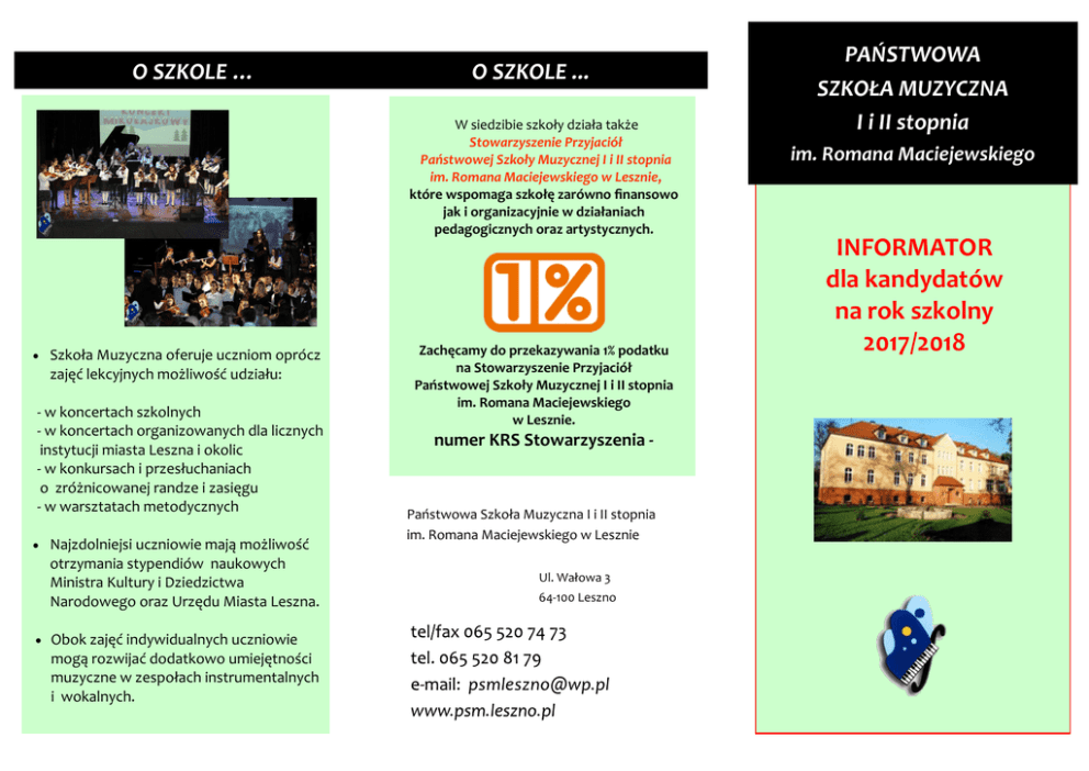 O SZKOLE … O SZKOLE ... PAŃSTWOWA SZKOŁA MUZYCZNA I i II stopnia Dewiza firmy. W siedzibie szkoły działa także Stowarzyszenie Przyjaciół Państwowej Szkoły Muzycznej I i II stopnia im. Romana Maciejewskiego w Lesznie, które wspomaga szkołę zarówno finansowo jak i organizacyjnie w działaniach pedagogicznych oraz artystycznych. Szkoła Muzyczna oferuje uczniom oprócz zajęć lekcyjnych możliwość udziału: - w koncertach szkolnych - w koncertach organizowanych dla licznych instytucji miasta Leszna i okolic - w konkursach i przesłuchaniach o zróżnicowanej randze i zasięgu - w warsztatach metodycznych Najzdolniejsi uczniowie mają możliwość otrzymania stypendiów naukowych Ministra Kultury i Dziedzictwa Narodowego oraz Urzędu Miasta Leszna. Obok zajęć indywidualnych uczniowie mogą rozwijać dodatkowo umiejętności muzyczne w zespołach instrumentalnych i wokalnych. Zachęcamy do przekazywania 1% podatku na Stowarzyszenie Przyjaciół Państwowej Szkoły Muzycznej I i II stopnia im. Romana Maciejewskiego w Lesznie. numer KRS Stowarzyszenia - Państwowa Szkoła Muzyczna I i II stopnia im. Romana Maciejewskiego w Lesznie Ul. Wałowa 3 64-100 Leszno @ im. Romana Maciejewskiego INFORMATOR dla kandydatów na rok szkolny 2017/2018 INFORMATOR dla kandydatów na rok szkolny 2017/2018 KIERUNKI KSZTAŁCENIA Szkoła Muzyczna I stopnia Sześcioletni cykl kształcenia (dla dzieci, które ukończyły 5 lat i nie przekroczyły wieku 10 lat) - fortepian, akordeon, skrzypce, wiolonczela, gitara, flet, perkusja; Czteroletni cykl kształcenia (dla dzieci, które ukończyły 8 lat i nie przekroczyły wieku 16 lat) - fortepian, skrzypce, wiolonczela, kontrabas, gitara, akordeon, flet, fagot, saksofon, klarnet, trąbka, puzon, perkusja; Szkoła Muzyczna II stopnia Nauka trwa 6 lat (dla kandydatów, którzy ukończyli 10 lat i nie przekroczyli wieku 23 lat) - fortepian, akordeon, skrzypce, altówka, wiolonczela, kontrabas, gitara, flet, klarnet, fagot, saksofon, trąbka, puzon, waltornia, tuba, perkusja; ZASADY PRZYJMOWANIA KANDYDATÓW Szkoła Muzyczna I stopnia Indywidualne badanie przydatności -cykl sześcioletni - indywidualne praktyczne badanie uzdolnień muzycznych (zadania słuchowe, wokalne i ruchowe) - cykl czteroletni - indywidualne praktyczne badanie uzdolnień muzycznych (zadania słuchowe i wokalne) Szkoła Muzyczna II stopnia Egzamin wstępny - egzamin praktyczny z gry na wybranym instrumencie - egzamin ustny z kształcenia słuchu część praktyczna (zagadnienia słuchowe) + część teoretyczna INFORMACJE OGÓLNE 1. Dzień Otwarty - sobota 08.04.2017 r. o godz. 10.00 2. Wypełnione podania należy składać w sekretariacie szkoły do dnia 28.04.2017 r. Do podania należy dołączyć świadectwo zdrowia wydane przez lekarza rodzinnego o braku przeciwwskazań do zwiększonego wysiłku fizycznego związanego z nauką w szkole muzycznej. 3. Badanie przydatności do PSM I stopnia - sobota 13.05.2017 r. od godz. 9.00. 4. Egzamin wstępny do PSM II stopnia - piątek 12.05.2017 r. 0d godz. 9.00 5. Regulamin przyjmowania uczniów, zakres badań rekrutacyjnych, zasady punktacji oraz podania do szkoły dostępne są na stronie www.psm.leszno.pl w zakładce Rekrutacja.