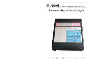 JABEL ® Jabel 76-270 Ustka ul. S³upska 3, tel./fax (+48 59) 814 56 66 Sterownik dzwonków szkolnych e-mail: [email protected] www.jabel.com.pl Sterownik dzwonków szkolnych jest urz¹dzeniem zapewniaj¹cym automatyczne wyzwalanie dzwonków na lekcje i przerwy. Momenty wyzwalania programowane s¹ indywidualnie dla ka¿dego z siedmiu dni tygodnia (poniedzia³ek-1, niedziela-7) a ka¿demu z nich mo¿na przyporz¹dkowaæ 30 wartoœci co ogranicza liczbê zajêæ lekcyjnych do 15 w ci¹gu dnia. Podstawowym Ÿród³em zasilania jest sieæ 220 V a awaryjnym bateria. Zasilanie bateryjne zabezpiecza wprowadzone dane oraz pozwala na ci¹gle odmierzanie czasu przy braku napiêcia sieciowego, natomiast wszystkie funkcje urz¹dzenia s¹ zablokowane. Elementy pozwalaj¹ce na komunikacjê z u¿ytkownikiem to: klawiatura i 8-cyfrowy wyœwietlacz LED. Klawiatura sk³ada siê z 12 klawiszy, z których 7 posiada podwójne znaczenie zmieniane klawiszem „CTRL”. Drugi zestaw klawiszy sygnalizowany jest œwiec¹c¹ lampk¹ „CONTROL”. Elementem za³¹czaj¹cym dzwonek jest przekaŸnik. . Bezpoœrednio po podaniu zasilania sieciowego na wyœwietlaczu widoczne s¹ (od lewej): - numer dnia tygodnia (1 cyfra z kropk¹) - numer realizowanej lekcji/przerwy (2 cyfry - zapalona kropka oznacza przerwê) - aktualny czas w formacie godz:min Ten tryb jest podstawowym i mo¿na go zmieniæ przy pomocy klawiatury. PROGRAMOWANIE URZ¥DZENIA: 1. ustawianie czasu: (CTRL+GODZINA przytrzymane przez 5 sek.) Na wyœwietlaczu pojawia siê napis "Go." i aktualny czas w formacie gg:mm:ss. Zmiana polega na wpisaniu odpowiedniej sekwencji cyfr i potwierdzeniu tego faktu klawiszem 'ENTER'. rezygnacjê umo¿liwia klawisz 'ESC'. 2. ustawienie daty: (CTRL+DATA przytrzymane przez 5 sek.) Na wyœwietlaczu pojawia siê napis "DA." i aktualna data w formacie rr:mm:dd. Zmiana polega na wpisaniu odpowiedniej sekwencji cyfr i potwierdzeniu tego faktu klawiszem 'ENTER'. Rezygnacjê umo¿liwia klawisz 'ESC'. PPHU “Jabel”s.c. 76-270 Ustka ul. S³upska 3 tel./fax (059) 814 56 66 e-mail: [email protected] www.jabel.com.pl SCHEMAT MONTA¯U STEROWNIKA ZASILANIE DZWONKA DZWONEK ZASILACZ STEROWNIK DZWONKÓW SZKOLNYCH MIKROPROCESOROWY CONTROL CLR PgUp PLAN 7 8 9 DATA 4 5 6 GODZINA 1 2 PgDn 3 JABEL ESC DZWONEK 0 OK CTRL ENTER 3. programowanie planu zajêæ:(CTRL+PLAN przytrzymane przez 5sek.) Format wyœwietlanych danych oraz sposób poruszania siê po tabelach jest taki sam jak podczas przegl¹dania. Czasy wprowadzamy przy pomocy klawiszy cyfrowych w formacie gg:mm. Plan zajêæ dla jednego dnia winien rozpoczynaæ siê od lekcji pierwszej i koñczyæ na ostatniej przerwie. Czasy powinny byæ uporz¹dkowane rosn¹co. Nie wykorzystane pozycje nale¿y skasowaæ za pomoc¹ klawisza (’CTRL’). Kasuje on wszystkie zapisy od aktualnie wyœwietlanego do koñca tabelki. Naciœniêcie klawiszy (’CTRL' i 'OK.’ przytrzymane przez 5sek.) powoduje zapamiêtanie planu dla tego dnia. Który by³ w³aœnie edytowany i za³adowanie nastêpnego dnia do edycji.Je¿eli w edycji pozostaje ten sam dzieñ, to œwiadczy to o b³êdnie wprowadzonych danych.Po skorygowaniu b³êdów mo¿emy ponowiæ próbê zapisu. Dane uznaje siê za poprawne gdy wprowadzone czasy mieszcz¹ siê w zakresie 00:00 do 23:59.Natomiast programuj¹cy powinien zadbaæ o to by d³ugoœæ lekcji lub przerwy nie przekracza³a 254 minut a odpowiednie czasy zwiêksza³y siê od pocz¹tku tabeli do koñca danych, oraz nie wykorzystane pozycje by³y wykasowane. Niedope³nienie tych warunków mo¿e spowodowaæ b³êdne wyzwalanie dzwonków. Wyjœcie z programowania osi¹gamy klawiszem 'ESC'. 4. rêczne za³¹czenie dzwonka (wejœcie: 'CTRL'+'DZWONEK') za³¹czenie podtrzymywane jest do momentu zwolnienia przycisku. 5. wyœwietlanie daty data w formacie dd-mm-rrrr pojawia siê na wyœwietlaczu na czas przytrzymywania przycisku. "DATA" 6. przegl¹danie planu zajêæ (przycisk "PLAN") format wyœwietlanych danych jest taki sam jak dla trybu podstawowego z t¹ ró¿nic¹, ¿e: nie pulsuje kropka sekundowa a pomiêdzy numerem zajêæ i czasem ich rozpoczêcia pojawia siê myœlnik. Przegl¹danie w obrêbie jednego dnia umo¿liwiaj¹ klawisze kursora natomiast zmiana dnia dostêpna jest poprzez klawisze stronicowania. Powrót do trybu podstawowego realizujemy klawiszem 'ESC’ CONTROL CLR 7 PLAN CTRL PgUp 8 + DATA 4 PROGRAMOWANIE DATY 9 Rok Miesi¹c ESC DZWONEK 4 DATA 5 0 Dzieñ ESC 6 6 0 DZWONEK GODZINA 1 5 = 15 czerwca 2006r. 6 OK PgDn 1 GODZINA 3 2 ZATWIERDZENIE DANYCH ENTER ESC ESC DZWONEK DATA 4 0 CTRL PODGL¥D DATY CTRL + CLR PLAN 7 PROGRAMOWANIE PLANU LEKCJI BIE¯¥CY DZIEÑ, PIERWSZA LEKCJA ESC 7 ANULOWANIE PROGRAMOWANIA ENTER CLR PLAN 0 DZWONEK CTRL OK DZWONEK ESC ESC 8 0 DZWONEK 0 DZWONEK 0 PODGL¥D PLANU ZAJÊÆ PIERWSZA LEKCJA GODZ. 8 : 00 OK ENTER 8 POPRZEDNIA LEKCJA / PRZERWA 2 NASTÊPNA LEKCJA / PRZERWA ESC DZWONEK 3 CTRL + GODZINA 1 4 5 PRZERWA GODZ. 8 : 45 ENTER NASTÊPNY DZIEÑ TYGODNIA CTRL 8 POPRZEDNIA LEKCJA/PRZERWA 2 NASTÊPNA LEKCJA/PRZERWA ESC 0 DATA PRZEJŒCIE DO PROGRAMOWANIA NASTÊPNEJ LEKCJI ESC ANULOWANIE DZWONEK 0 PROGRAMOWANIA POPRZEDNI DZIEÑ TYGODNIA PgDn DZWONEK 8 OK 9 + 0 CTRL PgUp CTRL PRZEJŒCIE DO PROGRAMOWANIA PRZERWY RÊCZNE W£¥CZANIE DZWONKA PgUp PROGRAMOWANIE GODZINY 9 POPRZEDNI DZIEÑ PgDn PgDn GODZINA 1 5 3 ESC 5 DZWONEK 0 ESC DZWONEK 0 3 = 15:35:00 NASTÊPNY DZIEÑ OK ENTER ZATWIERDZENIE DANYCH CTRL ESC CTRL DZWONEK 0 ANULOWANIE PROGRAMOWANIA + OK ENTER ZATWIERDZENIE WPROWADZONYCH DANYCH