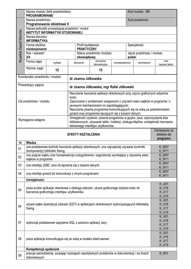 Nazwa modułu (blok przedmiotów): PROGRAMOWANIE Nazwa przedmiotu: Kod modułu: M8 Kod przedmiotu: Wypełnia Zespół Kierunku Programowanie obiektowe II Nazwa jednostki prowadzącej przedmiot / moduł: INSTYTUT INFORMATYKI STOSOWANEJ Nazwa kierunku: INFORMATYKA Forma studiów: Profil kształcenia: Specjalność: niestacjonarne PRAKTYCZNY Rok / semestr: Status przedmiotu /modułu: Język przedmiotu / modułu: 2/4 obowiązkowy polski ćwiczenia inne Forma zajęć wykład ćwiczenia konwersatorium seminarium laboratoryjne (wpisać jakie) Wymiar zajęć 15 Koordynator przedmiotu / modułu Prowadzący zajęcia Cel przedmiotu / modułu Wymagania wstępne Nr 01 02 15 dr Joanna Jółkowska dr Joanna Jółkowska, mgr Rafał Jółkowski Nauczenie tworzenia aplikacji okienkowych przy użyciu graficznych edytorów kodu; Zapoznanie z problemami związanymi z użyciem wielu wątków w programie i z javowymi mechanizmami im zapobiegającymi; Nauczenie pisania programów komunikujących się ze sobą za pośrednictwem gniazd oraz programów łączących się z bazami danych. Umiejętność czytania i pisania programów w języku Java; wykorzystanie klas bibliotecznych, używanie tablic i kolekcji, obsługa błędów; umiejętność tworzenia tekstowego interfejsu użytkownika. Odniesienie do EFEKTY KSZTAŁCENIA efektów dla programu Wiedza zna podstawowe techniki tworzenia aplikacji okienkowych, zna najczęściej używane kontrolki (komponenty) biblioteki Swing zna pojęcie wątku oraz konsekwencje (udogodnienia i zagrożenia) wynikające z używania wielu wątków w programie 03 zna interfejs JDBC Javy do łączenia się z bazami danych 04 zna interfejs gniazd do komunikacji z innymi programami K_W07 K_W11 K_W07 K_W11 K_W07 K_W11 K_W07 K_W11 Umiejętności 05 pisze proste aplikacje okienkowe z obsługą zdarzeń, używa graficznego edytora kodu do tworzenia graficznego interfejsu użytkownika 06 używa wątku dystrybucji zdarzeń (EDT) w aplikacjach okienkowych wykorzystujących bibliotekę Swing 07 wykonuje podstawowe zapytania SQL z poziomu aplikacji Javy 08 pisze aplikacje komunikujące się ze sobą w modelu klient-serwer 09 Kompetencje społeczne pracuje samodzielnie, szukając rozwiązań napotykanych problemów w dokumentacji i na forach internetowych K_U01 K_U16 K_U17 K_U19 K_U01 K_U16 K_U17 K_U19 K_U01 K_U16 K_U17 K_U19 K_U01 K_U16 K_U17 K_U19 K_K01 TREŚCI PROGRAMOWE Forma zajęć – WYKŁAD 1. Tworzenie programów wielowątkowych a. Tworzenie i uruchamianie wątków b. Problem jednoczesnego dostępu do danych – synchronizowanie wątków c. Problem blokady wątku d. Kolekcje bezpieczne wątkowo 2. Tworzenie interfejsów graficznych a. Podstawowe komponenty biblioteki Swing, obsługa zdarzeń b. Użycie graficznych edytorów do tworzenia graficznych interfejsów (NetBeans) c. Sposób użycia wątków w bibliotece Swing d. Alternatywne biblioteki graficzne 3. Komunikacja z bazami danych poprzez JDBC 4. Komunikacja sieciowa w programach desktopowych Javy a. Tworzenie i używanie gniazd TCP b. Tworzenie i używanie gniazd UDP c. Połączenia wykorzystujące URL Forma zajęć – LABORATORIUM 1. Powtórzenie podstawowych elementów języka Java – na przykładzie aplikacji konsolowej dla nauczyciela, przechowującej informacje o uczniach i ich ocenach 2. Tworzenie aplikacji okienkowych a. Rozmieszczanie kontrolek w oknie głównym b. Programowanie zdarzeń c. Użycie graficznego edytora kodu NetBeans d. Tworzenie graficznej aplikacji dla nauczyciela 3. Nawiązywanie połączenia z bazą danych Apache Derby a. Opracowanie podstawowej obsługi jednej tabeli w bazie b. Tworzenie aplikacji dla nauczyciela – zaprojektowanie i utworzenie prostej bazy danych do przechowywania informacji o uczniach, utworzenie interfejsów do obsługi tej bazy 4. Tworzenie wątków a. Tworzenie prostych wątków w aplikacjach konsolowych, generowanie zakleszczenia i niepożądanych przeplotów operacji, synchronizowanie metod b. Porównanie działania standardowych kolekcji i kolekcji bezpiecznych wątkowo c. Sposób wykorzystania wątku obsługi zdarzeń (EDT) w aplikacjach okienkowych d. Tworzenie zadań działających w tle w aplikacjach okienkowych 5. Komunikacja sieciowa a. Tworzenie prostych aplikacji desktopowych w modelu klient-serwer z użyciem gniazd TCP b. Porównanie gniazd TCP i UDP c. Zapoznanie się z możliwościami klasy URL d. Tworzenie większej desktopowej aplikacji sieciowej, np. komunikator. Wykład z prezentacją – wprowadzający podstawowe pojęcia i problemy (slajdy), oraz prezentujący przykładowe rozwiązania (programowanie „na żywo”) Metody kształcenia Ćwiczenia laboratoryjne – studenci wykonują samodzielnie podstawowe przykłady z wykładu, następnie dodatkowe zadania z rosnącym stopniem złożoności; w ciągu całego semestru rozwijają większy projekt, uzupełniając go stopniowo o kolejne nowo poznane elementy Metody weryfikacji efektów kształcenia Krótki sprawdzian pisemny na początku zajęć Projekt Egzamin pisemny Forma i warunki zaliczenia Kolokwia i testy na laboratoriach, pisemny egzamin końcowy Literatura podstawowa 1. Dokumentacja ze strony java.sun.com Nr efektu kształcenia z sylabusa 05,06,07,08 05,06,07,08,09 01,02,03,04 2. Cay S. Horstmann, Gary Cornell – Java. Techniki zaawansowane. Wydanie VIII. Helion 2008 Literatura uzupełniająca NAKŁAD PRACY STUDENTA: Udział w wykładach Samodzielne studiowanie tematyki wykładów Udział w ćwiczeniach audytoryjnych i laboratoryjnych* Samodzielne przygotowywanie się do ćwiczeń* Przygotowanie projektu / eseju / itp. * Przygotowanie się do egzaminu / zaliczenia Udział w konsultacjach Inne: egzamin ŁĄCZNY nakład pracy studenta w godz. Liczba punktów ECTS za przedmiot Obciążenie studenta związane z zajęciami praktycznymi* Obciążenie studenta na zajęciach wymagających bezpośredniego udziału nauczycieli akademickich Liczba godzin 15 30 15 30 20 10 5 2 127 5 65 2,6 ECTS 37 1,5 ECTS