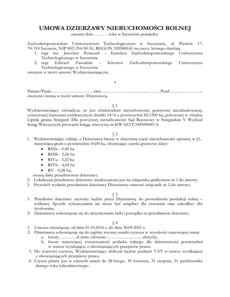 UMOWA DZIERŻAWY NIERUCHOMOŚCI ROLNEJ zawarta dnia ……… roku w Szczecinie pomiędzy: Zachodniopomorskim Uniwersytetem Technologicznym w Szczecinie, al. Piastów 17, 70-310 Szczecin, NIP 852-254-50-56, REGON 320588161 na rzecz, którego działają: 1. mgr inż. Jarosław Potaczek – Kanclerz Zachodniopomorskiego Uniwersytetu Technologicznego w Szczecinie 2. mgr Edward Zawadzki – Kwestor Zachodniopomorskiego Uniwersytetu Technologicznego w Szczecinie zwanym w treści umowy Wydzierżawiającym, a Panem/Panią ……………………… zam. ………………………...……… Pesel………………….. zwanym/zwaną w treści umowy Dzierżawcą. §1 Wydzierżawiający oświadcza, że jest właścicielem nieruchomości gruntowej niezabudowanej, oznaczonej numerem ewidencyjnym działki 14/4 o powierzchni 83,1200 ha, położonej w obrębie Lipnik gmina Stargard. Dla powyższej nieruchomości Sąd Rejonowy w Stargardzie V Wydział Ksiąg Wieczystych prowadzi księgę wieczystą nr KW SZ1T/00049600/4. §2 1. Wydzierżawiający oddaje, a Dzierżawca bierze w dzierżawę część nieruchomości opisanej w §1, stanowiącą grunt o powierzchni 10,00 ha, obejmujący użytki gruntowe klasy: RIIIa - 0,40 ha RIIIb - 2,06 ha RIVa - 3,22 ha RIVb - 4,04 ha RV - 0,28 ha, zwaną dalej przedmiotem dzierżawy. 2. Lokalizacja przedmiotu dzierżawy uwidoczniona jest na załączniku graficznym nr 1 do umowy. 3. Protokół wydania przedmiotu dzierżawy Dzierżawcy stanowi załącznik nr 2 do umowy. §3 1. Przedmiot dzierżawy używany będzie przez Dzierżawcę do prowadzenia produkcji rolnej – roślinnej. Sposób wykorzystania nie może być uciążliwy dla otoczenia oraz szkodliwy dla środowiska. 2. Dzierżawca zobowiązuje się do utrzymywania ładu i porządku na przedmiocie dzierżawy. 1. 2. 3. 4. §4 Umowa obowiązuje od dnia 01.10.2016 r. do dnia 30.09.2021 r. Dzierżawca zobowiązuje się do zapłaty rocznej stawki czynszu w wysokości stanowiącej sumę: a. kwoty ………. zł netto (słownie: ………………….. złotych), b. kwoty stanowiącej równowartość podatku rolnego dla dzierżawionej powierzchni w stawce wynikającej z obowiązujących przepisów prawa. Do wartości czynszu, Wydzierżawiający doliczał będzie podatek VAT w stawce wynikającej z obowiązujących przepisów prawa. Czynsz płatny jest w czterech ratach do 28 lutego, 30 kwietnia, 31 sierpnia, 31 października danego roku kalendarzowego. 5. Czynsz płatny jest po otrzymaniu faktury, na rachunek bankowy wskazany w fakturze. 6. Wysokość czynszu korygowana będzie co rok o ogłoszony w Monitorze Polskim przez Prezesa GUS, średnioroczny wskaźnik wzrostu cen towarów i usług konsumpcyjnych ogółem, w stosunku do roku poprzedniego, pod warunkiem że będzie miał on wartość dodatnią. Zmiana wysokości czynszu z tego tytułu wprowadzana będzie począwszy od następnego miesiąca po opublikowaniu wskaźnika w MP i nie wymaga pisemnego aneksu do umowy. §5 Za opóźnienie w zapłacie czynszu Dzierżawca zobowiązany będzie do zapłaty odsetek ustawowych. §6 1. Celem zabezpieczenia roszczeń Wydzierżawiającego o zapłatę czynszu i odszkodowania za ewentualne szkody w przedmiocie dzierżawy, nie spowodowane zwyczajnym jego używaniem, Dzierżawca składa Wydzierżawiającemu kaucję w wysokości 3500,00 zł (słownie: trzy tysiące pięćset złotych), która winna być uznana na rachunku bankowym Uczelni : BZ WBK 10 1090 0004 9797 1001 0215 3704 w dniu zawarcia umowy. 2. Kaucja zostanie zwrócona Dzierżawcy, najpóźniej w ciągu miesiąca od chwili zwrotu przedmiotu dzierżawy. Obowiązek zwrotu nie istnieje w zakresie niezaspokojonej wierzytelności objętej zabezpieczeniem. §7 1. Dzierżawca zobowiązany jest do wykonywania swojego prawa zgodnie z wymaganiami prawidłowej gospodarki. 2. Dbałość o czystość i estetykę na terenie przedmiotu dzierżawy i w najbliższym jego otoczeniu, należy do obowiązków Dzierżawcy, który ponosi tego koszty. 3. Dzierżawca zobowiązany jest do bezwzględnego przestrzegania przepisów prawa, w szczególności w zakresie ochrony środowiska i gospodarki odpadami, jak również przepisów BHP i Ppoż. oraz jest zobowiązany do wykonywania czynności w zakresie ochrony przeciwpożarowej. 4. Dzierżawca zobowiązuje się utrzymania terenu w odpowiedniej kulturze. §8 Dzierżawca nie ma prawa oddawania przedmiotu dzierżawy osobom trzecim w poddzierżawę lub bezpłatne używanie, ani też obciążania przedmiotu dzierżawy innym prawem na rzecz osób trzecich, bez uzyskania pisemnej zgody Wydzierżawiającego. §9 Umowa niniejsza może zostać rozwiązana w następujących przypadkach: 1. w każdym czasie za obopólną zgodą stron, 2. przez Wydzierżawiającego – ze skutkiem na dzień 30 września roku kalendarzowego, w przypadku gdy przedmiot dzierżawy (lub jego część) stanie się niezbędny do wykorzystania na potrzeby statutowe Wydzierżawiającego lub zostanie przeznaczony na sprzedaż, 3. przez Wydzierżawiającego – bez terminów wypowiedzenia, jeżeli: a. Dzierżawca dopuszcza się zwłoki z zapłatą czynszu co najmniej za dwa pełne okresy (raty) płatności, po uprzednim jednak wyznaczeniu Dzierżawcy dodatkowego 3-miesięcznego terminu do zapłaty zaległego czynszu, b. Dzierżawca nie dba o przedmiot dzierżawy i doprowadza do jego pogorszenia, c. Dzierżawca wykorzystuje przedmiot dzierżawy niezgodnie z jego przeznaczeniem lub też swoim działaniem ujemnie wpływa na środowisko naturalne, d. Dzierżawca bez zgody Wydzierżawiającego odda przedmiot dzierżawy osobie trzeciej w poddzierżawę lub bezpłatne używanie lub obciąży innym prawem na rzecz osoby trzeciej. § 10 Dzierżawca obowiązany jest informować Wydzierżawiającego o wszelkich zmianach adresu do korespondencji w stosunku do podanego w nagłówku niniejszej umowy. W przypadku braku informacji o zmianach adresu do korespondencji, wszelkie pisma nadane listem poleconym