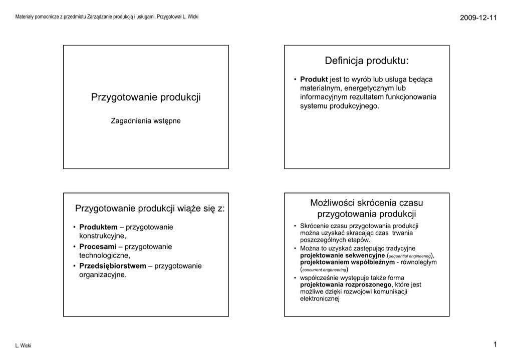 Materiały pomocnicze z przedmiotu Zarządzanie produkcją i usługami. Przygotował L. Wicki 2009-12-11 Definicja produktu: Przygotowanie produkcji • Produkt jest to wyrób lub usługa będąca materialnym, energetycznym lub informacyjnym rezultatem funkcjonowania systemu produkcyjnego. Zagadnienia wstępne Przygotowanie produkcji wiąże się z: • Produktem – przygotowanie konstrukcyjne, • Procesami – przygotowanie technologiczne, • Przedsiębiorstwem – przygotowanie organizacyjne. L. Wicki Możliwości skrócenia czasu przygotowania produkcji • Skrócenie czasu przygotowania produkcji można uzyskać skracając czas trwania poszczególnych etapów. • Można to uzyskać zastępując tradycyjne projektowanie sekwencyjne (sequential engineering), projektowaniem współbieżnym - równoległym (concurrent engeneering) • współcześnie występuje także forma projektowania rozproszonego, które jest możliwe dzięki rozwojowi komunikacji elektronicznej 1 Materiały pomocnicze z przedmiotu Zarządzanie produkcją i usługami. Przygotował L. Wicki – nastawienie na bieżącą współpracę w przygotowaniu produktu (wewnątrz i na zewnątrz firmy) – równoległe wykonywanie niektórych procesów – likwidacja niezgodności na bieżąco – nastawienie na czas przygotowania – krótszy czas realizacji Koszt spowodowany i koszt poniesiony Marketing • Projektowanie współbieżne – podział na zadania funkcjonalne – rozpoczęcie kolejnego zadania następuje po zakończeniu poprzedniego – występują trudności we współpracy między komórkami – mogą być konieczne korekty planów ze względu na niemożliwość przygotowania produktu zgodnie z założeniami etapu poprzedniego – nastawienie na koszt przygotowania – dłuższy czas realizacji Proces wprowadzania produktu Klient Przygotowanie produkcji • Projektowane sekwencyjne Marketing Wytwarzanie Możliwości zastosowania współbieżnego procesu projektowania 2009-12-11 Rozpoznanie potrzeb Przygotowanie technologiczne do produkcji Przygotowanie konstrukcyjne wyrobu Wytwarzanie produktu Produkt Dystrybucja marketing Koncepcja Koszt spowodowany (wytworzenia) 80% Klient New Product Development Badania i rozwój Koszt Przygotowanie organizacyjne do produkcji Wybór rozwiązania Techniki Rapid prototyping I Virtual Reality (VR) Opracowanie projektu Prototyp Koszt poniesiony 15% Margines swobody zmian kosztów Przygotowanie produkcji L. Wicki Produkcja i eksploatacja Czas Badania statystyczne Próby prototypu Przygotowanie organizacyjne i technologiczne Wytwarzanie 2 Materiały pomocnicze z przedmiotu Zarządzanie produkcją i usługami. Przygotował L. Wicki Strategie rynkowe produktu • wzrostu – rozwoju rynku – dywersyfikacja koncentryczna – dywersyfikacja horyzontalna • konsolidacji – ograniczanie – redukcja – pozbycie się 2009-12-11 ZP_zaocz Różnorodność a efektywność • różnorodność produktów • podział na grupy – metoda BCG – analiza Pareto (analiza ABC) • przyjęcie różnych strategii wobec poszczególnych grup produktów • uproszczenie struktury zarządzania i łatwiejsza ocena wyników • skupienie się na działalności podstawowej. Produkt Przygotowanie produkcji • Produkt jest efektem twórczego lub odtwórczego myślenia człowieka, a praca nad nim jest działaniem ciągłym. PRODUKT L. Wicki 3 Materiały pomocnicze z przedmiotu Zarządzanie produkcją i usługami. Przygotował L. Wicki Przygotowanie konstrukcyjne produktu • • • • Opracowanie koncepcji produktu, Wybór rozwiązania, Opracowanie dokumentacji konstrukcyjnej, Wytworzenie prototypu Funkcje produktu • Funkcje podstawowe, takie, które są niezbędne, aby produkt w ogóle wytwarzać (uzasadniają istnienie produktu) • Funkcje podrzędne, takie, które są spełniane przez produkt, ale nie są niezbędne do jego działania i wytwarzania • Funkcje zbędne, takie, które istnieją, ale których klient nie oczekuje L. Wicki 2009-12-11 Potrzeby i wymagania a funkcje produktu • Potrzeby związane są z klientem, a funkcje z produktem Funkcje produktu - żarówka • Podstawowa – oświetla pomieszczenie, • Podrzędna – pozwala na sygnalizację • Zbędna – wydziela ciepło 4 Materiały pomocnicze z przedmiotu Zarządzanie produkcją i usługami. Przygotował L. Wicki 2009-12-11 Analiza wartości Analiza wartości • Spełnienie każdej funkcji kosztuje. Analiza wartości to narzędzie pozwalające na dokonanie oceny kosztów spełniania określonych funkcji produktu. FUNKCJA koszt Analiza wartości 1. Sprecyzowanie potrzeb i wymagań klienta co do produktu 2. Analiza funkcji produktu 3. Opracowanie rozwiązań – np. metodą burzy mózgów, skojarzeniową, odwracania problemu, 4. Wybór rozwiązania najkorzystniejszego – przy pomocy technik wartościowania 5. Opracowanie dokumentacji konstrukcyjnej, ewentualnie wykonanie i badanie prototypu L. Wicki wartość Warunki ograniczające w procesie projektowania • Warunki ograniczające mogą dotyczyć: – wskaźników technicznych wyrobów (zużycie energii, rozmiary), – technologii wytwarzania. 5 Materiały pomocnicze z przedmiotu Zarządzanie produkcją i usługami. Przygotował L. Wicki 2009-12-11 Niezawodność Niezawodność PROJEKTOWANIE A NIEZAWODNOŚĆ: • to zdolność do ciągłego wykonywania wyznaczonych funkcji NIEZAWODNOŚĆ typy uszkodzeń korzystaj ze sprawdzonych rozwiązań Uszkodzenie całkowite korzystaj z prostych rozwiązań Uszkodzenie częściowe korzystaj z komponentów o wysokiej niezawodności Uszkodzenie stopniowe korzystaj z części rezerwowych Uszkodzenie nagłe korzystaj z systemów odpornych na uszkodzenia korzystaj ze sprawdzonych metod wykonywania L. Wicki 6 Materiały pomocnicze z przedmiotu Zarządzanie produkcją i usługami. Przygotował L. Wicki 2009-12-11 FMECA • • • • • • • • • L. Wicki Macierz krytyczności Failure Mode, Effects, and Criticality Analysis (FM