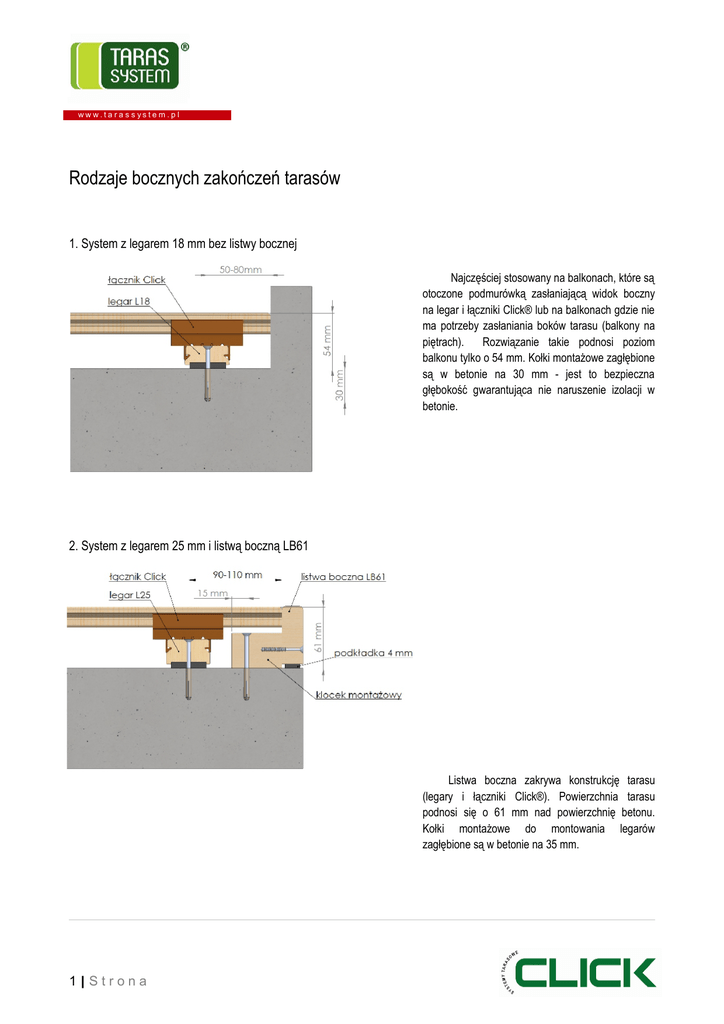www.ta r a s s ys te m.p l Rodzaje bocznych zakończeń tarasów 1. System z legarem 18 mm bez listwy bocznej Najczęściej stosowany na balkonach, które są otoczone podmurówką zasłaniającą widok boczny na legar i łączniki Click® lub na balkonach gdzie nie ma potrzeby zasłaniania boków tarasu (balkony na piętrach). Rozwiązanie takie podnosi poziom balkonu tylko o 54 mm. Kołki montażowe zagłębione są w betonie na 30 mm - jest to bezpieczna głębokość gwarantująca nie naruszenie izolacji w betonie. 2. System z legarem 25 mm i listwą boczną LB61 Listwa boczna zakrywa konstrukcję tarasu (legary i łączniki Click®). Powierzchnia tarasu podnosi się o 61 mm nad powierzchnię betonu. Kołki montażowe do montowania legarów zagłębione są w betonie na 35 mm. 1|Strona www.ta r a s s ys te m.p l 3. System z legarem 25 mm i listwą boczną LB 93 Listwa boczna LB 93 zakrywa konstrukcję tarasu (listwy i łączniki) i jednocześnie zakrywa krzywą krawędź betonu. Powierzchnia tarasu podnosi się o 61 mm nad powierzchnię betonu. 4. System z legarem konstrukcyjnym 50 mm Rozwiązanie to znajduje zastosowanie dla tarasów budowanych „od podstaw”, gdzie legar jest elementem konstrukcyjnym. W tym przypadku legary mocowane są najczęściej na betonowych bloczkach lub na uprzednio przygotowanej konstrukcji drewnianej. 2|Strona