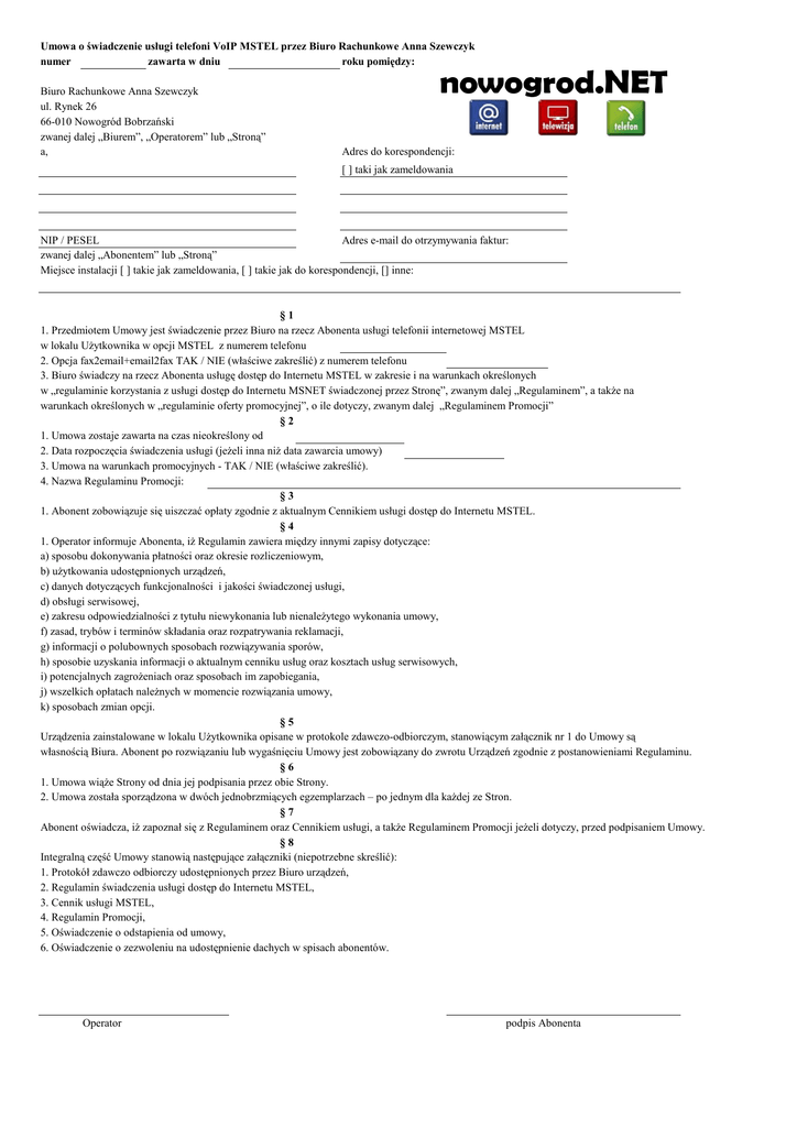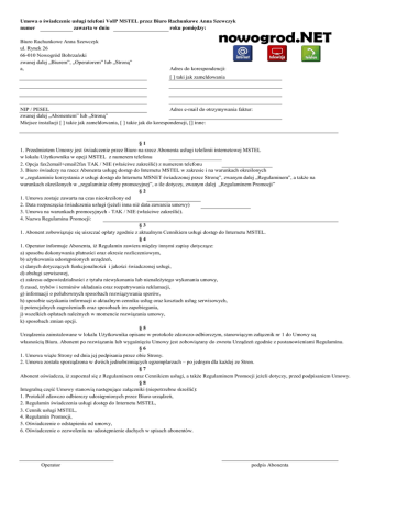 Umowa o świadczenie usługi telefoni VoIP MSTEL przez Biuro Rachunkowe Anna Szewczyk numer zawarta w dniu roku pomiędzy: Biuro Rachunkowe Anna Szewczyk ul. Rynek 26 66-010 Nowogród Bobrzański zwanej dalej „Biurem”, „Operatorem” lub „Stroną” a, Adres do korespondencji: [ ] taki jak zameldowania NIP / PESEL Adres e-mail do otrzymywania faktur: zwanej dalej „Abonentem” lub „Stroną” Miejsce instalacji [ ] takie jak zameldowania, [ ] takie jak do korespondencji, [] inne: §1 1. Przedmiotem Umowy jest świadczenie przez Biuro na rzecz Abonenta usługi telefonii internetowej MSTEL w lokalu Użytkownika w opcji MSTEL z numerem telefonu 2. Opcja fax2email+email2fax TAK / NIE (właściwe zakreślić) z numerem telefonu 3. Biuro świadczy na rzecz Abonenta usługę dostęp do Internetu MSTEL w zakresie i na warunkach określonych w „regulaminie korzystania z usługi dostęp do Internetu MSNET świadczonej przez Stronę”, zwanym dalej „Regulaminem”, a także na warunkach określonych w „regulaminie oferty promocyjnej”, o ile dotyczy, zwanym dalej „Regulaminem Promocji” §2 1. Umowa zostaje zawarta na czas nieokreślony od 2. Data rozpoczęcia świadczenia usługi (jeżeli inna niż data zawarcia umowy) 3. Umowa na warunkach promocyjnych - TAK / NIE (właściwe zakreślić). 4. Nazwa Regulaminu Promocji: §3 1. Abonent zobowiązuje się uiszczać opłaty zgodnie z aktualnym Cennikiem usługi dostęp do Internetu MSTEL. §4 1. Operator informuje Abonenta, iż Regulamin zawiera między innymi zapisy dotyczące: a) sposobu dokonywania płatności oraz okresie rozliczeniowym, b) użytkowania udostępnionych urządzeń, c) danych dotyczących funkcjonalności i jakości świadczonej usługi, d) obsługi serwisowej, e) zakresu odpowiedzialności z tytułu niewykonania lub nienależytego wykonania umowy, f) zasad, trybów i terminów składania oraz rozpatrywania reklamacji, g) informacji o polubownych sposobach rozwiązywania sporów, h) sposobie uzyskania informacji o aktualnym cenniku usług oraz kosztach usług serwisowych, i) potencjalnych zagrożeniach oraz sposobach im zapobiegania, j) wszelkich opłatach należnych w momencie rozwiązania umowy, k) sposobach zmian opcji. §5 Urządzenia zainstalowane w lokalu Użytkownika opisane w protokole zdawczo-odbiorczym, stanowiącym załącznik nr 1 do Umowy są własnością Biura. Abonent po rozwiązaniu lub wygaśnięciu Umowy jest zobowiązany do zwrotu Urządzeń zgodnie z postanowieniami Regulaminu. §6 1. Umowa wiąże Strony od dnia jej podpisania przez obie Strony. 2. Umowa została sporządzona w dwóch jednobrzmiących egzemplarzach – po jednym dla każdej ze Stron. §7 Abonent oświadcza, iż zapoznał się z Regulaminem oraz Cennikiem usługi, a także Regulaminem Promocji jeżeli dotyczy, przed podpisaniem Umowy. §8 Integralną część Umowy stanowią następujące załączniki (niepotrzebne skreślić): 1. Protokół zdawczo odbiorczy udostępnionych przez Biuro urządzeń, 2. Regulamin świadczenia usługi dostęp do Internetu MSTEL, 3. Cennik usługi MSTEL, 4. Regulamin Promocji, 5. Oświadczenie o odstapienia od umowy, 6. Oświadczenie o zezwoleniu na udostępnienie dachych w spisach abonentów. Operator podpis Abonenta Oświadczenie o odstąpieniu od umowy Imię, Nazwisko Abonenta: Adres: Oświadczam, iż odstępuję od umowy numer zawartej w dniu o świadczenie usługi dostępu do Internetu MSNET na mocy przysługującego mi prawa. czytelny podpisa Abonenta Pouczenie: Oświadczenie powinno być złożone w siedzibie Biura, lub wysłane listem poleconym najpóżniej 14-tego dnia kalendarzowego od dnia podpisania umowy. Oświadczenie o zezwoleniu na udostępnienie dachych w spisach abonentów Imię, Nazwisko Abonenta: lub Nazwa firmy Adres: Oświadczam, iż zezwalam na udostępnienie moich danych zawartych w umowie, tj. Imię, Nazwisko, Adres zameldowania, numery telefonów w powszechnych spisach abonentów. czytelny podpisa Abonenta Pouczenie: Oświadczenie może zostać złożone w siedzibie Biura, lub wysłane listem poleconym w dowolnym momencie trwania umowy W przypadku chęci ponownego zastrzeżenia danych, należy złożyć oświadczenie o zaprzestaniu udostępniania danych spisom abonentów. Oświadczenie o zaprzestaniu udostępniania dachych w spisach abonentów Imię, Nazwisko Abonenta: lub Nazwa firmy Adres: Oświadczam, iż nie zezwalam na udostępnienie moich danych zawartych w umowie, tj. Imię, Nazwisko, Adres zameldowania, numery telefonów w powszechnych spisach abonentów. czytelny podpisa Abonenta Pouczenie: Oświadczenie może zostać złożone w siedzibie Biura, lub wysłane listem poleconym w dowolnym momencie trwania umowy W przypadku chęci ponownego udostępnienia danych, należy złożyć oświadczenie o udostępnianiu danych w spisach abonentów.