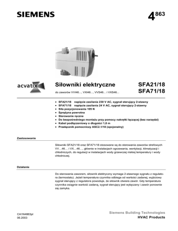 4 863 Siłowniki elektryczne do zaworów VVI46..., VXI46..., VVS46... i VXS46... • • • • • • • • SFA21/18 SFA71/18 SFA21/18 napięcie zasilania 230 V AC, sygnał sterujący 2-stawny SFA71/18 napięcie zasilania 24 V AC, sygnał sterujący 2-stawny Siła pozycjonowania 105 N Sprężyna powrotna Sterowanie ręczne Do bezpośredniego montażu przy pomocy nakrętki łączącej (bez narzędzi) Kabel podłączeniowy o długości 1,8 m Przełącznik pomocniczy ASC2.1/18 (opcjonalny) Zastosowanie Siłowniki SFA21/18 oraz SFA71/18 stosowane są do sterowania zaworów strefowych VV…46… i VX…46…, głównie w instalacjach ogrzewania, wentylacji, klimatyzacji i chłodniczych, do regulacji w instalacjach wody grzewczej niskiej temperatury i wody chłodniczej. Działanie Do sterowania zaworem, siłownik elektryczny wymaga 2-stawnego sygnału z regulatora (termostatu). Jeżeli temperatura czynnika odbiega od wartości zadanej, wyjściowy sygnał sterujący z regulatora powoduje, że siłownik otwiera zawór. Gdy temperatura czynnika osiągnie wartość zadaną, sygnał sterujący jest wyłączany i zawór ponownie się zamyka. CA1N4863pl 06.2003 Siemens Building Technologies HVAC Products Zestawienie typów Typ Wyposażenie dodatkowe Napięcie zasilania Czas przebiegu Sygnał sterujący Kabel podłączeniowy SFA21/18 230 V AC 40 s 2-stawny 1,8 m SFA71/18 24 V AC Punkt przełączania Obciążalność Kabel podłączeniowy 250 V AC / 3(2) A 1,8 m Typ ASC2.1/18 Zamawianie Opis Przełącznik pomocniczy rozwarty/zwarty Przy ok. 50% skoku siłownika Przy zamówieniu należy podać ilość, opis i oznaczenie typu urządzenia. Przykład: Dostawa 2 siłowniki elektryczne SFA71/18 i 2 przełączniki pomocnicze ASC2.1/18 Siłowniki, zawory i wyposażenie dodatkowe dostarczane są oddzielnie. Urządzenia współpracujące Zawory strefowe VVI46... z przyłączami z gwintem wewnętrznym VVS46... z przyłączami do lutowania Typ zaworu Rodzaj VVI46.15, VVS46.15 Zawory 2-drogowe VVI46.20, VVS46.20 Klasa PN Karta katalogowa 2,0 PN16 N4842 3,5 VVI46.25, VVS46.25 VXI46.15, VXS46.15 kvs [m3/h] 5,0 Zawory 3-drogowe 2,0 VXI46.20, VXS46.20 3,5 VXI46.25, VXS46.25 5,0 Budowa Zawór otwierany jest elektrycznie, przez siłownik, a zamykany przez sprężynę powrotną. Siłownik posiada elektryczny silnik synchroniczny, przekładnię mechaniczną oraz sprężynę powrotną. Silnik siłownika zabezpieczony jest przed przeciążeniem i zablokowaniem, aby możliwe było jego ciągłe działanie. Skok maksymalny ograniczony jest mechanicznie. Ruch powrotny odbywa się bez udziału mechanizmu przekładni. Zabezpiecza to przekładnię siłownika przed udarami mechanicznymi i zwiększa jej trwałość. Siłownik wyposażony jest fabrycznie w kabel przyłączeniowy o długości 1,8 m. Wyposażenie dodatkowe Przełącznik pomocniczy ASC2.1/18 Opcjonalny przełącznik pomocniczy montuje się na siłowniku za pomocą dwóch wkrętów. Styk przełącza się przy około 50 % skoku siłownika. • Siłownik nie zasilony: → Styk przełącznika rozwarty • Siłownik zasilony: → Styk przełącznika zwarty (50...100 % skoku) • Zablokowane pokrętło sterowania ręcznego (ok. 90 % skoku): → Styk przełącznika zwarty 01468 Szczegółowe dane przełącznika pomocniczego – patrz „Dane techniczne” 2/6 Siemens Building Technologies HVAC Products Siłowniki elektryczne SFA... CA1N4863pl 06.2003 Wskazówki Projektowanie Należy przestrzegać dopuszczalnych temperatur (patrz „Dane techniczne”). Połączenie elektryczne • Siłowniki mogą być sterowane wyłącznie napięciem przemiennym (230 V AC dla SFA21/18 oraz 24 V AC dla SFA71/18). • Nie można stosować sygnału z odcięciem fazy, ani sygnału PWM. • Zalecana liczba otwarć/zamknięć: około 50 na dzień, z 200-ma dniami ogrzewania lub chłodzenia Uwaga Montaż Pozycja Instrukcja montażu wydrukowana jest na opakowaniu. 85° 85° Uruchomienie • Sprawdzić okablowanie • Sprawdzić działanie siłownika i przełącznika pomocniczego (jeśli jest zamontowany). Obsługa Zawór może być otwierany ręcznie przy pomocy dźwigni na siłowniku. Dźwignia posiada blokadę dla pozycji, przy której zawór jest otwarty w około 90 %. Po wznowieniu sterowania elektrycznego mechanizm blokujący jest automatycznie wyłączany. Sterowanie ręczne Ręczne otwieranie zaworu Zablokowanie dźwigni w pozycji, w której zawór jest otwarty w ok. 90 % 01600 01602 Ręczne zwolnienie dźwigni 01601 Obrócić dźwignię aż do mechanicznego ogranicznika, po czym zwolnić Konserwacja • Siłowniki są urządzeniami bezobsługowymi. • W przypadku awarii, siłownik można wymienić bez demontażu zaworu. Podczas wymiany siłownika należy wyłączyć napięcie zasilania. • Siłowniki nie podlegają naprawie. 3/6 Siemens Building Technologies HVAC Products Siłowniki elektryczne SFA... CA1N4863pl 06.2003 Złomowanie Elektryczne i elektroniczne elementy wchodzące w skład urządzenia należy złomować w odpowiedni sposób. Należy przestrzegać lokalnych przepisów. Gwarancja Podane dane techniczne obowiązują wyłącznie, gdy siłowniki stosowane są wraz z zaworami wymienionymi w punkcie „Urządzenia współpracujące”. Stosowanie siłowników SFA... z zaworami innych producentów powoduje utratę gwarancji Siemens Building Technologies / HVAC Products. Dane techniczne Zasilanie Napięcie zasilania Tolerancja napięcia SFA21/18 SFA71/18 230 V AC –15 / +10 % 24 V AC –15 / +10 % Częstotliwość 50 Hz Maksymalny pobór mocy Bezpiecznik Sterowanie Sygnał sterujący Maks. liczba otwarć/zamknięć Dane funkcjonalne Pozycja przy nie zasilonym siłowniku Zawór 2-drogowy (VVI46…) Zawór 3-drogowy (VXVI46…) 9,8 VA maks. 3 A (zewnętrzny) 2-stawny (zał/wył) z regulatora nie może być to ani sygnał z odcięciem ani PWM zalecane: około 10 000 na rok (odpowiada ok. 50 na dzień) A → AB zamknięte AB → A zamknięte Czas przebiegu 30 ... 50 s (otwieranie si