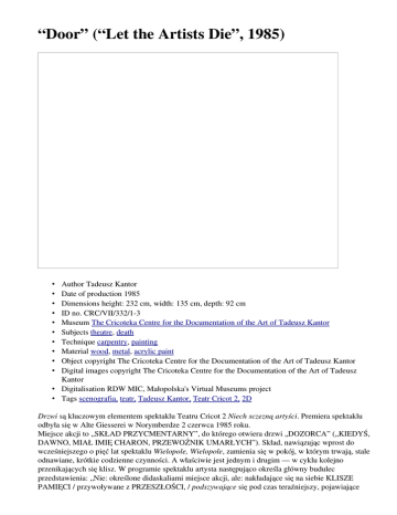 “Door” (“Let the Artists Die”, 1985) Author Tadeusz Kantor Date of production 1985 Dimensions height: 232 cm, width: 135 cm, depth: 92 cm ID no. CRC/VII/332/13 Museum The Cricoteka Centre for the Documentation of the Art of Tadeusz Kantor Subjects theatre, death Technique carpentry, painting Material wood, metal, acrylic paint Object copyright The Cricoteka Centre for the Documentation of the Art of Tadeusz Kantor Digital images copyright The Cricoteka Centre for the Documentation of the Art of Tadeusz Kantor • Digitalisation RDW MIC, Małopolska's Virtual Museums project • Tags scenografia, teatr, Tadeusz Kantor, Teatr Cricot 2, 2D • • • • • • • • • • Drzwi są kluczowym elementem spektaklu Teatru Cricot 2 Niech sczezną artyści. Premiera spektaklu odbyła się w Alte Giesserei w Norymberdze 2 czerwca 1985 roku. Miejsce akcji to „SKŁAD PRZYCMENTARNY”, do którego otwiera drzwi „DOZORCA” („KIEDYŚ, DAWNO, MIAŁ IMIĘ CHARON, PRZEWOŹNIK UMARŁYCH”). Skład, nawiązując wprost do wcześniejszego o pięć lat spektaklu Wielopole, Wielopole, zamienia się w pokój, w którym trwają, stale odnawiane, krótkie codzienne czynności. A właściwie jest jednym i drugim — w cyklu kolejno przenikających się klisz. W programie spektaklu artysta następująco określa główny budulec przedstawienia: „Nie: określone didaskaliami miejsce akcji, ale: nakładające się na siebie KLISZE PAMIĘCI / przywoływane z PRZESZŁOŚCI, / podszywające się pod czas teraźniejszy, pojawiające się ni stąd, ni zowąd, mieszające przedmioty, ludzi, sytuacje... i w tym szalonym procederze gubiące wszelką obowiązującą w życiu logikę (...)”[1]. Konstrukcja klisz związana jest z postacią Tadeusza Kantora, który wprowadza siebie samego do spisu „osób dramatu” w kilku wymiarach. Po pierwsze, „JA Postać realna, główny sprawca wszystkiego TADEUSZ KANTOR”, odnosi się do postaci artysty obecnej na scenie w trakcie spektaklu w charakterze czynnego obserwatora, podejmującego się stosownych korekt. Zasiadał przeważnie na krześle z boku sceny. W rzadkich momentach, kiedy nie mógł być obecny w trakcie pokazu, głównie z powodu choroby, na jego krześle zawieszano tabliczkę z napisem: „Kantor”. Aktorzy grając, zwracali się ku niemu. Po drugie, pojawia się na scenie jako mały chłopczyk: „JA — GDY MIAŁEM 6 LAT” — w kliszach wspomnienia dzieciństwa. W kolejnej sferze dochodzi do konfrontacji przeszłości z przyszłością. Kantor przedstawia bowiem siebie jako umierającego (bezpośrednią inspiracją była powieść Zbigniewa Uniłowskiego Wspólny pokój, w której czytelnik jest świadkiem umierania bohatera utworu). Artysta chciał, aby umieranie stało się tematem Niech sczezną artyści, aby „było 'Spoiwem' łączącym różne objawy życia, niemal, aby się stało s t r u k t u r ą spektaklu”[2]. W spektaklu Niech sczezną artyści w przywoływaniu przez artystę na scenie przeszłości i projekcji ogromną rolę odgrywały drzwi. Wykonane były z postarzonego drewna, w estetyce „realności najniższej rangi”, charakterystycznej dla całego spektaklu. Znajdowały się pośrodku ściany z czarnego płótna, wyznaczającej trapez sceny. Drzwi powstały z szafy, w której pierwotnie miał mieścić się Ołtarz Mariacki. Pierwotnie ołtarz — projektowany przez Kantora jako wyraz polemiki z dziełem Wita Stwosza z bazyliki Mariackiej — miał się znajdować w szafie. Podczas pracy nad spektaklem drewniane podpórki i konstrukcje, które miały utrzymywać pozy świętych w Ołtarzu, przekształciły się w średniowieczne pręgierze i zostały przeniesione z szafy na scenę. Ołtarz w szafie miał być zbudowany tak, aby sprowadzić patetyczne pojęcie ołtarza do realności życia codziennego (początkowo Wit Stwosz przedstawiony był jako zwykły rzemieślnik, piłujący piłą elementy ołtarza). Z owej szafy powstały ostatecznie — kluczowy obiekt w spektaklu Niech sczezną artyści. Przez drzwi przechodziły wszystkie postaci wraz z obiektami — w jedną i drugą stronę. Ich rolę (podobnie jak drzwi w spektaklu Wielopole, Wielopole) można by przyrównać do funkcji ławek szkolnych w Umarłej klasie : „Były jakby łożyskiem (matrice), z którego rodziło się coś nowego, niespodziewanego, coś, co na pewien czas usiłowało wyjść poza ławki, w tę czarną i pustą przestrzeń, i co za każdym razem wracało i cofało się do nich, jak do macierzystego domu...”[3]. Wraz z cyklicznym otwieraniem / zamykaniem drzwi, pojawiały się nowe sceny lub powracały znane nam już postacie i sytuacje, mieszały z sobą kolejne klisze i obszary. Przekraczanie progu drzwi związane było ze zmianą statusu, wprowadzało odmienną jakość. Pojęcie „Biednego Pokoiku Wyobraźni” krystalizuje się już w spektaklu Niech sczezną artyści Teatru Cricot 2 (1985 rok), gdzie miejsce akcji zostało zdefiniowane przez artystę jako pogranicze rejonów snu, infernum, świata umarłych, wieczności i dnia dzisiejszego. Idea zapoczątkowana została w spektaklu Wielopole, Wielopole, gdzie artysta zrekonstruował na scenie swój „Pokój Dzieciństwa” (zobacz: Okno ze spektaklu Wielopole, Wielopole ). Kantor łączył tę ideę ze swoim pokojem — pracownią przy ul. Siennej 7/5, gdzie tworzył od 1987 roku. Elaborated by Małgorzata PaluchCybulska (The Cricoteka Centre for the Documentation of the Art of Tadeusz Kantor), © all rights reserved [1] T. Kantor, Klisze, [in:] T. Kantor, Pisma, Vol. III: Dalej już nic... Teksty z lat 1985–1990, elab. K. Pleśniarowicz, Wrocław–Kraków 2004–2005, p. 24; [2] T. Kantor, Sfera śmierci, [in:] T. Kantor, Pisma, Vol. III: Dalej już nic... Teksty z lat 1985–1990, elab. K. Pleśniarowicz, Wrocław–Kraków 2004–2005, p. 12; [3] T. Kantor, Ławki w „Umarłej klasie”, [in:] T. Kantor, Pisma. Vol. 2: Teatr Śmierci. Teksty z lat 1975 1984, elab. K