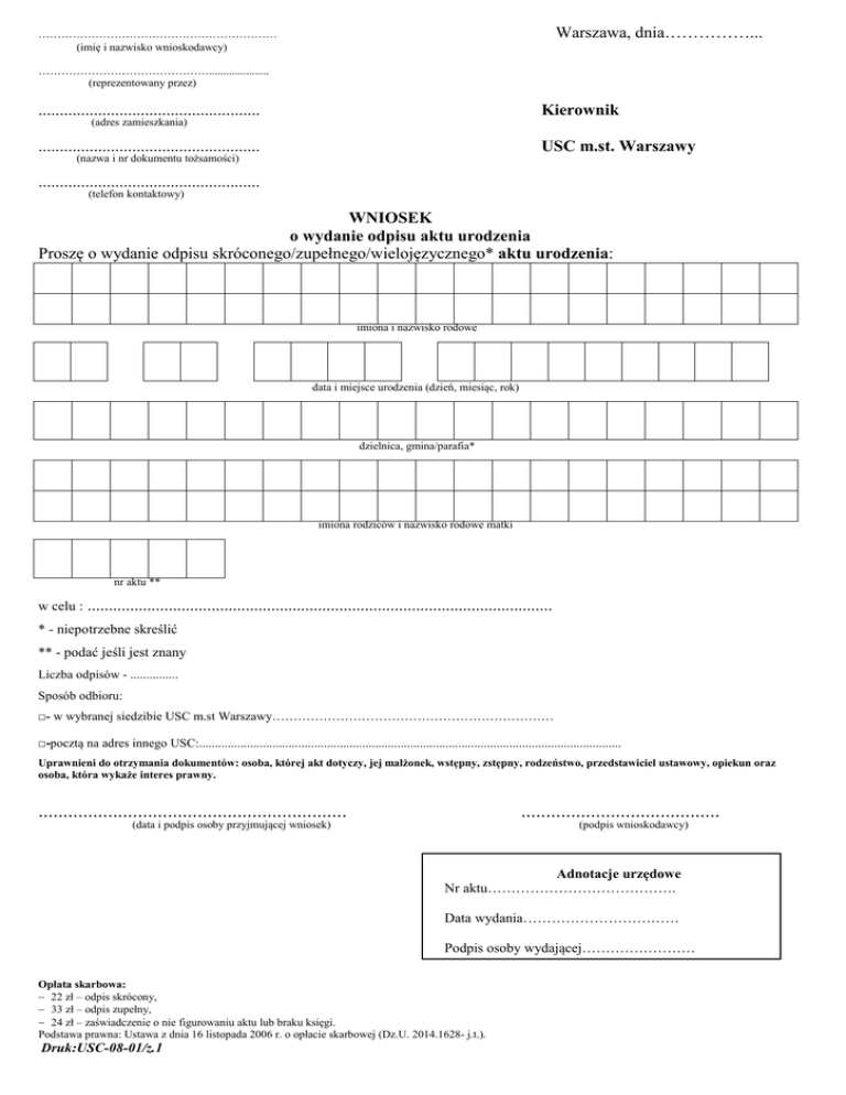 Warszawa, dnia……………... ……………………………………………………… (imię i nazwisko wnioskodawcy) ………………………………………..................... (reprezentowany przez) .................................................... Kierownik (adres zamieszkania) .................................................... USC m.st. Warszawy (nazwa i nr dokumentu tożsamości) .................................................... (telefon kontaktowy) WNIOSEK o wydanie odpisu aktu urodzenia Proszę o wydanie odpisu skróconego/zupełnego/wielojęzycznego* aktu urodzenia: imiona i nazwisko rodowe data i miejsce urodzenia (dzień, miesiąc, rok) dzielnica, gmina/parafia* imiona rodziców i nazwisko rodowe matki nr aktu ** w celu : ............................................................................................................. * - niepotrzebne skreślić ** - podać jeśli jest znany Liczba odpisów - ............... Sposób odbioru: □- w wybranej siedzibie USC m.st Warszawy………………………………………………………… □-pocztą na adres innego USC:.................................................................................................................................... Uprawnieni do otrzymania dokumentów: osoba, której akt dotyczy, jej małżonek, wstępny, zstępny, rodzeństwo, przedstawiciel ustawowy, opiekun oraz osoba, która wykaże interes prawny. .............................................................. ........................................ (data i podpis osoby przyjmującej wniosek) (podpis wnioskodawcy) Adnotacje urzędowe Nr aktu…………………………………. Data wydania…………………………… Podpis osoby wydającej…………………… Opłata skarbowa: − 22 zł – odpis skrócony, − 33 zł – odpis zupełny, − 24 zł – zaświadczenie o nie figurowaniu aktu lub braku księgi. Podstawa prawna: Ustawa z dnia 16 listopada 2006 r. o opłacie skarbowej (Dz.U. 2014.1628- j.t.). Druk:USC-08-01/z.1