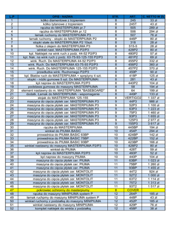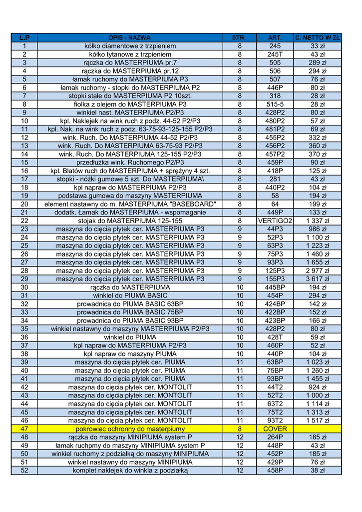 L.P 1 2 3 4 5 6 7 8 9 10 11 12 13 14 15 16 17 18 19 20 21 22 23 24 25 26 27 28 29 30 31 32 33 34 35 36 37 38 39 40 41 42 43 44 45 46 47 48 49 50 51 52 OPIS - NAZWA STR. ART. C. NETTO W ZŁ kółko diamentowe z trzpieniem kółko tytanowe z trzpieniem rączka do MASTERPIUMA pr.7 rączka do MASTERPIUMA pr.12 łamak ruchomy do MASTERPIUMA P3 łamak ruchomy - stopki do MASTERPIUMA P2 stopki stałe do MASTERPIUMA P2 10szt. fiolka z olejem do MASTERPIUMA P3 winkiel nast. MASTERPIUMA P2/P3 kpl. Naklejek na wink ruch z podz. 44-52 P2/P3 kpl. Nak. na wink ruch z podz. 63-75-93-125-155 P2/P3 wink. Ruch. Do MASTERPIUMA 44-52 P2/P3 wink. Ruch. Do MASTERPIUMA 63-75-93 P2/P3 wink. Ruch. Do MASTERPIUMA 125-155 P2/P3 przedłużka wink. Ruchomego P2/P3 kpl. Blatów ruch do MASTERPIUMA + sprężyny 4 szt. stopki - nóżki gumowe 5 szt. Do MASTERPIUMA\ kpl napraw do MASTERPIUMA P2/P3 podstawa gumowa do maszyny MASTERPIUMA element nastawny do m. MASTERPIUMA "BASEBOARD" dodatk. Łamak do MASTERPIUMA - wspomaganie stojak do MASTERPIUMA 125-155 maszyna do cięcia płytek cer. MASTERPIUMA P3 maszyna do cięcia płytek cer. MASTERPIUMA P3 maszyna do cięcia płytek cer. MASTERPIUMA P3 maszyna do cięcia płytek cer. MASTERPIUMA P3 maszyna do cięcia płytek cer. MASTERPIUMA P3 maszyna do cięcia płytek cer. MASTERPIUMA P3 maszyna do cięcia płytek cer. MASTERPIUMA P3 rączka do MASTERPIUMA winkiel do PIUMA BASIC prowadnica do PIUMA BASIC 63BP prowadnica do PIUMA BASIC 75BP prowadnica do PIUMA BASIC 93BP winkiel nastawny do maszyny MASTERPIUMA P2/P3 winkiel do PIUMA kpl napraw do MASTERPIUMA P2/P3 kpl napraw do maszyny PIUMA maszyna do cięcia płytek cer. PIUMA maszyna do cięcia płytek cer. PIUMA maszyna do cięcia płytek cer. PIUMA maszyna do cięcia płytek cer. MONTOLIT maszyna do cięcia płytek cer. MONTOLIT maszyna do cięcia płytek cer. MONTOLIT maszyna do cięcia płytek cer. MONTOLIT maszyna do cięcia płytek cer. MONTOLIT pokrowiec ochronny do masterpiumy rączka do maszyny MINIPIUMA system P łamak ruchpmy do maszyny MINIPIUMA system P winkiel ruchomy z podziałką do maszyny MINIPIUMA winkiel nastawny do maszyny MINIPIUMA komplet naklejek do winkla z podziałką 8 8 8 8 8 8 8 8 8 8 8 8 8 8 8 8 8 8 8 8 8 8 9 9 9 9 9 9 9 10 10 10 10 10 10 10 10 10 11 11 11 11 11 11 11 11 8 12 12 12 12 12 245 245T 505 506 507 446P 318 515-5 428P2 480P2 481P2 455P2 456P2 457P2 459P 418P 281 440P2 58 64 449P VERTIGO2 44P3 52P3 63P3 75P3 93P3 125P3 155P3 445BP 454P 424BP 422BP 423BP 428P2 428T 460P 440P 63BP 75BP 93BP 44T2 52T2 63T2 75T2 93T2 COVER 264P 448P 452P 429P 458P 33 zł 43 zł 289 zł 294 zł 76 zł 80 zł 28 zł 28 zł 80 zł 57 zł 69 zł 332 zł 360 zł 370 zł 90 zł 125 zł 43 zł 104 zł 194 zł 199 zł 133 zł 1 337 zł 986 zł 1 100 zł 1 223 zł 1 460 zł 1 655 zł 2 977 zł 3 617 zł 194 zł 294 zł 142 zł 152 zł 166 zł 80 zł 59 zł 52 zł 104 zł 1 023 zł 1 260 zł 1 455 zł 924 zł 1 000 zł 1 114 zł 1 313 zł 1 517 zł 185 zł 43 zł 185 zł 76 zł 38 zł 53 54 55 56 57 58 59 60 61 62 63 64 65 66 67 68 69 70 71 72 73 74 75 76 77 78 79 80 81 82 83 84 85 86 87 88 89 90 91 92 93 94 95 96 97 98 99 100 101 102 103 104 105 komplet blatów ruchomych do maszyny MINIPIUMA kpl stopek gumowych 5szt. Do maszyny MINIPIUMA rączka do maszyny MINIPIUMA system T stopki do rączki MINIPIUMA komplet 10szt. winkiel ruchomy do maszyny MINIPIUMA system T kpl naklejek do winkla do maszyny MINIPIUMA sys. T maszyna do cięcia płytek MINIPIUMA maszyna do cięcia płytek MINIPIUMA + pudełko maszyna do cięcia płytek MINIPIUMA maszyna do cięcia płytek MINIPIUMA + pudełko maszyna do cięcia płytek MINIPIUMA maszyna do cięcia płytek MINIPIUMA + pudełko maszyna do cięcia płytek MINIPIUMA maszyna do cięcia płytek MINIPIUMA + pudełko rączka do maszyny MONTOLIT 24 rączka do maszyny MONTOLIT 26-26A-43-43A rączka do maszyny MONTOLIT 26A2-43A2 kpl blatów ruch. do m. MONTOLIT 26A-26A2-43A-43A2 stopki gumowe do maszyny MINIMONTOLIT 5szt. kółko do maszyny SL rączka do maszyny SL łamak ruchomy do masz. SL amak ruchomy do maszyny SL kpl blatów do maszyny SL przedłużka winkla do maszyny SL przedłużka winkla do maszyny SL53 - SL63 winkiel nastawny do maszyny SL maszyna do cięcia płytek cer maszyna do cięcia płytek cer maszyna do cięcia płytek cer maszyna do cięcia płytek ceramicznych SMART maszyna do cięcia płytek ceramicznych SMART maszyna do cięcia płytek ceramicznych SMART maszyna do cięcia płytek ceramicznych SMART kółko diamentowe do maszyny 21-22-25-27-28-29 kółko diamentowe do maszyny MASTERMONTOLIT kółko tytanowe do maszyny MASTERMONTOLIT winkiel nastawny do maszyny 46 winkiel nastawny do maszyny art. 31 winkiel nastawny do maszyny art. 34 winkiel nastawny do maszyny art. 47-49-92 wink.nast.do maszyny MASTERMONTOLIT art.47M i 92 rączka - pochwyt stalowy do maszyny 31 rączka - pochwyt stalowy do maszyny 34 rączka - pochwyt stalowy do maszyny 27-29 rączka z rolkami do maszyny art. 28 rączka z rolkami do maszyny art. 34, 46, 47, 92, 121 przedłużka do art. 392 przedłużka do art. 392 komplet łamaków do maszyny art. 31 kopia łamaków do maszyny art. 34 kopia łamaków do maszyny 47M-92-121 komplet łamaków do maszyny 46 winkiel nastawny do maszyny art. 31, 34, 46 12 12 12 12 12 12 13 13 13 13 13 13 13 13 14 14 14 14 14 14 14 14 14 14 14 14 15 15 15 15 15 15 15 16 16 16 16 16 16 16 16 16 16 16 16 16 16 16 16 16 16 16 16 280P 277P 264T 318 452T 458T 26P 26PBox 43P 43PBox 26T 26TBox 43T 43TBox 259 264 264B 280 277 SL01 SL02 SL03 SL04 SL05 SL06 SL07 24 26A2 43A2 SL33 SL43 SL53 SL63 240 241 241T 252D 253D 254D 257D 257M 261 261R 262R 393 391 392 390 331 332 333 334 326 104 zł 38 zł 181 zł 33 zł 185 zł 38 zł 617 zł 721 zł 756 zł 858 zł 569 zł 692 zł 706 zł 844 zł 81 zł 108 zł 128 zł 85 zł 24 zł 24 zł 109 zł 28 zł 71 zł 38 zł 47 zł 76 zł 171 zł 327 zł 487 zł 683 zł 721 zł 782 zł 806 zł 21 zł 25 zł 36 zł 247 zł 185 zł 228 zł 303 zł 247 
