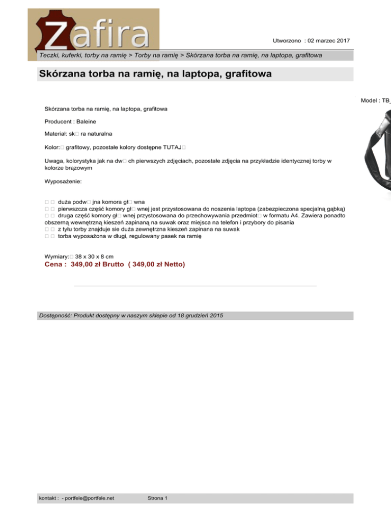 Utworzono : 02 marzec 2017 Teczki, kuferki, torby na ramię > Torby na ramię > Skórzana torba na ramię, na laptopa, grafitowa Skórzana torba na ramię, na laptopa, grafitowa Model : TB_ Skórzana torba na ramię, na laptopa, grafitowa Producent : Baleine Materiał: sk�ra naturalna Kolor:�grafitowy, pozostałe kolory dostępne TUTAJ� Uwaga, kolorystyka jak na dw�ch pierwszych zdjęciach, pozostałe zdjęcia na przykładzie identycznej torby w kolorze brązowym Wyposażenie: � duża podw�jna komora gł�wna � pierwszcza część komory gł�wnej jest przystosowana do noszenia laptopa (zabezpieczona specjalną gąbką) � druga część komory gł�wnej przystosowana do przechowywania przedmiot�w formatu A4. Zawiera ponadto obszerną wewnętrzną kieszeń zapinaną na suwak oraz miejsca na telefon i przybory do pisania � z tyłu torby znajduje sie duża zewnętrzna kieszeń zapinana na suwak � torba wyposażona w długi, regulowany pasek na ramię Wymiary:�38 x 30 x 8 cm Cena : 349,00 zł Brutto ( 349,00 zł Netto) Dostępność: Produkt dostępny w naszym sklepie od 18 grudzień 2015 kontakt : - [email protected] Strona 1