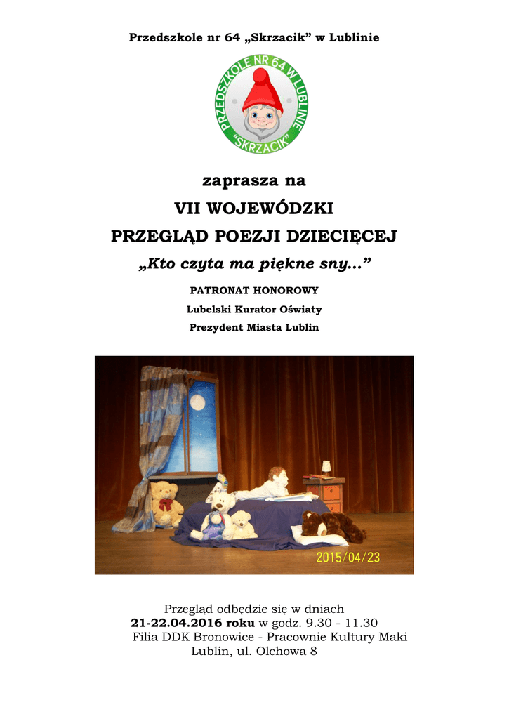 Przedszkole nr 64 „Skrzacik” w Lublinie zaprasza na VII WOJEWÓDZKI PRZEGLĄD POEZJI DZIECIĘCEJ „Kto czyta ma piękne sny…” PATRONAT HONOROWY Lubelski Kurator Oświaty Prezydent Miasta Lublin Przegląd odbędzie się w dniach 21-22.04.2016 roku w godz. 9.30 - 11.30 Filia DDK Bronowice - Pracownie Kultury Maki Lublin, ul. Olchowa 8 VII WOJEWÓDZKI PRZEGLĄD POEZJI DZIECIĘCEJ „Kto czyta ma piękne sny…” Regulamin CELE PRZEGLĄDU: popularyzacja i rozbudzanie u dzieci zainteresowań poezją; promocja kultury języka polskiego; promowanie artystycznych umiejętności dzieci oraz ich wkładu w rozwój kultury; integracja społeczności lokalnej i regionalnej I . ZAŁOŻENIA OGÓLNE 1) 2) 3) 4) 5) W Przeglądzie mogą uczestniczyć dzieci z publicznych przedszkoli oraz oddziałów przedszkolnych przy szkołach podstawowych z terenu miasta Lublina oraz województwa lubelskiego. Warunkiem udziału jest przygotowanie repertuaru z zakresu poezji dziecięcej – wiersza. Każda placówka może zgłosić do udziału w Przeglądzie maksymalnie 2 dzieci i zaprezentować 2 utwory. Przygotowuje je maksymalnie 2 nauczycieli. Uczestnicy prezentują utwory, których łączny czas wykonania nie może przekroczyć 5 minut. VII Przegląd Poezji Dziecięcej – Kto czyta ma piękne sny… odbędzie się w dniach 21-22.04.2016 roku w godzinach 9.30 – 11.30 w filii DDK Bronowice – Pracownie Kultury Maki, Lublin, ul. Olchowa 8. II. WARUNKI UCZESTNICTWA 1) Zgłoszenia będą przyjmowane od dnia 1.03.2016r. do dnia 11.03.2016 wyłącznie telefonicznie pod nr tel. 669 19 22 35 w godz. 8 - 12. 2) Do Przeglądu zostanie zakwalifikowanych pierwszych 20 zgłoszonych przedszkoli. 3) Po zebraniu zgłoszeń zakwalifikowane przedszkola otrzymają kartę zgłoszenia oraz druk oświadczenia drogą elektroniczną. 4) Wypełnione karty zgłoszenia wraz z podpisanym przez rodziców oświadczeniem należy dostarczyć do organizatora w terminie do dnia 31.03.2016 roku. 5) Karta powinna być wypełniona DRUKOWANYMI LITERAMI, a wszystkie dane powinny być aktualne. Należy podać pełne brzmienie tytułu utworu oraz imię i nazwisko autora. 6) Organizatorzy zastrzegają sobie ewentualną zmianę szczegółów regulaminu. III. INFORMACJE DODATKOWE 1) Organizatorzy na czas trwania Przeglądu oddają do dyspozycji uczestników sprzęt techniczny i nagłośnieniowy, którym dysponuje Dom Kultury. 2) Organizatorzy nie zapewniają posiłków i napoi. 3) Organizatorzy przewidują dyplomy i symboliczne upominki dla uczestników. Wręczenie nastąpi każdego dnia po zakończeniu wszystkich prezentacji. IV. USTALENIA KOŃCOWE 1) O kolejności prezentacji decydują wyłącznie organizatorzy. 2) Występy uczestników mogą być za zgodą organizatorów, lecz bez odpłatności dla uczestników Przeglądu: a) transmitowane przez rozgłośnie radiowe i TV; b) rejestrowane, nagrywane i filmowane, a następnie rozpowszechniane przez rozgłośnie radiowe i TV lub film w celach nie komercyjnych; c) fotografowane dla celów prasowych i archiwalnych. 3) Sprawy nie ujęte regulaminem rozstrzygają organizatorzy. Kontakt, zgłoszenia, informacje w godz: 8.00-12.00 : Ewa Hrycyszyn, Dorota Pawlak – 669 19 20 35