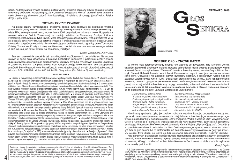 nania. Andrzej Manda wyraża nadzieję, że ten ważny i świetnie napisany artykuł zostanie też opublikowany po polsku. Przypomnijmy, że w „National Geographic Polska” grudzień 2002 ukazał się szkic obejmujący skrótowo całość historii polskiego himalaizmu zimowego (Józef Nyka: Polskie drogi – góry Azji). CZERWIEC 2008 POPRAWKI DO „TATR POLSKICH” Na progu sezonu turystycznego, chciałbym zgłosić dwie poprawki do ostatniego wydania przewodnika „Tatry Polskie” Józefa Nyki. Na skraju Wielkiej Polany w Dolinie Małej Łąki nie ma już wiaty TPN, zniknęły nawet ławki, jednak latem 2007 przywieziono traktorem nowe. Rozpadła się również wiata w Dolinie Tomanowej na rozstaju szlaków na Tomanową Przełęcz i Chudą Przełączkę, zachowała się tylko ławka. Może ktoś pomyśli o odbudowaniu tych przydatnych w razie deszczu schronień? Bawiąc ostatnio w rejonie Tomanowej z zainteresowaniem obserwowałem słowackich turystów, swobodnie i licznie wędrujących grzbietem wzdłuż granicy przez Tomanową Polską, Tomanową Przełęcz i dalej na Ciemniak, chociaż nie ma tam wyznakowanego szlaku. A dziś nie ma już nawet szlaku na Tomanową Przełęcz. Leszek Zakrzewski, Nowy Sącz Ten sam przewodnik uzupełnia też nasz długoletni współpracownik, Jerzy Mikulec: Na wspomnianym w opisie drogi dojazdowej z Krakowa beskidzkim Lubomirze 5 października 2007 otwarto duże murowane obserwatorium astronomiczne. Ciekawy artykuł o tym nowym obiekcie ukazał się w „Dzienniku Polskim” z 6 października. Piotr Konopka podaje nowe „namiary” swej zakopiańskiej placówki: Biuro Przewodnickie Piotra Konopki www.k2.zakopane.pl; e-mail: [email protected]; tel.kom. 0-601-207-659; tel./fax 018 20 14261. Stary adres (Do Bristolu 6) jest nieaktualny. MISCELLANEA 16 maja w zakopiañskiej „Jutrzence” odby³ siê wernisa¿ wystawy miniatur tkackich Ewy Bartosz-Mazuœ. W latach 70. autorka nale¿a³a do czo³owych taterniczek jaskiniowych, uczestniczy³a w wyprawach do pionowych jaskiñ tatrzañskich a tak¿e do jaskiñ w Alpach i Grecji. Na wernisa¿u nie brakowa³o wiêc taterników i groto³azów. (Apoloniusz Rajwa) ● 3 czerwca strona <8000ers.com> Eberharda Jurgalskiego kieruje urodzinowe ¿yczenia do Hannsa Schella z okazji jego siedemdziesi¹tki. Eberhard wylicza 8-tysiêczniki Jubilata a tak¿e pierwsze wejœcia, m.in. na Akher Chaq w r. 1966 i na Malubiting w 1971. ● Jak donosi portal <kwtorun.pl>, weteran (choæ jeszcze nie senior) Ludwik Wilczyñski zainaugurowa³ sezon, powtarzaj¹c w stylu RP piêkn¹ wytrzyma³oœciow¹ drogê Lipczyñskiej VI.2+ w Dolinie Bêdkowskiej. ● 7 czerwca na najwy¿szy szczyt Grenlandii (a zarazem ca³ej Arktyki) Gunnbjorns Fjeld (3694 m) wszed³ polski zespó³ w sk³adzie Leszek Cichy (57), Marek Kamiñski (44), Tomasz Walkiewicz (25), Miros³aw Polowiec (42) i Ryszard Rusinek (48). W maju 2004 na szczycie tym by³a ju¿ Polka, Marzena Kaczmarska, uczestniczka naukowej wyprawy norweskiej. ● Piotr Wyrwa zawiadamia nas, ¿e w po³owie czerwca zmar³ w Tarnowie Edward Walusiak, absolwent warszawskiej AWF, wychowanek górski Czes³awa Momatiuka, wyszkolony na bielañskich dêbach, m.in. uczestnik I zimowego przejœcia pó³nocnej œciany Œwistówki. Spocz¹³ 19 czerwca na cmentarzu w Tarnowie-Moœcicach. ● 25 czerwca dwaj Piotrowie – Piotr Morawski i Peter Hámor – weszli na Gasherbrum I. Wspinali siê drog¹ hiszpañsk¹, która w górze ³¹czy siê z drog¹ amerykañsk¹. Planuj¹ oni trawers Gasherbrumów I–III. ● Anna Czerwiñska przy ró¿nych okazjach spotyka siê ze swymi sympatykami, by zachêcaæ ich do czytania ksi¹¿ki „GórFanka. Moje górskie ABC w skale i lodzie.” Prelekcje urozmaica zwykle film Darka Za³uskiego „Przypadki Pani Ani”. ● Jak podaje Apoloniusz Rajwa w „Tygodniku Podhalañskim” nr 23, Dariusz Chrobak z Nowego Targu dokona³ na spadolocie (tzw. paralotni) przelotu nad Tatrami „po trójk¹cie”. Przeby³ dystans 89 km, przekraczaj¹c pu³ap 3000 m, w powietrzu utrzyma³ siê przez 4 godziny. ● Kolegów korzystaj¹cych z dobrodziejstw internetu zachêcamy do odwiedzania strony <pza.org.pl>, na której znajd¹ sporo polskich aktualnoœci, m.in. autorstwa Janusza Kurczaba. Tworzony jest te¿ tam elektroniczny biuletyn kwartalny pt. „Co s³ychaæ w PZA?” (nie myliæ z zas³u¿onym „Co s³ychaæ” w PTT) – na razie niestety otwieraj¹cy siê z komplikacjami. ● Baskijska „Pyrenaica” 1/2008 przynosi œwietnie udokumentowan¹ monografiê ma³o znanego pasma Cordillera Huaytapallana w Andach Peruwiañskich (najwy¿szy szczyt 5572 m). Autorem jest czo³owy znawca i historyk eksploracji Andów, Evelio Echevarría. Ma on 82 lata a mimo to co sezon wyrusza w wysokie góry, nierzadko samotnie, gdy¿ w tym wieku trudno o chêtnych partnerów. ● 4 Redakcja i teksty (z wyjątkiem osobno sygnowanych): Józef Nyka, ul. Klaudyny 12 m 79; 01-684 Warszawa. Tel. [48] 22-833-07-75; e-mail <[email protected]>. P.T. Seniorzy proszeni są o współpracę. „Głos Seniora” nie czerpie materiałów z krajowych czasopism górskich ani z bliskich tematycznie polskich stron internetowych. Pisemko rozprowadzane jest bezpłatnie, numer bieżący można pobrać do druku z adresu internetowego <www.nyka. home.pl/pub/gs200806.pdf>; ostatnie numery są dostępne w internecie na stronie: <www.nyka.home.pl>. Bogdan Krauze (1985) MORSKIE OKO – ZNOWU RAZEM W końcu maja taternicy-seniorzy spotkali się, zgodnie ze zwyczajem, nad Morskim Okiem, wszakże zapowiedź obchodów stulecia nowego schroniska i ładna pogoda przyciągnęły więcej uczestników niż to zwykle bywa. Większość dotarła z Palenicy szosą, ale niektórzy – Michał Burczyk, Staszek Kuliński, Leszek Łącki i Jacek Karwowski – przyszli przez jeszcze mocno zaśnieżone góry. Oczywiście nie zabrakło stałych bywalców spotkań, a najstarszym wśród nas był Zdzisław Dziędzielewicz-Kirkin (1916). Dobrze