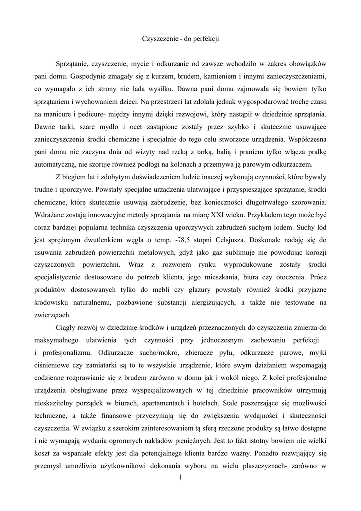 Czyszczenie - do perfekcji Sprzątanie, czyszczenie, mycie i odkurzanie od zawsze wchodziło w zakres obowiązków pani domu. Gospodynie zmagały się z kurzem, brudem, kamieniem i innymi zanieczyszczeniami, co wymagało z ich strony nie lada wysiłku. Dawna pani domu zajmowała się bowiem tylko sprzątaniem i wychowaniem dzieci. Na przestrzeni lat zdołała jednak wygospodarować trochę czasu na manicure i pedicure- między innymi dzięki rozwojowi, który nastąpił w dziedzinie sprzątania. Dawne tarki, szare mydło i ocet zastąpione zostały przez szybko i skutecznie usuwające zanieczyszczenia środki chemiczne i specjalnie do tego celu stworzone urządzenia. Współczesna pani domu nie zaczyna dnia od wizyty nad rzeką z tarką, balią i praniem tylko włącza pralkę automatyczną, nie szoruje również podłogi na kolonach a przemywa ją parowym odkurzaczem. Z biegiem lat i zdobytym doświadczeniem ludzie inaczej wykonują czynności, które bywały trudne i uporczywe. Powstały specjalne urządzenia ułatwiające i przyspieszające sprzątanie, środki chemiczne, które skutecznie usuwają zabrudzenie, bez konieczności długotrwałego szorowania. Wdrażane zostają innowacyjne metody sprzątania na miarę XXI wieku. Przykładem tego może być coraz bardziej popularna technika czyszczenia uporczywych zabrudzeń suchym lodem. Suchy lód jest sprężonym dwutlenkiem węgla o temp. -78,5 stopni Celsjusza. Doskonale nadaję się do usuwania zabrudzeń powierzchni metalowych, gdyż jako gaz sublimuje nie powodując korozji czyszczonych powierzchni. Wraz z rozwojem rynku wyprodukowane zostały środki specjalistycznie dostosowane do potrzeb klienta, jego mieszkania, biura czy otoczenia. Prócz produktów dostosowanych tylko do mebli czy glazury powstały również środki przyjazne środowisku naturalnemu, pozbawione substancji alergizujących, a także nie testowane na zwierzętach. Ciągły rozwój w dziedzinie środków i urządzeń przeznaczonych do czyszczenia zmierza do maksymalnego ułatwienia tych czynności przy jednoczesnym zachowaniu perfekcji i profesjonalizmu. Odkurzacze sucho/mokro, zbieracze pyłu, odkurzacze parowe, myjki ciśnieniowe czy zamiatarki są to te wszystkie urządzenie, które swym działaniem wspomagają codzienne rozprawianie się z brudem zarówno w domu jak i wokół niego. Z kolei profesjonalne urządzenia obsługiwane przez wyspecjalizowanych w tej dziedzinie pracowników utrzymują nieskazitelny porządek w biurach, apartamentach i hotelach. Stale poszerzające się możliwości techniczne, a także finansowe przyczyniają się do zwiększenia wydajności i skuteczności czyszczenia. W związku z szerokim zainteresowaniem tą sferą rzeczone produkty są łatwo dostępne i nie wymagają wydania ogromnych nakładów pieniężnych. Jest to fakt istotny bowiem nie wielki koszt za wspaniałe efekty jest dla potencjalnego klienta bardzo ważny. Ponadto rozwijający się przemysł umożliwia użytkownikowi dokonania wyboru na wielu płaszczyznach- zarówno w 1 markach, cenach jak i gatunkach produktów przeznaczonych do sprzątania. Każdy zatem może znaleźć coś dla siebie. Tak samo jak na każdy problem i zanieczyszczenie można znaleźć rozwiązanie. To właśnie firma Scarlett, która wyspecjalizowała się w dziedzinie czystości i innowacyjności sprzątania uświadomiła mi, że nie ma rzeczy niemożliwych. Firma ta pokazuje, że na wszystkie problemy związane z różnorodnymi zabrudzenia można znaleźć skuteczne rozwiązania oraz środki, które pomagają uporać się nawet z najbardziej uporczywymi zabrudzeniami. 2