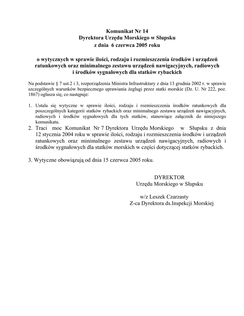 Komunikat Nr 14 Dyrektora Urzędu Morskiego w Słupsku z dnia 6