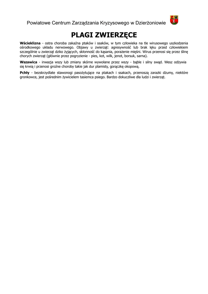 Powiatowe Centrum Zarządzania Kryzysowego w Dzierżoniowie PLAGI ZWIERZĘCE Wścieklizna - ostra choroba zakaźna ptaków i ssaków, w tym człowieka na tle wirusowego uszkodzenia ośrodkowego układu nerwowego. Objawy u zwierząt: agresywność lub brak lęku przed człowiekiem szczególnie u zwierząt dziko żyjących, skłonność do kąsania, porażenie mięśni. Wirus przenosi się przez ślinę chorych zwierząt (głównie przez pogryzienie - pies, kot, wilk, jenot, borsuk, sarna). Wszawica - inwazja wszy lub zmiany skórne wywołane przez wszy - bąble i silny swąd. Wesz odżywia się krwią i przenosi groźne choroby takie jak dur plamisty, gorączkę okopową. Pchły - bezskrzydlate stawonogi pasożytujące na ptakach i ssakach, przenoszą zarazki dżumy, niektóre gronkowce, jest pośrednim żywicielem tasiemca psiego. Bardzo dokuczliwe dla ludzi i zwierząt.