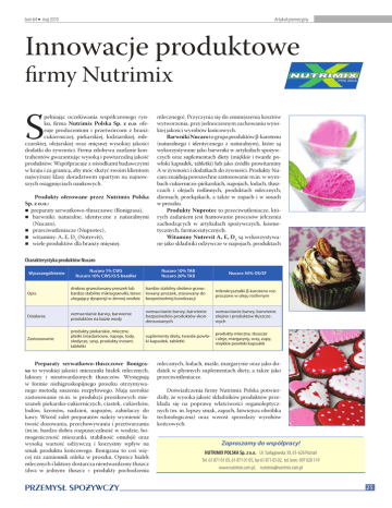 tom 64 l maj 2010 Artykuł promocyjny Innowacje produktowe firmy Nutrimix S pełniając oczekiwania współczesnego rynku, firma Nutrimix Polska Sp. z o.o. oferuje producentom i przetwórcom z branż: cukierniczej, piekarskiej, lodziarskiej, mleczarskiej, olejarskiej oraz mięsnej wysokiej jakości dodatki do żywności. Firma zdobywa zaufanie kontrahentów gwarantując wysoką i powtarzalną jakość produktów. Współpracuje z ośrodkami badawczymi w kraju i za granicą, aby móc służyć swoim klientom najwyższej klasy doradztwem opartym na najnowszych osiągnięciach naukowych. Produkty oferowane przez Nutrimix Polska Sp. z o.o.: preparaty serwatkowo-tłuszczowe (Bonigrasa), barwniki: naturalne, identyczne z naturalnymi (Nucaro), przeciwutleniacze (Nuprotec), witaminy: A, E, D3 (Nutrevit), wiele produktów dla branży mięsnej. mlecznego). Przyczynia się do zmniejszenia kosztów wytworzenia, przy jednoczesnym zachowaniu wysokiej jakości wyrobów końcowych. Barwniki Nucaro to grupa produktów β-karotenu (naturalnego i identycznego z naturalnym), które są wykorzystywane jako barwniki w artykułach spożywczych oraz suplementach diety (miękkie i twarde powłoki kapsułek, tabletki) lub jako źródło prowitaminy A w żywności i dodatkach do żywności. Produkty Nucaro znajdują powszechne zastosowanie m.in. w wyrobach cukierniczo-piekarskich, napojach, lodach, tłuszczach i olejach roślinnych, produktach mlecznych, dżemach, przekąskach, a także w zupach i w sosach w proszku. Produkty Nuprotec to przeciwutleniacze, których zadaniem jest hamowanie procesów jełczenia zachodzących w artykułach spożywczych, kosmetycznych, farmaceutycznych. Witaminy Nutrevit A, E, D3 są wykorzystywane jako składniki odżywcze w napojach, produktach Charakterystyka produktów Nucaro Wyszczególnienie Nucaro 1% CWS Nucaro 10% CWS/O/S beadlet Nucaro 10% TAB Nucaro 20% TAB Nucaro 30% OS/SF Opis drobno granulowany proszek lub bardzo stabilny drobno granubardzo stabilne mikrogranulki, łatwo lowany proszek, stosowany do ulegający dyspersji w zimnej wodzie bezpośredniej kondesacji Działanie wzmacnianie barwy, barwienie produktów na bazie wody wzmacnianie barwy, barwienie bezpośrednio produktów skondensowanych Zastosowanie produkty piekarskie, mleczne, płatki śniadaniowe, napoje, lody, słodycze, sosy, produkty instant, tabletki produkty mleczne, tłuszcze suplementy diety, twarde powłoi oleje, margaryny, sosy, zupy, ki kapsułek, tabletki miękkie powłoki kapsułek Preparaty serwatkowo-tłuszczowe Bonigrasa to wysokiej jakości mieszanki białek mlecznych, laktozy i nieutwardzonych tłuszczów. Występują w formie niehigroskopijnego proszku otrzymywanego metodą suszenia rozpyłowego. Mają szerokie zastosowanie m.in. w produkcji proszkowych mieszanek piekarsko-cukierniczych, ciastek, cukierków, lodów, kremów, nadzień, napojów, zabielaczy do kawy. Wśród zalet preparatów należy wymienić łatwość dozowania, przechowywania i przetwarzania (m.in. bardzo dobra rozpuszczalność w wodzie, homogeniczność mieszanki, stabilność emulsji) oraz wysoką wartość odżywczą i korzystny wpływ na smak produktu końcowego. Bonigrasa to coś więcej niż zamiennik mleka w proszku. Oprócz białek mlecznych i laktozy dostarcza nieutwardzony tłuszcz (dwa w jednym: tłuszcz + produkty pochodzenia PRZEMYSŁ SPOZYWCZY mikrokryształki β-karotenu rozproszone w oleju roślinnym wzmacnianie barwy, barwienie olejów i produktów tłuszczowych mlecznych, lodach, maśle, margarynie oraz jako dodatek w płynnych suplementach diety, a także jako przeciwutleniacze. Doświadczenia firmy Nutrimix Polska potwierdziły, że wysoka jakość składników produktów przekłada się na poprawę właściwości organoleptycznych (m. in. lepszy smak, zapach, łatwiejsza obróbka technologiczna) oraz wzrost sprzedaży wyrobów końcowych. Zapraszamy do współpracy! NUTRIMIX POLSKA Sp. z o.o. Ul. Szelągowska 30, 61-626 Poznań Tel. 61 871 01 03, 61 871 01 05, fax 61 871 03 02, tel. kom. 697 020 119 www.nutrimix.com.pl, [email protected] 25