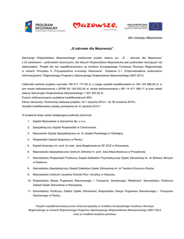 dla rozwoju Mazowsza „E-zdrowie dla Mazowsza” Samorząd Województwa Mazowieckiego zrealizował projekt własny pn.: „E - zdrowie dla Mazowsza” z 23 partnerami - podmiotami leczniczymi, dla których Województwo Mazowieckie jest podmiotem tworzącym lub właścicielem. Projekt ten był współfinansowany ze środków Europejskiego Funduszu Rozwoju Regionalnego w ramach Priorytetu II „Przyspieszenie e-rozwoju Mazowsza”, Działania 2.1 „Przeciwdziałanie wykluczeniu informacyjnemu” Regionalnego Programu Operacyjnego Województwa Mazowieckiego 2007-2013. Całkowita wartość projektu wyniosła 106 011 177,92 zł, z czego wydatki kwalifikowalne to 100 125 686,52 zł, w tym kwota dofinansowania z EFRR 85 106 833,54 zł, kwota dofinansowania z BP 14 017 596,11 zł oraz wkład własny Samorządu Województwa Mazowieckiego 1 001 257,82 zł. Poziom dofinansowania wydatków kwalifikowalnych 99%. Okres rzeczowej i finansowej realizacji projektu: od 1 stycznia 2012 r. do 30 września 2016 r. Wydatki kwalifikowalne zostały poniesione do 31 grudnia 2015 r. W projekcie brały udział następujące podmioty lecznicze: 1. Szpital Mazowiecki w Garwolinie Sp. z o.o., 2. Specjalistyczny Szpital Wojewódzki w Ciechanowie, 3. Mazowiecki Szpital Specjalistyczny im. dr Józefa Psarskiego w Ostrołęce, 4. Wojewódzki Szpital Zespolony w Płocku, 5. Szpital Dziecięcy im. prof. dr med. Jana Bogdanowicza SP ZOZ w Warszawie, 6. Mazowieckie Specjalistyczne Centrum Zdrowia im. prof. Jana Mazurkiewicza w Pruszkowie, 7. Samodzielny Wojewódzki Publiczny Zespół Zakładów Psychiatrycznej Opieki Zdrowotnej im. dr Barbary Borzym w Radomiu, 8. Samodzielny Specjalistyczny Zespół Zakładów Opieki Zdrowotnej im. dr Teodora Dunina w Rudce, 9. Mazowieckie Centrum Leczenia Chorób Płuc i Gruźlicy w Otwocku, 10. Wojewódzka Stacja Pogotowia Ratunkowego i Transportu Sanitarnego "Meditrans" Samodzielny Publiczny Zakład Opieki Zdrowotnej w Warszawie, 11. Samodzielny Publiczny Zakład Opieki Zdrowotnej Wojewódzka Stacja Pogotowia Ratunkowego i Transportu Sanitarnego w Płocku, Projekt współfinansowany przez Unię Europejską ze środków Europejskiego Funduszu Rozwoju Regionalnego w ramach Regionalnego Programu Operacyjnego Województwa Mazowieckiego 2007-2013 oraz ze środków budżetu państwa 12. Samodzielny Publiczny Zakład Opieki Zdrowotnej "MEDITRANS OSTROŁĘKA" Stacja Pogotowia Ratunkowego i Transportu Sanitarnego w Ostrołęce 13. Samodzielny Publiczny Zakład Opieki Zdrowotnej „RM-MEDITRANS” Stacja Pogotowia Ratunkowego i Transportu Sanitarnego w Siedlcach, 14. Wojewódzki Samodzielny Zespół Publicznych Zakładów Opieki Zdrowotnej im. prof. Eugeniusza Wilczkowskiego w Gostyninie, 15. Mazowiecki Szpital Bródnowski w Warszawie Sp. z o.o., 16. Samodzielny Zespół Publicznych Zakładów Opieki Zdrowotnej im. Dzieci Warszawy w Dziekanowie Leśnym, 17. Samodzielny Publiczny Zakład Opieki Zdrowotnej Wojewódzki Szpital Zakaźny w Warszawie, 18. Samodzielny Wojewódzki Zespół Publicznych Zakładów Psychiatrycznej Opieki Zdrowotnej w Warszawie, 19. Mazowieckie Centrum Psychiatrii "Drewnica" Sp. z o.o., 20. Mazowiecki Szpital Wojewódzki w Siedlcach Sp. z o.o., 21. Mazowieckie Centrum Rehabilitacji "STOCER" Sp. z o.o., 22. Mazowiecki Szpital Specjalistyczny Sp. z o.o. z siedzibą w Radomiu, 23. Centrum Leczniczo - Rehabilitacyjne i Medycyny Pracy ATTIS Sp. z o.o. Celem głównym projektu było dostosowanie podmiotów leczniczych - partnerów projektu do wymogów ustawy z dnia 28 kwietnia 2011 r. o systemie informacji w ochronie zdrowia (Dz. U. z 2016 r. Nr 1535 z póź. zm.). Realizacja projektu miała na celu zapewnienie bezpiecznego i zgodnego z prawem wytwarzania, przechowywania oraz przekazywania dokumentów medycznych pomiędzy podmiotami leczniczymi dla których Województwo Mazowieckie jest podmiotem tworzącym lub właścicielem. Oprócz celu głównego zostały osiągnięte następujące opisowe cele: 1) stworzono możliwość sprawowania pełnego nadzoru właścicielskiego poprzez zbieranie jednolitych danych on line z systemów informatycznych szpitali, które muszą spełniać zasadę interoperacyjności i komplementarności, 2) poprawiono bezpieczeństwo danych znajdujących się w obszarze opieki zdrowotnej, 3) wdrożono nowoczesne technologie ICT dla personelu medycznego wykorzystującego technologie informatyczne w codziennej pracy. Realizując cele wdrożono repozytorium elektronicznej dokumentacji medycznej (EDM) w warstwie lokalnej oraz regionalnej u 23 podmiotów leczniczych działających na terenie Województwa Mazowieckiego, dla których podmiotem tworzącym lub właścicielem jest Województwo Mazowieckie. Każdy Partner będzie zarządzał procesem tworzenia i gromadzenia EDM, przy jednoczesnym wdrożeniu mechanizmów synchronizacji zawartości repozytorium EDM do warstwy regionalnej. Za pomocą specjalnie przygotowanych mechanizmów eksportu na poziomie lokalnym u danego PP istnieje możliwość przesyłania elektronicznej dokumentacji z sytemu SSI do Lokalnego Repozytorium Elektronicznej Dokumentacji Medycznej (LREDM). Następnie dokumenty te za pomocą Szyny danych mogą być przesyłane do Regionalnego Repozytorium Elektronicznej Dokumentacji Medycznej (RREDM), które znajdują się w warstwie regionalnej. W RREDM znajdują się dwa elementy: - Regionalny System EDM, jako zbiór dokumentacji medycznej generowanej i rejestrowanej w postaci elektronicznej (cyfrowej), - Repozytorium Wspólne EDM, gdzie przechowywane mogą być kopie zapasowe LREDM dla wszystkich PP. W ramach struktur LREDM oraz RREDM funkcjonuje CA (Centrum Autoryzacji) jako narzędzie informatyczne do wydawania i przechowywania podpisów elektronicznych niekwalifikowanych. Na poziomie lokalnym CA będzie umożliwiało podpisywanie przez użytkownika z danego PP wszystkich dokumentów elektronicznej dokumentacji i umieszczane ich w LREDM i RREDM. Informacje źródłowe na temat Regionalnego Programu