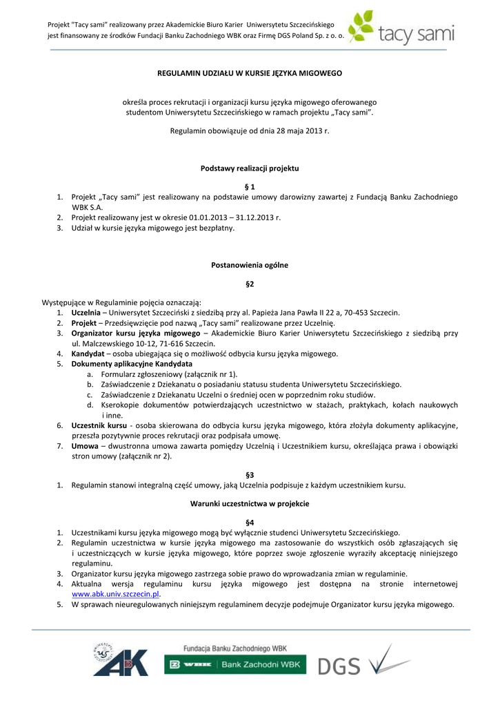 Projekt "Tacy sami” realizowany przez Akademickie Biuro Karier Uniwersytetu Szczecioskiego jest finansowany ze środków Fundacji Banku Zachodniego WBK oraz Firmę DGS Poland Sp. z o. o. REGULAMIN UDZIAŁU W KURSIE JĘZYKA MIGOWEGO określa proces rekrutacji i organizacji kursu języka migowego oferowanego studentom Uniwersytetu Szczecioskiego w ramach projektu „Tacy sami”. Regulamin obowiązuje od dnia 28 maja 2013 r. Podstawy realizacji projektu §1 1. Projekt „Tacy sami” jest realizowany na podstawie umowy darowizny zawartej z Fundacją Banku Zachodniego WBK S.A. 2. Projekt realizowany jest w okresie 01.01.2013 – 31.12.2013 r. 3. Udział w kursie języka migowego jest bezpłatny. Postanowienia ogólne §2 Występujące w Regulaminie pojęcia oznaczają: 1. Uczelnia – Uniwersytet Szczecioski z siedzibą przy al. Papieża Jana Pawła II 22 a, 70-453 Szczecin. 2. Projekt – Przedsięwzięcie pod nazwą „Tacy sami” realizowane przez Uczelnię. 3. Organizator kursu języka migowego – Akademickie Biuro Karier Uniwersytetu Szczecioskiego z siedzibą przy ul. Malczewskiego 10-12, 71-616 Szczecin. 4. Kandydat – osoba ubiegająca się o możliwośd odbycia kursu języka migowego. 5. Dokumenty aplikacyjne Kandydata a. Formularz zgłoszeniowy (załącznik nr 1). b. Zaświadczenie z Dziekanatu o posiadaniu statusu studenta Uniwersytetu Szczecioskiego. c. Zaświadczenie z Dziekanatu Uczelni o średniej ocen w poprzednim roku studiów. d. Kserokopie dokumentów potwierdzających uczestnictwo w stażach, praktykach, kołach naukowych i inne. 6. Uczestnik kursu - osoba skierowana do odbycia kursu języka migowego, która złożyła dokumenty aplikacyjne, przeszła pozytywnie proces rekrutacji oraz podpisała umowę. 7. Umowa – dwustronna umowa zawarta pomiędzy Uczelnią i Uczestnikiem kursu, określająca prawa i obowiązki stron umowy (załącznik nr 2). §3 1. Regulamin stanowi integralną częśd umowy, jaką Uczelnia podpisuje z każdym uczestnikiem kursu. Warunki uczestnictwa w projekcie §4 1. Uczestnikami kursu języka migowego mogą byd wyłącznie studenci Uniwersytetu Szczecioskiego. 2. Regulamin uczestnictwa w kursie języka migowego ma zastosowanie do wszystkich osób zgłaszających się i uczestniczących w kursie języka migowego, które poprzez swoje zgłoszenie wyraziły akceptację niniejszego regulaminu. 3. Organizator kursu języka migowego zastrzega sobie prawo do wprowadzania zmian w regulaminie. 4. Aktualna wersja regulaminu kursu języka migowego jest dostępna na stronie internetowej www.abk.univ.szczecin.pl. 5. W sprawach nieuregulowanych niniejszym regulaminem decyzje podejmuje Organizator kursu języka migowego. Projekt "Tacy sami” realizowany przez Akademickie Biuro Karier Uniwersytetu Szczecioskiego jest finansowany ze środków Fundacji Banku Zachodniego WBK oraz Firmę DGS Poland Sp. z o. o. Informacje o kursie języka migowego §5 1. Informowanie o kursie języka migowego realizowanego w ramach projektu odbywa się w szczególności poprzez stronę internetową www.abk.univ.szczecin.pl. 2. Kurs języka migowego odbywa się w Szczecinie. Kurs obejmowad będzie 60 godzin lekcyjnych (po 45 minut każda) - 10 spotkao po 6 godzin lekcyjnych każde. Dokładny kalendarz spotkao zostanie przekazany uczestnikom kursu najpóźniej do dnia 26.06.2013 r. 3. Kurs realizowany będzie w okresie 01.07-12.07.2013. 4. Ilośd miejsc uczestników kursu języka migowego jest ograniczona. 5. Warunkiem uczestnictwa w kursie języka migowego jest złożenie kompletu dokumentów aplikacyjnych wskazanych w §2 ust. 5 w wyznaczonym terminie oraz pomyślne przejście procedury rekrutacyjnej. Rekrutacja §6 1. Rekrutacja Uczestników kursu odbywad się będzie w III etapach: a. I etap. Rekrutacja kandydatów i ocena formalna dokumentów aplikacyjnych przez Organizatora kursu języka migowego i. Kompletnie i czytelnie wypełniony formularz zgłoszeniowy dostępny na stronie internetowej www.abk.univ.szczecin.pl (załącznik nr 1) oraz wymagane dokumenty aplikacyjne należy złożyd w terminie wskazanym przez Organizatora kursu języka migowego (§2 ust. 5). Termin rekrutacji zostanie ogłoszony na stronie internetowej www.abk.univ.szczecin.pl. ii. Raz złożone dokumenty nie podlegają uzupełnieniu. iii. Ocenie podlegają: a) terminowośd złożenia dokumentów, b) poprawnośd złożonych dokumentów, c) zawartośd merytoryczna złożonych dokumentów, d) średnia ocen. iv. Przydzielenie punktów za średnią ocen w poprzednim roku studiów. Średnia poniżej 4,01 nie będzie punktowana. Punkty za arytmetyczną średnią ocen przyznawane są wg następującej skali: Średnia 4,01- 4,1 – 1 pkt. Średnia 4,11 – 4,2 – 2 pkt. Średnia 4,21 – 4,3 – 3 pkt. Średnia 4,31 – 4,4 – 4 pkt. Średnia 4,41 – 4,5 – 5 pkt. Średnia 4,51 – 4,6 – 6 pkt. Średnia 4,61 – 4,7 – 7 pkt. Średnia 4,71 – 4,8 – 8 pkt. Średnia 4,81 – 4,9 – 9 pkt. Średnia 4,91 – 5,0 – 10 pkt. v. Przydzielenie punktów za doświadczenie zawodowe i in. aktywnośd: a) 3 punkty za pełny 1 rok działalności w kołach naukowych, organizacjach studenckich itp. (do doświadczenia nie wlicza się aktywności w partiach politycznych, zgromadzeniach religijnych itp.), b) 3 punkty za każdy miesiąc odbytych praktyk, stażu lub doświadczenia zawodowego zgodnego z kierunkiem studiów. O przydzieleniu punktów decyduje Organizator. vi. Nie są rozpatrywane w dalszym procesie rekrutacji dokumenty złożone poza terminem rekrutacji, dokumentacja złożona częściowo lub wypełniona częściowo, dokumentacja nieczytelnie wypełniona, dokumentacja wypełniona błędnie, złożona przez osoby, które nie spełniają postanowieo zawartych w regulaminie. Projekt "Tacy sami” realizowany przez Akademickie Biuro Karier Uniwersytetu Szczecioskiego jest finansowany ze środków Fundacji Banku Zachodniego WBK oraz Firmę DGS Poland Sp. z o. o. b. II etap. Ocena Kandydatów w bezpośredniej rozmo