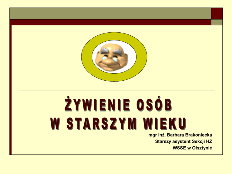 mgr inż. Barbara Brakoniecka Starszy asystent Sekcji HŻ WSSE w Olsztynie KLASYFIKACJA WIEKU LUDZI według Światowej Organizacji Zdrowia (WHO) Człowiek w wieku „średnim” (wiek średni) 45-59 lat „stary” (wiek starczy, tzw. późna starość) 75-89 lat w wieku „starszym” (wiek podeszły, tzw. wczesna starość) 60-74 lat „bardzo stary” (wiek sędziwy, tzw. długowieczność) 90 lat i więcej SKUTKI STARZENIA ORGANIZMU Starzenie się, jak i starość są kolejnymi etapami ludzkiego życia, w którym: następuje dysfunkcja układów (np. pokarmowego, krążenia, nerwowego) i zmniejszenie rezerwy czynnościowej narządów (np. wątroby, trzustki), a w konsekwencji obniżenie możliwości zachowania równowagi wewnątrzustrojowej, prowadzącej do zmniejszenia możliwości przyjmowania, trawienia, wchłaniania i przyswajania wielu składników pokarmowych. Jest to proces ciągły i nieodwracalny. SKUTKI STARZENIA ORGANIZMU ubytek uzębienia powoduje zmniejszenie zdolności prawidłowego gryzienia i żucia pokarmów, co wpływa zarówno na ilość, jak i jakość spożywanego jedzenia; ze względu na zanikanie struktur odpowiedzialnych za odbiór bodźców smakowych w błonie śluzowej języka, spada zdolność ich odczuwania; SKUTKI STARZENIA ORGANIZMU w wieku starszym częściej dochodzi do zaburzeń perystaltyki przełyku, co może sprawiać trudności w przełykaniu; w żołądku zachodzi proces zanikania komórek wydzielających soki trawienne oraz czynników odpowiedzialnych za wchłanianie niektórych składników pokarmowych; w jelicie cienkim, ze względu na spłaszczenie kosmków, spada efektywność wchłaniania. PRZYCZYNY STARZENIA ORGANIZMU Przyczyny starzenia się są przedmiotem zainteresowania człowieka od wieków. Istnieje wiele teorii na ten temat, ale żadna nie daje kompletnej odpowiedzi. Jedno jest pewne - nie istnieje jedna przyczyna tego procesu, a wiele. PRZYCZYNY STARZENIA ORGANIZMU Obecnie najbardziej popularną teorią starzenia się jest teoria wolnych rodników, która łączy i uzupełnia wszystkie inne teorie. Zanieczyszczenie środowiska, promieniowanie jonizujące, życie w stresie, nieprawidłowy sposób żywienia powodują, że organizm ludzki coraz bardziej narażony jest na działanie wolnych rodników. Dlatego też prozdrowotny styl życia i stosowanie diety bogatej w antyoksydanty (przeciwutleniacze, np. witaminę C) ma uzasadnienie naukowe. SAMOOCENA ODŻYWIENIA PRZEZ OSOBY W STARSZYM WIEKU Niezmiernie ważne jest, aby: członkowie rodziny, bliscy znajomi, lekarze, pielęgniarki środowiskowe, pracownicy socjalni, a przede wszystkim sami starsi ludzie zwracali uwagę na sygnały, które mogą ostrzegać przed ryzykiem niedożywienia. SAMOOCENA ODŻYWIENIA PRZEZ OSOBY W STARSZYM WIEKU Amerykańscy naukowcy opracowali listę znaków ostrzegawczych, na które należy zwrócić uwagę, gdy jest się osobą starszą lub opiekunem takiej osoby. Analiza tej listy oraz krótki, złożony z 10 pytań test, mogą posłużyć jako proste narzędzia do sprawdzenia ryzyka niedożywienia wśród osób starszych. SAMOOCENA ODŻYWIENIA PRZEZ OSOBY W STARSZYM WIEKU Żywieniowa lista kontrolna oparta na znakach ostrzegawczych Choroby - Jakiekolwiek istniejące choroby lub przewlekłe dolegliwości, które wpływają na sposób żywienia lub są przyczyną trudności w jedzeniu, zwiększają ryzyko niedożywienia. - U czterech spośród pięciu osób w starszym wieku występują przewlekłe choroby, które oddziałują na dietę. SAMOOCENA ODŻYWIENIA PRZEZ OSOBY W STARSZYM WIEKU Żywieniowa lista kontrolna oparta na znakach ostrzegawczych Choroby - Oszacowano, że zaburzenia pamięci u jednej spośród pięciu starszych osób pogarszają pobieranie pożywienia (powodują one bowiem trudności w zapamiętywaniu co, kiedy lub czy w ogóle jadłeś). SAMOOCENA ODŻYWIENIA PRZEZ OSOBY W STARSZYM WIEKU Żywieniowa lista kontrolna oparta na znakach ostrzegawczych Choroby - Poczucie smutku lub przygnębienie, które dotyka około jednej spośród ośmiu osób w starszym wieku, w zależności od nasilenia może być przyczyną zmniejszonego łaknienia, zmian w trawieniu, może wpływać na masę ciała (osoby w starszym wieku z prawidłową lub nadmierną masą ciała mają często niedobory witamin i mikroelementów). SAMOOCENA ODŻYWIENIA PRZEZ OSOBY W STARSZYM WIEKU - Żywieniowa lista kontrolna oparta na znakach ostrzegawczych Nieprawidłowe żywienie Zjadanie zbyt małych, jak również zbyt dużych ilości pożywienia w stosunku do zapotrzebowania organizmu prowadzi do pogorszenia stanu zdrowia (niedożywienie i otyłość nasilają choroby układu krążenia i inne). - Spożywanie tych samych produktów i potraw każdego dnia lub brak w codziennej diecie owoców, warzyw i produktów mlecznych może być przyczyną niedożywienia. SAMOOCENA ODŻYWIENIA PRZEZ OSOBY W STARSZYM WIEKU - Żywieniowa lista kontrolna oparta na znakach ostrzegawczych Nieprawidłowe żywienie Jedna spośród pięciu dorosłych osób pomija niektóre posiłki każdego dnia, a tylko 13% spożywa minimalną, niezbędną dla zdrowia ilość owoców i warzyw. - Jedna spośród czterech osób w starszym wieku spożywa zbyt dużo alkoholu. Wiele problemów zdrowotnych nasila się, jeśli wypijane są więcej niż 1-2 porcje napojów alkoholowych w ciągu dnia (1 porcja alkoholu - 20 g czystego etanolu - odpowiada: 1 kieliszkowi 50 ml wódki, 1 kieliszkowi 150 ml wina, małej butelce 330 ml piwa). SAMOOCENA ODŻYWIENIA PRZEZ OSOBY W STARSZYM WIEKU Żywieniowa lista kontrolna oparta na znakach ostrzegawczych Braki w uzębieniu, choroby jamy ustnej - Zdrowa jama ustna, zęby i dziąsła są niezbędne do spożywania różnorodnych pokarmów. - Słabe zęby lub ich brak, albo źle dopasowana proteza zębowa utrudniają przyjmowanie pokarmów, co może być bezpośrednią przyczyną niedożywienia. SAMOOCENA ODŻYWIENIA PRZEZ OSOBY W STARSZYM WIEKU Żywieniowa lista kontrolna oparta na znaka