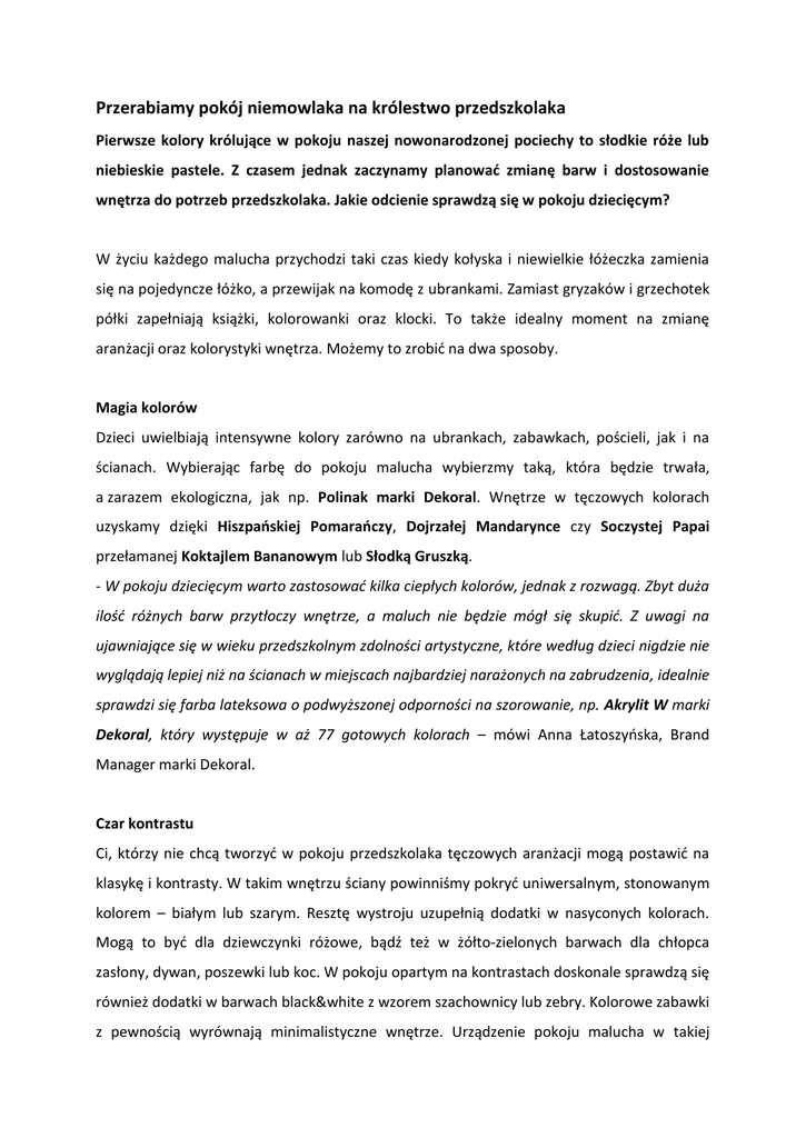 Przerabiamy pokój niemowlaka na królestwo przedszkolaka Pierwsze kolory królujące w pokoju naszej nowonarodzonej pociechy to słodkie róże lub niebieskie pastele. Z czasem jednak zaczynamy planować zmianę barw i dostosowanie wnętrza do potrzeb przedszkolaka. Jakie odcienie sprawdzą się w pokoju dziecięcym? W życiu każdego malucha przychodzi taki czas kiedy kołyska i niewielkie łóżeczka zamienia się na pojedyncze łóżko, a przewijak na komodę z ubrankami. Zamiast gryzaków i grzechotek półki zapełniają książki, kolorowanki oraz klocki. To także idealny moment na zmianę aranżacji oraz kolorystyki wnętrza. Możemy to zrobić na dwa sposoby. Magia kolorów Dzieci uwielbiają intensywne kolory zarówno na ubrankach, zabawkach, pościeli, jak i na ścianach. Wybierając farbę do pokoju malucha wybierzmy taką, która będzie trwała, a zarazem ekologiczna, jak np. Polinak marki Dekoral. Wnętrze w tęczowych kolorach uzyskamy dzięki Hiszpańskiej Pomarańczy, Dojrzałej Mandarynce czy Soczystej Papai przełamanej Koktajlem Bananowym lub Słodką Gruszką. - W pokoju dziecięcym warto zastosować kilka ciepłych kolorów, jednak z rozwagą. Zbyt duża ilość różnych barw przytłoczy wnętrze, a maluch nie będzie mógł się skupić. Z uwagi na ujawniające się w wieku przedszkolnym zdolności artystyczne, które według dzieci nigdzie nie wyglądają lepiej niż na ścianach w miejscach najbardziej narażonych na zabrudzenia, idealnie sprawdzi się farba lateksowa o podwyższonej odporności na szorowanie, np. Akrylit W marki Dekoral, który występuje w aż 77 gotowych kolorach – mówi Anna Łatoszyńska, Brand Manager marki Dekoral. Czar kontrastu Ci, którzy nie chcą tworzyć w pokoju przedszkolaka tęczowych aranżacji mogą postawić na klasykę i kontrasty. W takim wnętrzu ściany powinniśmy pokryć uniwersalnym, stonowanym kolorem – białym lub szarym. Resztę wystroju uzupełnią dodatki w nasyconych kolorach. Mogą to być dla dziewczynki różowe, bądź też w żółto-zielonych barwach dla chłopca zasłony, dywan, poszewki lub koc. W pokoju opartym na kontrastach doskonale sprawdzą się również dodatki w barwach black&white z wzorem szachownicy lub zebry. Kolorowe zabawki z pewnością wyrównają minimalistyczne wnętrze. Urządzenie pokoju malucha w takiej tonacji daje duże możliwości aranżacyjne, ponieważ w szybki i prosty sposób możemy zmienić wystrój wnętrza operując jedynie dodatkami.