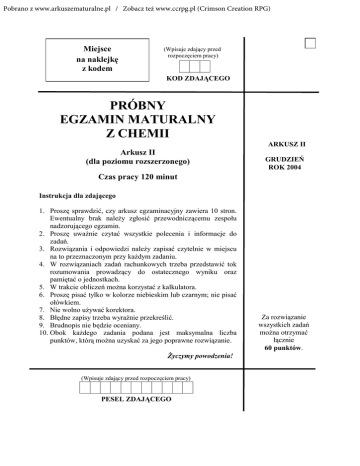 Pobrano z www.arkuszematuralne.pl / Zobacz też www.ccrpg.pl (Crimson Creation RPG) Miejsce na naklejkę z kodem (Wpisuje zdający przed rozpoczęciem pracy) KOD ZDAJĄCEGO PRÓBNY EGZAMIN MATURALNY Z CHEMII ARKUSZ II Arkusz II (dla poziomu rozszerzonego) GRUDZIEŃ ROK 2004 Czas pracy 120 minut Instrukcja dla zdającego 1. Proszę sprawdzić, czy arkusz egzaminacyjny zawiera 10 stron. Ewentualny brak należy zgłosić przewodniczącemu zespołu nadzorującego egzamin. 2. Proszę uważnie czytać wszystkie polecenia i informacje do zadań. 3. Rozwiązania i odpowiedzi należy zapisać czytelnie w miejscu na to przeznaczonym przy każdym zadaniu. 4. W rozwiązaniach zadań rachunkowych trzeba przedstawić tok rozumowania prowadzący do ostatecznego wyniku oraz pamiętać o jednostkach. 5. W trakcie obliczeń można korzystać z kalkulatora. 6. Proszę pisać tylko w kolorze niebieskim lub czarnym; nie pisać ołówkiem. 7. Nie wolno używać korektora. 8. Błędne zapisy trzeba wyraźnie przekreślić. 9. Brudnopis nie będzie oceniany. 10. Obok każdego zadania podana jest maksymalna liczba punktów, którą można uzyskać za jego poprawne rozwiązanie. Życzymy powodzenia! (Wpisuje zdający przed rozpoczęciem pracy) PESEL ZDAJĄCEGO Za rozwiązanie wszystkich zadań można otrzymać łącznie 60 punktów. Próbny egzamin maturalny z chemii Arkusz egzaminacyjny II Zadanie 30. (3 pkt) Zbudowano ogniwo wg schematu przedstawionego na rysunku. Sumaryczna reakcja ogniwa przebiega według zapisu: Mg + Cu2+ → Mg2+ + Cu Uzupełnij podaną informację zaznaczając na rysunku, który z metali jest katodą a który anodą. Określ znaki elektrod i zaznacz na schemacie kierunek przepływu elektronów. Zadanie 31. (4 pkt) Znane z życia codziennego związki: I – alkohol, II – ocet, III – mydło, IV – aceton w roztworach wodnych wykazują (przy użyciu wskaźnika uniwersalnego) odczyn kwasowy, zasadowy lub obojętny. Uzupełnij tabelkę wstawiając znak x w odpowiednie miejsce. I II III IV Wzór związku – nazwa związku CH3CH2OH - etanol CH3COOH – kwas octowy C17H35COONa – stearynian sodu CH3 –C–CH3 – propanon O pH < 7 pH = 7 pH > 7 Zadanie 32. (3 pkt) Jednym z etapów produkcji kwasu siarkowego(VI) jest reakcja: 2SO2(g) + O2(g) ⇄ SO3(g) ∆H < 0 Określ, jak warunki procesu wpływają na szybkość reakcji otrzymywania SO3, wpisując do tabelki któreś z poniższych określeń: „rośnie”, „maleje”, „nie zmienia się”. Lp. Warunki procesu 1 Podwyższona temperatura 2 Podwyższone ciśnienie 3 Katalizator Szybkość reakcji Strona 2 z 10 Próbny egzamin maturalny z chemii Arkusz egzaminacyjny II Zadanie 33. (2 pkt) Szkło wodne, używane do impregnacji materiałów w celu osiągnięcia ich niepalności jest krzemianem sodu. Zaprojektuj doświadczenie, w którym otrzymasz z tej soli kwas krzemowy. a) Przedstaw doświadczenie za pomocą rysunku. b) Zapisz przewidywane obserwacje. ....................................................................................................................................................... ....................................................................................................................................................... Zadanie 34. (3 pkt) Określ typ podanych niżej reakcji: I. C17H33COOH + Br2 → C17H33Br2COOH Al O , temp. II. C2H5OH 23 → C2H4 + H2O światlo III. CH4 + Cl2 → CH3Cl + HCl Reakcja I ............................................................................................................................ Reakcja II ............................................................................................................................ Reakcja III ............................................................................................................................ Zadanie 35. (3 pkt) W tabeli podano wybrane właściwości opisujące następujące kwasy: - kwas mlekowy (2-hydroksypropanowy), - kwas mrówkowy (metanowy), - kwas akrylowy (propenowy). Przyporządkuj podanym właściwościom wzór półstrukturalny odpowiedniego kwasu. Lp. Właściwości chemiczne 1 Wzór półstrukturalny kwasu redukuje odczynnik Tollensa odwodnieniu tworząc tlenek węgla (II) • tworzy estry z kwasami oraz alkoholami • łatwo się utlenia • ulega polimeryzacji • ulega reakcjom addycji • • ulega 2 3 Strona 3 z 10 Próbny egzamin maturalny z chemii Arkusz egzaminacyjny II Zadanie 36. (2 pkt) Liczba masowa izotopu pierwiastka E wynosi 196u. Neutrony w tym izotopie stanowią 60,2% nukleonów. Na podstawie powyższych danych uzupełnij tabelę, dotyczącą budowy tego izotopu. Liczba neutronów Liczba protonów Zadanie 37. (3 pkt) Pary metalicznej rtęci są silnie trujące. Przypadkowo rozlana rtęć powinna być zneutralizowana przez zasypanie sproszkowaną siarką (powstaje siarczek rtęci(II) ). Odpowiedz, dokonując odpowiednich obliczeń, czy 10 g siarki wystarczy do zneutralizowania 5 cm3 rtęci. Gęstość rtęci wynosi: d = 13,546 g/cm3. Obliczenia: Zadanie 38. (2 pkt) Reakcja utleniania tlenku siarki(IV) przebiega z udziałem katalizatora V2O5. Entalpia tej reakcji jest mniejsza od zera. Narysuj wykres zmiany energii spalania tlenku siarki(IV) od biegu reakcji: - bez udziału katalizatora, - z udziałem katalizatora. Strona 4 z 10 Próbny egzamin maturalny z chemii Arkusz egzaminacyjny II Zadanie 39. (1 pkt) W przedstawionym jonowym równaniu reakcji chemicznej CN– + H2O → HCN + OH– Określ, czy anion cyjankowy (CN–) jest kwasem czy zasadą zgodnie z teorią protonową Brönsteda. ....................................................................................................................................................... Zadanie 40. (2 pkt) Wykonano dwa doświadczenia przedstawione schematycznym rysunkiem. Uzyskano roztwory o barwie: zielonej – w probówce 1, zielononiebieskiej – w probówce 2. Określ, w jakim środowisku (kwaśnym, zasadowym czy obojętnym) p