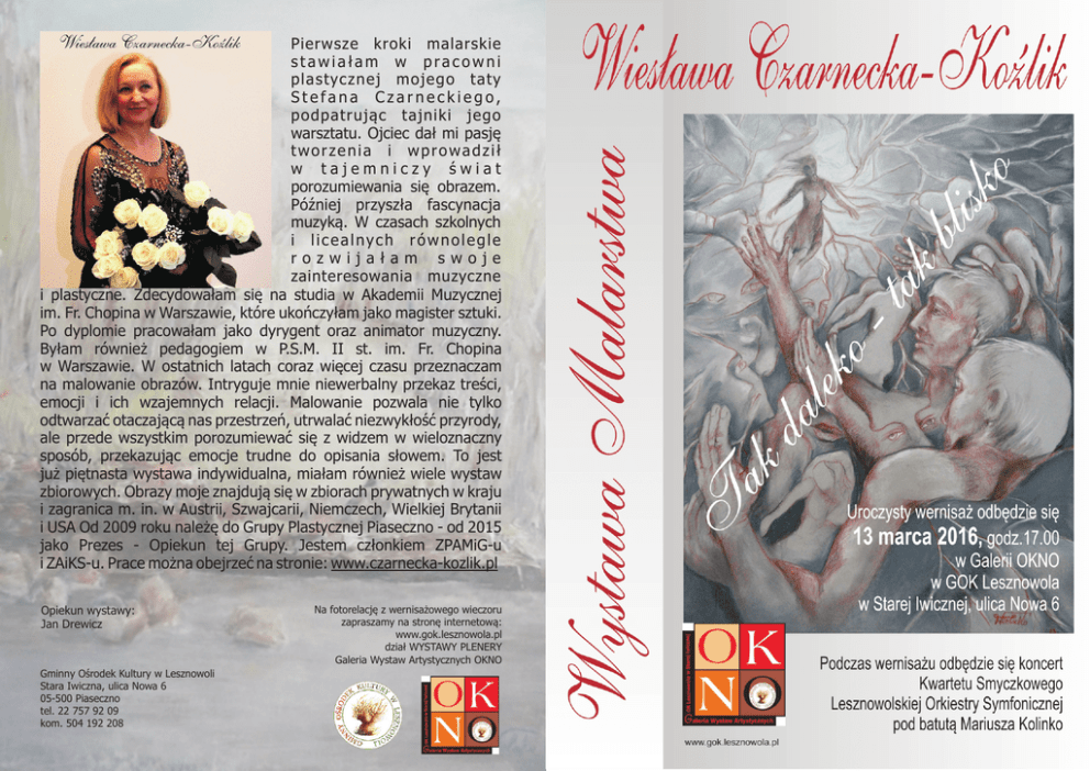 Wies³awa Czarnecka-KoŸlik Pierwsze kroki malarskie stawia³am w pracowni plastycznej mojego taty Stefana Czarneckiego, podpatruj¹c tajniki jego warsztatu. Ojciec da³ mi pasjê tworzenia i wprowadzi³ w tajemniczy œwiat porozumiewania siê obrazem. PóŸniej przysz³a fascynacja muzyk¹. W czasach szkolnych i licealnych równolegle rozwija³am swoje zainteresowania muzyczne i plastyczne. Zdecydowa³am siê na studia w Akademii Muzycznej im. Fr. Chopina w Warszawie, które ukoñczy³am jako magister sztuki. Po dyplomie pracowa³am jako dyrygent oraz animator muzyczny. By³am równie¿ pedagogiem w P.S.M. II st. im. Fr. Chopina w Warszawie. W ostatnich latach coraz wiêcej czasu przeznaczam na malowanie obrazów. Intryguje mnie niewerbalny przekaz treœci, emocji i ich wzajemnych relacji. Malowanie pozwala nie tylko odtwarzaæ otaczaj¹c¹ nas przestrzeñ, utrwalaæ niezwyk³oœæ przyrody, ale przede wszystkim porozumiewaæ siê z widzem w wieloznaczny sposób, przekazuj¹c emocje trudne do opisania s³owem. To jest ju¿ piêtnasta wystawa indywidualna, mia³am równie¿ wiele wystaw zbiorowych. Obrazy moje znajduj¹ siê w zbiorach prywatnych w kraju i zagranica m. in. w Austrii, Szwajcarii, Niemczech, Wielkiej Brytanii i USA Od 2009 roku nale¿ê do Grupy Plastycznej Piaseczno - od 2015 jako Prezes - Opiekun tej Grupy. Jestem cz³onkiem ZPAMiG-u i ZAiKS-u. Prace mo¿na obejrzeæ na stronie: www.czarnecka-kozlik.pl Opiekun wystawy: Jan Drewicz Gminny Oœrodek Kultury w Lesznowoli Stara Iwiczna, ulica Nowa 6 05-500 Piaseczno tel. 22 757 92 09 kom. 504 192 208 Na fotorelacjê z wernisa¿owego wieczoru zapraszamy na stronê internetow¹: www.gok.lesznowola.pl dzia³ WYSTAWY PLENERY Galeria Wystaw Artystycznych OKNO “Malwy” “Odlecieæ” “Oczekiwanie” “Paso doble” “Uwertura” “Ziarno” “Bal” “Potok” “Przebudzenie” “Wo³anie” “Pieta” “Pn¹cza” “Taki taniec” “Wa¿na uroczystoœæ” “Powiedzmy” “Kamienie” “Uwolniona przestrzeñ” “Zmêczeni”