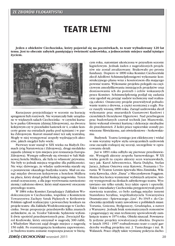 ZE ZBIORÓW FILOKARTYSTKI TEATR LETNI Jeden z obiektów Ciechocinka, który pojawia∏ si´ na pocztówkach, to teatr wybudowany 120 lat temu. Jest to obecnie zabytek pami´tajàcy ÊwietnoÊç uzdrowiska, a jednoczeÊnie miejsce nadal t´tniàce ˝yciem. Kuracjusze przyje˝d˝ajàcy w sezonie na kuracj´ spragnieni byli rozrywek. Nie wystarcza∏y bale urzàdzane w wi´kszych salach Ciechocinka - w czytelni kursalu w parku G∏ównym (dzisiaj Zdrojowym), na dworcu kolejowym czy w poczekalni ¸azienek nr 4, a tak˝e koncerty grane na estradach parku pod t´˝niami i w parku Zdrojowym. Kurort musia∏ mieç te˝ sal´ teatralnà. Mog∏y w niej wyst´powaç zespo∏y w´drujàcych aktorów, jakich niegdyÊ by∏o wiele. Pierwszy teatr stanà∏ w XIX wieku na Bia∏ych Domach (róg Narutowicza i Zdrojowej), drugi niedaleko zajazdu (dzisiaj w tym miejscu jest restauracja EuropaZdrojowa). Wyst´py odbywa∏y si´ równie˝ w Sali Malinowej hotelu Müllera, ale by∏a to w∏asnoÊç prywatna. Nie by∏y to jednak miejsca wygodne dla publicznoÊci. Nic wi´c dziwnego, ˝e w∏adze uzdrowiska stara∏y si´ o postawienie okaza∏ego budynku teatru. Mia∏ on stanàç mi´dzy dworcem kolejowym a hotelem Müllera na placu, który dotàd pe∏ni∏ funkcj´ targowiska. Teren zosta∏ oczyszczony, a dla jego wyrównania nawieziono ziemi´ i za∏o˝ono skwer, który mia∏ stanowiç otoczenie przysz∏ego teatru. W 1884 roku Komitet Zarzàdzajàcy Zak∏adem Wodoleczniczym w Ciechocinku, wspólnie z Komitetem Towarzystwa Zach´ty Sztuk Pi´knych w Królestwie Polskim og∏osi∏ realizacyjny i powszechny konkurs na projekt teatru dla Zak∏adu Wodoleczniczego w Ciechocinku. Swoje propozycje przedstawi∏o kilku znanych architektów, m. in. Teodor Talowski. S´dziowie wy∏onili dwie spoÊród przedstawionych prac. Zwyci´˝y∏ Karol Koz∏owski, który otrzyma∏ w nagrod´ 300 rubli, a W∏adys∏aw Marconi zajà∏ drugie miejsce z nagrodà 150 rubli. Po rozstrzygni´ciu konkursu zapewniono, ˝e budowa teatru zostanie rozpocz´ta jeszcze w bie˝à- ZDRÓJ CIECHOCI¡SKI wrzesieƒ 2011 cym roku, natomiast ukoƒczona w przysz∏ym sezonie kàpielowym. Jednak ˝aden z nagrodzonych projektów nie zosta∏ zrealizowany. Brakowa∏o po prostu funduszy. Dopiero w 1890 roku Komitet Ciechociƒski zleci∏ Adolfowi Schimmelpfennigowi wykonanie konstrukcyjnego planu wraz z kosztorysem dla majàcego powstaç teatru. Wykonanie projektu polega∏o na cz´Êciowym zmodyfikowaniu istniejàcych projektów oraz dostosowaniu ich do potrzeb i celów wskazanych przez Komitet. Schimmelpfennig podjà∏ si´ zadania oraz zgodzi∏ si´ przyjàç nadzór techniczny nad realizacjà ca∏oÊci. Ostateczny projekt przewidywa∏ pobudowanie teatru z drewna, a cz´Êci scenicznej z ceg∏y. Prace ruszy∏y wiosnà 1890 roku. Zarzàd uzdrowiska zleci∏ wykonanie prac murarskich Gustawowi Kuslowi i ciesielskich Henrykowi Elgiertowi. Nad przebiegiem prac budowlanych czuwa∏ technik Jan Mianowski, który wykona∏ równie˝ kurtyn´ i dekoracje niezb´dne do przedstawieƒ. Z kolei prace tapicerskie zosta∏y powierzone Âliwickiemu, zaÊ oÊwietleniowe - Serkowskiemu. Budynek Teatru Letniego jest eklektyczny i widaç w nim wyraêny wp∏yw stylu szwajcarskich uzdrowisk oraz zaczàtki rodzàcej si´ secesji, szczególnie w opracowaniu detali. Ju˝ w 1891 roku odby∏o si´ pierwsze przedstawienie. Wystàpili aktorzy zespo∏u Sarnowskiego. W XX wieku goÊcili tu cz´sto aktorzy scen warszawskich, tacy jak: Karol Adwentowicz, Maria Dul´ba, Stefan Jaracz, Juliusz Osterwa oraz Katowic, Poznania i Torunia. W Teatrze Letnim Êpiewa∏a Mira Zimiƒska, Wiktoria Kawecka, chór „Dana” z Mieczys∏awem Foggiem. Mo˝na bez koƒca wymieniaç wybitnych artystów, którzy wyst´powali na deskach zabytkowego teatru. Wystawiano nie tylko sztuki, lecz tak˝e opery i operetki. Tak˝e i mieszkaƒcy Ciechocinka przygotowywali przedstawienia teatralne, co by∏o zas∏ugà mi´dzy innymi Stanis∏awa Serafina, wspó∏za∏o˝yciela Towarzystwa Dramatyczno - Âpiewaczego „Lira”. Po 1945 r. do Ciechocinka zje˝d˝a∏y teatry zawodowe z pobliskich miast: Torunia, Gniezna, Bydgoszczy, Grudziàdza, a nawet z Warszawy. Jednak brak systematycznych remontów i pogarszajàcy si´ stan techniczny spowodowa∏y zamkni´cie teatru w 1974 roku. Obiekt niszcza∏. Powstawa∏y jedynie projekty rewaloryzacji obiektu. Dopiero w latach 1992 - 1997 rozbudowano teatr o cz´Êç garderoby wed∏ug projektu in˝. J. Tusieckiego i in˝. B. Walaszek. Prace obj´∏y tak˝e wymian´ pokrycia dacho- 20