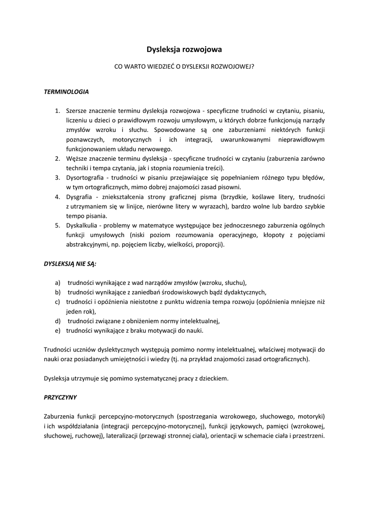 Dysleksja rozwojowa CO WARTO WIEDZIEĆ O DYSLEKSJI ROZWOJOWEJ? TERMINOLOGIA 1. Szersze znaczenie terminu dysleksja rozwojowa - specyficzne trudności w czytaniu, pisaniu, liczeniu u dzieci o prawidłowym rozwoju umysłowym, u których dobrze funkcjonują narządy zmysłów wzroku i słuchu. Spowodowane są one zaburzeniami niektórych funkcji poznawczych, motorycznych i ich integracji, uwarunkowanymi nieprawidłowym funkcjonowaniem układu nerwowego. 2. Węższe znaczenie terminu dysleksja - specyficzne trudności w czytaniu (zaburzenia zarówno techniki i tempa czytania, jak i stopnia rozumienia treści). 3. Dysortografia - trudności w pisaniu przejawiające się popełnianiem różnego typu błędów, w tym ortograficznych, mimo dobrej znajomości zasad pisowni. 4. Dysgrafia - zniekształcenia strony graficznej pisma (brzydkie, koślawe litery, trudności z utrzymaniem się w linijce, nierówne litery w wyrazach), bardzo wolne lub bardzo szybkie tempo pisania. 5. Dyskalkulia - problemy w matematyce występujące bez jednoczesnego zaburzenia ogólnych funkcji umysłowych (niski poziom rozumowania operacyjnego, kłopoty z pojęciami abstrakcyjnymi, np. pojęciem liczby, wielkości, proporcji). DYSLEKSJĄ NIE SĄ: a) trudności wynikające z wad narządów zmysłów (wzroku, słuchu), b) trudności wynikające z zaniedbań środowiskowych bądź dydaktycznych, c) trudności i opóźnienia nieistotne z punktu widzenia tempa rozwoju (opóźnienia mniejsze niż jeden rok), d) trudności związane z obniżeniem normy intelektualnej, e) trudności wynikające z braku motywacji do nauki. Trudności uczniów dyslektycznych występują pomimo normy intelektualnej, właściwej motywacji do nauki oraz posiadanych umiejętności i wiedzy (tj. na przykład znajomości zasad ortograficznych). Dysleksja utrzymuje się pomimo systematycznej pracy z dzieckiem. PRZYCZYNY Zaburzenia funkcji percepcyjno-motorycznych (spostrzegania wzrokowego, słuchowego, motoryki) i ich współdziałania (integracji percepcyjno-motorycznej), funkcji językowych, pamięci (wzrokowej, słuchowej, ruchowej), lateralizacji (przewagi stronnej ciała), orientacji w schemacie ciała i przestrzeni. ETIOLOGIA Uwarunkowania zaburzeń dyslektycznych są wielorakie: 1. minimalne uszkodzenia centralnego układu nerwowego z okresu ciąży i porodu o nieprawidłowym przebiegu (choroba matki, działanie szkodliwych substancji, napromieniowanie, niedotlenienie dziecka), uszkodzenia nabyte we wczesnym dzieciństwie, głównie w pierwszych miesiącach życia, 2. dziedziczność (czynnikiem patogennym mogą być geny przekazywane z pokolenia na pokolenie), 3. opóźnienia w dojrzewaniu centralnego układu nerwowego, 4. zaburzenia hormonalne w okresie rozwoju płodowego (nadprodukcja hormonów, np. testosteronu, może wpływać na niedokształcenie struktury niektórych okolic kory mózgowej i nieprawidłowy model rozwoju mózgu, tzn. zablokowanie rozwoju lewej półkuli mózgowej), 5. słaby rozwój zdolności i sprawności językowych, 6. brak wyćwiczenia funkcji poznawczych i ruchowych zaangażowanych w proces czytania i pisania w odpowiednim okresie życia dziecka, 7. czynniki psychogenne (urazy psychiczne, stres) i zaburzeniach sfery emocjonalnej. Dysleksji prawdziwej nie można zapobiec. Nie jest "schorzeniem przejściowym", które można całkowicie wyeliminować. Można natomiast i należy łagodzić jego skutki oraz wspierać dziecko w jego dążeniu do bycia dobrym w tym, co robi. Duży wpływ na narastanie i pogłębianie się trudności ma zaniedbanie środowiskowe i dydaktyczne. TYPY DYSLEKSJI a) wzrokowa - u jej podłoża leżą zaburzenia percepcji i pamięci wzrokowej, powiązane z zaburzeniami koordynacji wzrokowo-ruchowej i wzrokowo-przestrzennej, b) słuchowa - uwarunkowana zaburzeniami percepcji i pamięci słuchowej, dźwięków mowy, najczęściej powiązana z zaburzeniami funkcji językowych, c) integracyjna - poszczególne funkcje nie wykazują zakłóceń, natomiast zaburzona jest ich koordynacja, d) mieszana. CZĘSTOŚĆ WYSTĘPOWANIA W literaturze europejskiej podaje się, że dzieci dyslektyczne stanowią 10-15% uczniów, w tym 4% to przypadki bardzo nasilonych trudności, które można byłoby określić nazwą głębokiej dysleksji. Badania w Polsce określają odsetek dysleksji na 9-10% (Bogdanowicz, Jaklewicz). Trudności pozostałych dzieci mają charakter pozadyslektyczny. OBJAWY DYSLEKSJI ROZWOJOWEJ Pierwsze symptomy dysleksji u dziecka rodzice mogą zaobserwować już w wieku przedszkolnym. Najczęściej jednak ujawniają się one w klasie zerowej i podczas pierwszych trzech lat nauki w szkole. Oto najważniejsze z nich: opóźniony rozwój mowy, mała sprawność i koordynacja ruchów podczas zabaw ruchowych, samoobsługi, rysowania i pisania (brzydkie pismo), wadliwa wymowa, trudności z wypowiadaniem złożonych słów, błędy gramatyczne, trudności z różnicowaniem głosek podobnych oraz z wydzieleniem sylab, głosek ze słów i ich syntezą, trudności z wykonywaniem układanek i odtwarzaniem wzorów graficznych, oburęczność, mylenie prawej i lewej ręki, trudności w czytaniu pomimo dobrej inteligencji oraz braku zaniedbania środowiskowego i dydaktycznego, trudności z opanowaniem poprawnej pisowni: pismo zwierciadlane, mylenie liter podobnych pod względem kształtu (p-b-d-g), liter odpowiadających głoskom zbliżonym fonetycznie, opuszczanie liter, błędy ortograficzne. W pierwszych latach nauki często myli się dysleksję z przejawami indywidualnego tempa rozwoju. W starszych klasach: Zaburzenia percepcji słuchowej warunkują występowanie trudności w nauce języków obcych, w uczeniu się pamięciowym, w przyswajaniu materiału z gramatyki, rozumieniu dłuższych wypowiedzi słownych i poleceń nauczyciela. Zaburzenia funkcji wzrokowej i orientacji przestrzennej powodują trudności w nauce przyrody (wzrokowe ujmowanie stosunków przestrzennych na mapie, orientacja w stronach świata)