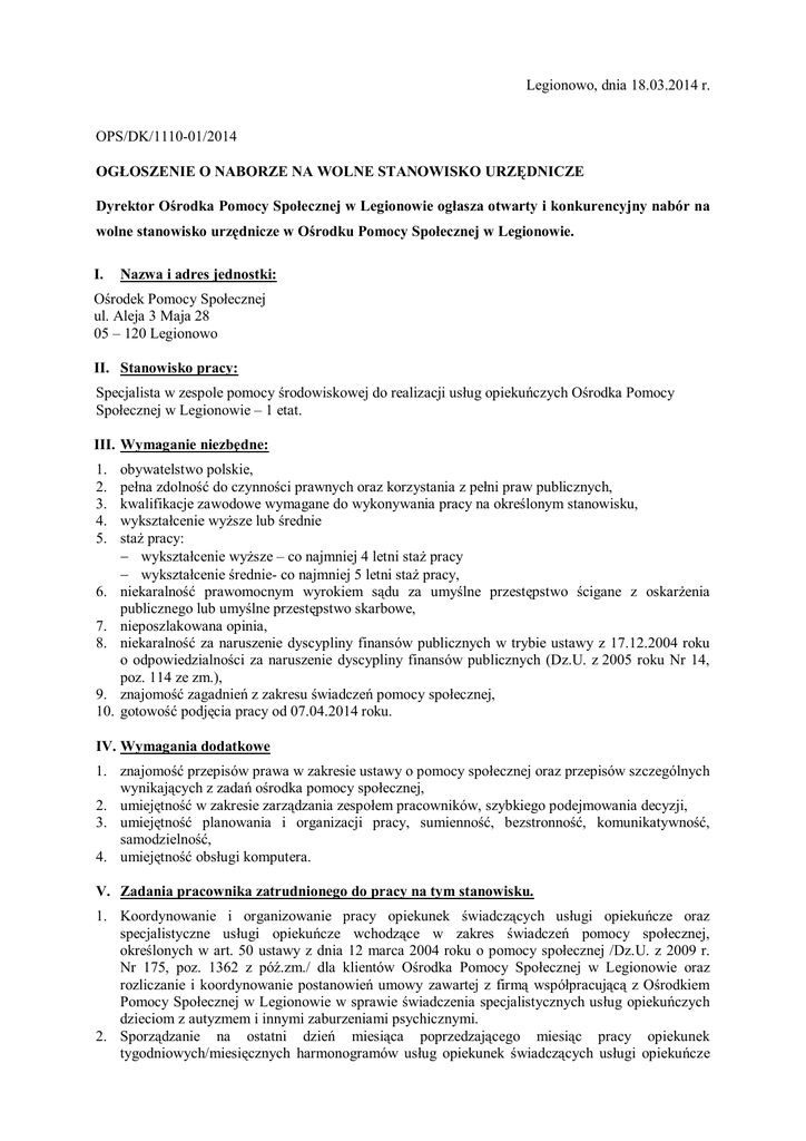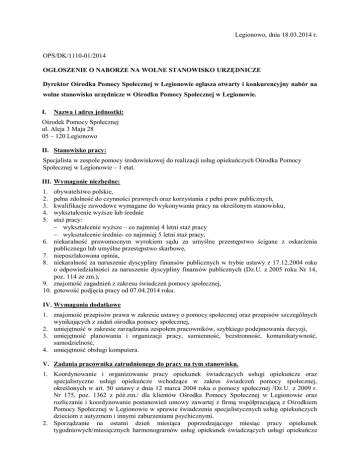 Legionowo, dnia 18.03.2014 r. OPS/DK/1110-01/2014 OGŁOSZENIE O NABORZE NA WOLNE STANOWISKO URZĘDNICZE Dyrektor Ośrodka Pomocy Społecznej w Legionowie ogłasza otwarty i konkurencyjny nabór na wolne stanowisko urzędnicze w Ośrodku Pomocy Społecznej w Legionowie. I. Nazwa i adres jednostki: Ośrodek Pomocy Społecznej ul. Aleja 3 Maja 28 05 – 120 Legionowo II. Stanowisko pracy: Specjalista w zespole pomocy środowiskowej do realizacji usług opiekuńczych Ośrodka Pomocy Społecznej w Legionowie – 1 etat. III. Wymaganie niezbędne: 1. 2. 3. 4. 5. 6. 7. 8. 9. 10. obywatelstwo polskie, pełna zdolność do czynności prawnych oraz korzystania z pełni praw publicznych, kwalifikacje zawodowe wymagane do wykonywania pracy na określonym stanowisku, wykształcenie wyższe lub średnie staż pracy: − wykształcenie wyższe – co najmniej 4 letni staż pracy − wykształcenie średnie- co najmniej 5 letni staż pracy, niekaralność prawomocnym wyrokiem sądu za umyślne przestępstwo ścigane z oskarżenia publicznego lub umyślne przestępstwo skarbowe, nieposzlakowana opinia, niekaralność za naruszenie dyscypliny finansów publicznych w trybie ustawy z 17.12.2004 roku o odpowiedzialności za naruszenie dyscypliny finansów publicznych (Dz.U. z 2005 roku Nr 14, poz. 114 ze zm.), znajomość zagadnień z zakresu świadczeń pomocy społecznej, gotowość podjęcia pracy od 07.04.2014 roku. IV. Wymagania dodatkowe 1. znajomość przepisów prawa w zakresie ustawy o pomocy społecznej oraz przepisów szczególnych wynikających z zadań ośrodka pomocy społecznej, 2. umiejętność w zakresie zarządzania zespołem pracowników, szybkiego podejmowania decyzji, 3. umiejętność planowania i organizacji pracy, sumienność, bezstronność, komunikatywność, samodzielność, 4. umiejętność obsługi komputera. V. Zadania pracownika zatrudnionego do pracy na tym stanowisku. 1. Koordynowanie i organizowanie pracy opiekunek świadczących usługi opiekuńcze oraz specjalistyczne usługi opiekuńcze wchodzące w zakres świadczeń pomocy społecznej, określonych w art. 50 ustawy z dnia 12 marca 2004 roku o pomocy społecznej /Dz.U. z 2009 r. Nr 175, poz. 1362 z póź.zm./ dla klientów Ośrodka Pomocy Społecznej w Legionowie oraz rozliczanie i koordynowanie postanowień umowy zawartej z firmą współpracującą z Ośrodkiem Pomocy Społecznej w Legionowie w sprawie świadczenia specjalistycznych usług opiekuńczych dzieciom z autyzmem i innymi zaburzeniami psychicznymi. 2. Sporządzanie na ostatni dzień miesiąca poprzedzającego miesiąc pracy opiekunek tygodniowych/miesięcznych harmonogramów usług opiekunek świadczących usługi opiekuńcze 3. 4. 5. 6. 7. 8. 9. 10. 11. oraz specjalistyczne usługi opiekuńcze zawierające m.in. okres świadczenia usługi, imię i nazwisko opiekunki, imię i nazwisko świadczeniobiorcy, a także koordynowanie i rozliczanie specjalistycznych usług opiekuńczych świadczonych przez firmę współpracujacą z Ośrodkiem Pomocy Społecznej w Legionowie. Przyjmowanie wpłat za usługi opiekuńcze, w tym specjalistyczne pobierane od świadczeniobiorców przez osoby upoważnione przez Dyrektora Ośrodka Pomocy Społecznej w Legionowie. Dokonywanie zbiorczych wpłat za usługi opiekuńcze, w tym specjalistyczne nie później niż do 18-go dnia następnego miesiąca następującego po miesiącu w którym świadczone były usługi. Przyjmowanie wpłaty na podstawie kwitariuszy, pobieranych za pokwitowaniem wg. zasad określonych w „Zasadach ewidencji kwitariuszy przychodowych”. Systematyczne dostarczanie dowodów wpłat z tytułu odpłatności za świadczone usługi opiekuńcze do działu księgowości Ośrodka Pomocy Społecznej w Legionowie. Sporządzanie miesięcznych zestawień – rozliczenia z wykonanych usług opiekuńczych i specjalistycznych usług opiekuńczych w celu prawidłowego udokumentowania wykonanych usług opiekuńczych oraz specjalistycznych usług opiekuńczych. Sporządzanie miesięcznych zestawień rozliczeń z odpłatności za usługi opiekuńcze, specjalistyczne usługi opiekuńcze realizowane przez poszczególne opiekunki oraz firmę współpracującą z Ośrodkiem Pomocy Społecznej w Legionowie. Sporządzanie na podstawie indywidualnych kart usług miesięcznych zestawień faktycznie zrealizowanych godzin usług przez opiekunki świadczące usługi opiekuńcze i specjalistyczne usługi opiekuńcze oraz firmę współpracującą z Ośrodkiem Pomocy Społecznej w Legionowie. Przestrzeganie ustawy o ochronie danych osobowych (Dz.U. z 2002 r nr 101, poz. 926 ze zm.) oraz ustawy o ochronie informacji niejawnych (Dz.U. z 2010 r. nr 182, poz. 1228) oraz zachowanie w tajemnicy informacji uzyskanych w trakcie przetwarzania danych osobowych zebranych w związku z wykonywania obowiązków służbowych. Znajomość przepisów i aktów prawnych wynikających z potrzeb powyższego zakresu obowiązków. VI. Wymagane dokumenty: 1. list motywacyjny, 2. życiorys - curriculum vitae, 3. wypełniony i podpisany kwestionariusz osobowy dla osoby ubiegającej się o zatrudnienie – wg. wzoru dostępnego na stronie internetowej Ośrodka Pomocy Społecznej w Legionowie lub w Dziale administracyjno-gospodarczym i kadr Ośrodka, 4. podpisane oświadczenie o posiadaniu obywatelstwa polskiego, 5. kserokopie dokumentu potwierdzającego wykształcenie, 6. kserokopie świadectw pracy dokumentujących wymagany staż pracy (lub zaświadczenie o zatrudnieniu na podstawie umowy o pracę w przypadku kontynuacji zatrudnienia), 7. opinia o pracy bądź referencje z poprzednich miejsc pracy (jeżeli kandydat takie posiada), 8. kserokopia strony książeczki wojskowej z wpisami dotyczącymi przebiegu służby wojskowej w przypadku, gdy o pracę ubiega się mężczyzna, 9. podpisane oświadczenie o pełnej zdolności do czynności prawnych oraz korzystaniu z pełni praw publicznych, 10. podpisane oświadczenie, że kandydat nie był skazany prawomocnym wyr