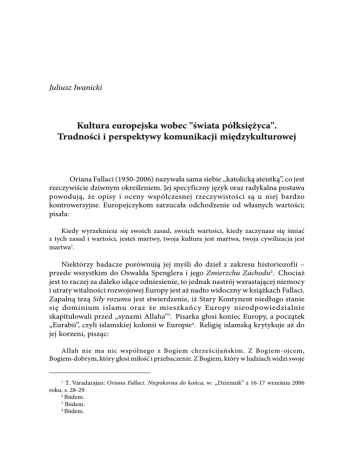 Juliusz Iwanicki Kultura europejska wobec "świata półksiężyca". Trudności i perspektywy komunikacji międzykulturowej Oriana Fallaci (1930-2006) nazywała sama siebie „katolicką ateistką”, co jest rzeczywiście dziwnym określeniem. Jej specyficzny język oraz radykalna postawa powodują, że opisy i oceny współczesnej rzeczywistości są u niej bardzo kontrowersyjne. Europejczykom zarzucała odchodzenie od własnych wartości; pisała: Kiedy wyrzekniesz się swoich zasad, swoich wartości, kiedy zaczynasz się śmiać z tych zasad i wartości, jesteś martwy, twoja kultura jest martwa, twoja cywilizacja jest martwa1. Niektórzy badacze porównują jej myśli do dzieł z zakresu historiozofii – przede wszystkim do Oswalda Spenglera i jego Zmierzchu Zachodu2. Chociaż jest to raczej za daleko idące odniesienie, to jednak nastrój wzrastającej niemocy i utraty witalności rozwojowej Europy jest aż nadto widoczny w książkach Fallaci. Zapalną tezą Siły rozumu jest stwierdzenie, iż Stary Kontynent niedługo stanie się dominium islamu oraz że mieszkańcy Europy nieodpowiedzialnie skapitulowali przed „synami Allaha”3. Pisarka głosi koniec Europy, a początek „Eurabii”, czyli islamskiej kolonii w Europie4. Religię islamską krytykuje aż do jej korzeni, pisząc: Allah nie ma nic wspólnego z Bogiem chrześcijańskim. Z Bogiem-ojcem, Bogiem-dobrym, który głosi miłość i przebaczenie. Z Bogiem, który w ludziach widzi swoje 1 T. Varadarajan: Oriana Fallaci. Niepokorna do końca, w: „Dziennik” z 16-17 września 2006 roku, s. 28-29. 2 Ibidem. 3 Ibidem. 4 Ibidem. KULTURA EUROPEJSKA WOBEC ... 99 swoje dzieci. Allah jest Bogiem-władcą, Bogiem tyranem (...) jak można na jednej płaszczyźnie stawiać Jezusa i Mahometa?5 Oriana Fallaci zwraca się przeciwko dialogowi między kulturą europejską a „światem półksiężyca”. Nie wierzy ona w istnienie umiarkowanego islamu, który chciałby się asymilować z wartościami europejskimi 6. Twierdzi nawet, że radykalizm jest immanentną częścią islamu7. Krytykę tą pogłębia swoją refleksję, iż islam nie jest zdolny do wyrzeczenia się przemocy8. Fallaci nigdy nie przynależała do Kościoła ani nawet nie ukrywała swojego światopoglądowego ateizmu. Nie przeszkadzało to jednak jej solidaryzować się z wartościami chrześcijańskiej Europy, jak i jej cywilizacyjnym dorobkiem. Darzyła ona sympatią obecnego papieża Benedykta XVI, który przyjął ją nawet na prywatnej audiencji9. Znamienne są słowa, które wypowiedziała krótko przed śmiercią: Czuję się mniej samotna, kiedy czytam Ratzingera (...) Jestem ateistką, a skoro ateistka i papież myślą tak samo, to musi być w tym coś z prawdy. To proste! Musi istnieć jakaś ogólnoludzka prawda, która wykracza poza religię10. Paradoksalnie, chociaż Fallaci niewątpliwie była wrogiem kultury islamskiej i krytykowała zwolenników dialogu z muzułmanami, to jednak sama udzielała się w swoistym dialogu człowieka niewierzącego z kulturą chrześcijańską. W taki oto sposób możliwe było dla niej używanie określenia „katolicka ateistka”. Chciałbym, kontynuując rozważania dotyczące radykalnych postaw Europejczyków wobec świata islamu, przedstawić poglądy filozofa Slavoja Žižka. W swoim tekście Obrońcy wiary. Tylko ateizm może nas uratować11 broni on laickiego i oświeceniowego dorobku kultury europejskiej. Pisze, że: Dzisiaj (...) religia okazuje się być źródłem morderczej przemocy na całym świecie – zapewnienia, że chrześcijańscy, islamscy czy hinduistyczni fundamentaliści jedynie zniekształcają i nadużywają szlachetnego przesłania zawartego w ich wyznaniach wiary, brzmią pusto. Może należałoby przywrócić godność ateizmowi, który stanowi jeden z najważniejszych elementów dziedzictwa Europy i jest być może jedyną szansą na pokój12? 5 P. Bravo: Po śmierci Oriany Fallaci, w: „Tygodnik Powszechny” z 24 września 2006 roku, s. 20. D. Horowitz: Kobieta, która broniła nas wszystkich, w: „Dziennik” z 16-17 września 2006 roku, s. 29. 7 Ibidem. 8 P. Bravo: op. cit., s. 20. 9 Ibidem. 10 T. Varadarajan: op. cit., s. 29. 11 S. Žižek: Obrońcy wiary. Tylko ateizm moze nas uratować, w: „Europa” z 2 sierpnia 2006 roku, s. 6. 12 Ibidem. 6 100 JULIUSZ IWANICKI Žižek dalej uzasadnia swoją myśl broniącą ateizm, w taki sposób, iż dzięki państwowej laickości można utworzyć bezpieczną przestrzeń publiczną dla wierzących13. Sytuacja, w której żadne wyznanie nie jest faworyzowane przez państwo, powinna w szczególności, według niego, dotyczyć krajów wielokulturowych, ponieważ problem multikulturowości dotyka coraz więcej krajów Europy. Filozoficzne poglądy Žižka, wydawałoby się, nie wnoszą nic nowego w tematykę dialogu pomiędzy kulturą europejską a „światem półksiężyca”. Tymczasem w tekście czytamy o specyficznej sytuacji w Słowenii, kraju z którego pochodzi autor. Otóż okazuje się, iż w dyskusji publicznej, która niedawno rozgorzała w tym państwie, debatowano na temat praw mniejszości muzułmańskiej. Jedyną grupą polityczną, która chciała zezwolić na budowę meczetu w Słowenii byli liberałowie, z którymi utożsamia się Žižek. Według Žižka, europejscy muzułmanie powinni zaakceptować świecki dyskurs publiczny, ponieważ: (...) jedyna siła polityczna, która nie czyni z nich [muzułmanów – J.I.] obywateli drugiej kategorii i daje im przestrzeń do wyrażania ich tożsamości religijnej, to „bezbożni”, ateistyczni liberałowie14. Ponadto, z punktu widzenia tego autora, można prowadzić dialog międzykulturowy na dwa sposoby – pierwszy stosują na ogół ludzie wierzący, drugi – ludzie niewierzący: Szacunek dla przekonań innych jako najwyższa wartość mógłby oznaczać jedno z dwóch: albo traktujemy inną osobę w sposób protekcjonalny i staramy się unikać sprawiania jej przykrości, a