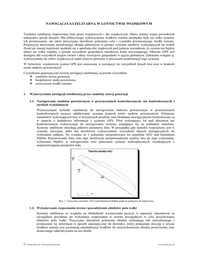 NAWIGACJA SATELITARNA W LOTNICTWIE WOJSKOWYM Technika satelitarna inspirowana była przez wojskowych i dla wojskowych. Okres zimnej wojny powodował nakręcanie spirali zbrojeń. Dla efektywnego wykorzystania środków raŜenia niezbędne były nie tylko systemy ich przenoszenia, ale takŜe precyzyjne określenie połoŜenia celu i czynnika przenoszącego środki raŜenia. Propozycja utworzenia niezaleŜnego układu odniesienia w postaci systemu satelitów wykonujących lot wokół Ziemi po znanej trajektorii spotkała się z aprobatą sfer rządowych pod jednym warunkiem, Ŝe system ten będzie słuŜył nie tylko wojsku, a przede wszystkim gospodarce narodowej kraju inwestującego. Obecnie GPS jest dostępny dla wszystkich krajów świata i słuŜy rozwojowi gospodarki w ujęciu globalnym. ZałoŜenia wstępne tj. wykorzystanie do celów wojskowych nadal stanowi priorytet w procesach modernizacji tego systemu. W lotnictwie wojskowym system GPS jest stosowany w nawigacji we wszystkich fazach lotu oraz w kontroli ruchu statków powietrznych. Czynnikami generującymi rozwój nawigacji satelitarnej są przede wszystkim: samoloty nowej generacji, bezpilotowe statki powietrzne, nowoczesne środki raŜenia. 1. Wykorzystanie nawigacji satelitarnej przez samoloty nowej generacji 1.1. Nawigowanie statkiem powietrznym w przestrzeniach kontrolowanych, nie kontrolowanych i strefach wydzielonych Wykorzystanie techniki satelitarnej do nawigowania statkiem powietrznym w przestrzeniach kontrolowanych stanowi zdublowanie systemu kontroli lotów statków powietrznych. PołoŜenie samolotów wykonujących loty w korytarzach przelotu, nad obiektami nawigacyjnymi kontrolowane są w oparciu o dodatkowe informacje z systemu GPS. Pilot wykonujący lot nad obszarem nie kontrolowanym wykorzystuje do nawigowania systemy znajdujące się na pokładzie samolotu. Systemy satelitarne określają pilotowi parametry lotu. W przypadku gdy samolot wyposaŜony jest w systemy inercyjne, pilot ma moŜliwość wykorzystania wszystkich danych nawigacyjnych do wykonania zadania. Na rysunku nr 1 pokazano zarejestrowany lot samolotu AN2 nad lotniskiem Dęblin. Rejestrowanie trasy lotu daje moŜliwość przeprowadzenia analizy lotu po jego wykonaniu, wykazaniu błędów w nawigowaniu oraz pokazaniu sytuacji niebezpiecznych wynikających z nieprzestrzegania przepisów lotu. Rys. 1. Trasa lotu samolotu AN2 nad lotniskiem Dęblin podczas podejścia do lądowania. 1.2. Wykonywanie rozpoznania terenu i poszukiwanie obiektów pola walki Systemy satelitarne ze względu na dokładność wyznaczania pozycji w separacji sekundowej są szczególnie przydatne do wykonania rozpoznania w terenie przygodnym w celu poszukiwania obiektów pola walki. Precyzyjne określenie połoŜenia obiektu ruchomego lub nieruchomego i przekazanie tej informacji w sposób automatyczny do dowódcy, który podejmuje decyzję o uŜyciu środków raŜenia jest gwarancją minimalizacji środków do unieruchomienia obiektu przeciwnika oraz skutecznego oddziaływania na ten obiekt. © Polskie Biuro ds. Przestrzeni Kosmicznej www.kosmos.gov.pl 1.3. Wykonywanie ataków na cele naziemne (ruchome i nieruchome) • po rozpoznaniu samodzielne wykonywanie ataku Wykonanie rozpoznania obiektu naziemnego (ruchomego lub nieruchomego), określenie współrzędnych tych obiektów przez samoloty lub śmigłowce pozwala na wykonanie skutecznego uderzenia po powtórnym podejściu do celu. Informacja o obiektach naziemnych moŜe być takŜe przekazana przez pilota do następnych załóg samolotów i śmigłowców bojowych w celu wykonania kolejnych ataków na rozpoznane obiekty. W przypadku rozpoznania obiektów ruchomych bardzo istotną informacją będzie wiadomość podana do dowódcy kierującego całą akcją o kierunku przemieszczania się ugrupowania wojsk (kolumn czołgów, bojowych wozów, piechoty). • naprowadzanie lotnictwa na cele naziemne przez oficera naprowadzania (po określeniu parametrów celu na rubieŜy styczności wojsk) Dzięki technice satelitarnej wykonanie naprowadzania lotnictwa na cel naziemny przez nawigatora stało się bezpieczniejsze i łatwiejsze. Proces określenia współrzędnych obiektu na który mamy naprowadzić lotnictwo, dzięki dalmierzom laserowym stał się procesem automatycznym. Informacja o połoŜeniu obiektu w terenie zostaje przesłana na pokład samolotu lub śmigłowca wykonującego atak automatycznie. Pilot posiada takŜe informację o połoŜeniu w terenie nawigatora naprowadzania. Ma to decydujące znaczenie dla jego bezpieczeństwa ze względu na wielkość strefy raŜenia odłamków. Podstawą sukcesu wykonania zadania jest skrytość działania i precyzja wyjścia na obiekt uderzenia. Dzięki systemom satelitarnym nawigator naprowadzania wykorzystując środki techniczne jest w stanie zrealizować te wymagania. Rys. 2. Lot wykonany na symulatorze lotu TS 11 Iskra w naprowadzeniu na cel naziemny. 1.4. Naprowadzanie na cele nawodne przez nawigatora naprowadzania będącego na okręcie z wykorzystaniem stacji radiolokacyjnej W praktyce naprowadzanie lotnictwa na cele nawodne z pokładu okrętu róŜni się od naprowadzania ze stanowiska dowodzenia moŜliwością przemieszczania się okrętu podczas naprowadzania. Precyzyjne naprowadzanie na cele nawodne uzaleŜnione jest więc od dokładnego określenia współrzędnych przemieszczającego się okrętu na którym zamontowano stacje radiolokacyjne. 1.5. Podejście do lądowania i lądowanie na wybranym lotnisku Wykorzystanie techniki satelitarnej do zabezpieczenie podejścia i lądowania statku powietrznego na dowolnie wybranym lotnisku jest problemem, który musi być rozwiązany. Z punktu widzenia ekonomicznego zastosowanie tej technologii jest rozwiązaniem najtańszym. Systemy stacjonarne montowane na lotniska typu ILS, MLS są systemami kosztownym w momencie zakupu i kosztownymi w procesie eksploatacji. Wykorzystanie GNSS do zabezpieczenia lądowania to przede wszystkim zapew