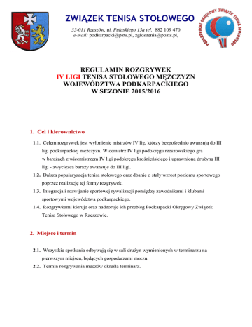 ZWIĄZEK TENISA STOŁOWEGO 35-011 Rzeszów, ul. Pułaskiego 13a tel. 882 109 470 e-mail: [email protected], [email protected], REGULAMIN ROZGRYWEK IV LIGI TENISA STOŁOWEGO MĘŻCZYZN WOJEWÓDZTWA PODKARPACKIEGO W SEZONIE 2015/2016 1. Cel i kierownictwo 1.1. Celem rozgrywek jest wyłonienie mistrzów IV lig, którzy bezpośrednio awansują do III ligi podkarpackiej mężczyzn. Wicemistrz IV ligi podokręgu rzeszowskiego gra w barażach z wicemistrzem IV ligi podokręgu krośnieńskiego i uprawnioną drużyną III ligi - zwycięzca baraży awansuje do III ligi. 1.2. Dalsza popularyzacja tenisa stołowego oraz dbanie o stały wzrost poziomu sportowego poprzez realizację tej formy rozgrywek. 1.3. Integracja i rozwijanie sportowej rywalizacji pomiędzy zawodnikami i klubami sportowymi województwa podkarpackiego. 1.4. Rozgrywkami kieruje oraz nadzoruje ich przebieg Podkarpacki Okręgowy Związek Tenisa Stołowego w Rzeszowie. 2. Miejsce i termin 2.1. Wszystkie spotkania odbywają się w sali drużyn wymienionych w terminarzu na pierwszym miejscu, będących gospodarzami meczu. 2.2. Termin rozgrywania meczów określa terminarz. 3. Uczestnictwo 3.1. W rozgrywkach sezonu 2015/2016 bierze udział 14 drużyn w dwóch grupach (rzeszowska i krośnieńska). 3.2. Zespoły zobowiązane są do potwierdzenia udziału w regulaminowym terminie, wpłacenia wpisowego w wysokości 200 zł (przed rozpoczęciem rozgrywek), podania adresów korespondencyjnych klubów, adresów sali rozgrywek, rodzajów stołów i piłeczek, jakimi rozgrywane będą mecze. 3.3. W przypadku gry dwóch lub więcej drużyn z tego samego klubu przed rozpoczęciem rozgrywek klub zgłasza składy imienne tych zespołów. Zawodnik zgłoszony do składu w jednym zespole nie może grać w drugim zespole tego samego klubu w ciągu całego sezonu ligowego. 3.4. Zawodnicy grający w ligach zagranicznych, gdzie sezon kończy się później niż w Polsce, mogą grać w polskiej lidze, o ile uzyskają licencję okresową w wyznaczonym terminie, pod warunkiem, że ostatni mecz rozegrali przed rozpoczęciem rozgrywek ligowych w Polsce. 3.5. Warunki uczestnictwa zawodnika w zawodach wszystkich szczebli: 3.5.1. posiadanie aktualnej licencji okresowej PZTS na bieżący sezon, 3.5.2. posiadanie ważnego badania lekarskiego, określającego zdolność do udziału w zawodach na okres nie dłuższy niż 6 miesięcy, zgodnie z Rozporządzeniem Ministra Zdrowia z dnia 22 grudnia 2004 r. (Dz.U. z 2004 r., Nr 282 poz. 2815) i Ustawą o sporcie z dnia 25 czerwca 2010 r. (Dz.U. z 2010 r., Nr 127 poz. 857), które ma obowiązek sprawdzić przed rozpoczęciem meczu Sędzia Główny i odnotowuje ten fakt w protokole meczu; ponadto do kontroli ważności badań lekarskich mają prawo – na zasadzie wzajemności – trenerzy i opiekunowie zawodników, badania lekarskie muszą być przeprowadzone przez lekarza sportowego (nie będą honorowane badania przeprowadzone przez innych lekarzy, jak również oświadczenia o posiadaniu ważnych badań, podpisane przez trenera bądź opiekuna zawodników). 3.5.3. obowiązek posiadania kart zdrowia sportowców i ważnych badań lekarskich dotyczy zawodników, którzy nie ukończyli 23. roku życia, 3.5.4. wpisanie w protokole meczowym w składzie drużyny zawodniczki lub zawodnika powyżej 23 lat (z wyjątkiem członków Kadry Narodowej) jest równoznaczne ze 2 złożeniem przez zawodniczkę lub zawodnika oświadczenia o uczestniczeniu w meczu na własną odpowiedzialność (przepis obowiązuje od 1 października 2013 roku), 3.5.5. brak ważnych badań lekarskich uniemożliwia zawodnikowi start w meczu, 3.5.6. posiadanie ważnego ubezpieczenia od NNW zgodnie z Ustawą o sporcie, 3.5.7. posiadanie przepisowego sprzętu i stroju sportowego. 3.5.8. nieposiadanie zaległości finansowych względem PZTS i POZTS, 3.5.9. zawodnik, który w danym sezonie rozegrał 3 mecze w klasie wyższej, nie może występować w klasie niższej, wyjątkiem są kadeci i młodzicy (7 meczów), 3.5.10. w jednym cyklu rozgrywek, zawodnik nie może reprezentować dwóch różnych klubów (przepisy PZTS), 3.5.11. zawodniczka lub zawodnik w jednym terminie ligowym (piątek - czwartek) nie mogą uczestniczyć w dwóch lub więcej meczach ligowych na różnych szczeblach rozgrywek ligowych. 3.5.12. przez udział w meczu należy rozumieć występ w grze pojedynczej lub podwójnej oraz w meczu wygranym walkowerem, jeśli zawodnik wpisany był do podstawowego składu. Nie dotyczy to zawodnika rezerwowego, nie grającego w meczu. 3.5.13. drużyny z klubów uczestniczących w rozgrywkach drużynowych muszą posiadać licencję klubową PZTS. 4. Ustalenie kolejności uczestników rozgrywek 4.1. Numery dla każdej drużyny do klucza gier w terminarzu będą ustalane na podstawie końcowej klasyfikacji drużyn za sezon 2014/2015. Spadkowiczom z III ligi przydzielane są najwyższe numery. Numery dla beniaminków IV ligi będą ustalone drogą losowania. Numery te będą obowiązywały w terminarzu pierwszej rundy. 4.2. O kolejności zajętych miejsc w rozgrywkach IV ligi decyduje liczba zdobytych punktów meczowych. 4.3. W wypadku uzyskania równej ilości punktów, o kolejności miejsc decydują wyniki bezpośrednich spotkań w cyklu rozgrywkowym pomiędzy zainteresowanymi drużynami. 4.4. Za zwycięstwo drużyna otrzymuje 2 punkty, za remis 1 punkt, za porażkę 0 punktów. 3 5. Awans i spadek drużyn 5.1. Mistrzowie IV lig bezpośrednio awansują do III ligi grupy podkarpackiej, natomiast wicemistrzowie IV ligi podokręgu rzeszowskiego i krośnieńskiego oraz 10. (lub inna, wynikająca z regulaminu III ligi) drużyna III ligi rozgrywają baraż o awans do III ligi. 5.2. W przypadku rezygnacji przez mistrzów IV ligi z awansu do III ligi podkarpackiej do wyższej ligi awansują kolejne drużyny z tabeli końcowej po sezonie 2015/2016. 5.3. Z IV ligi rzeszowskiej i krośnieńskiej bezpośrednio spada po 2 drużyny. 5.3.1. 12. (lub inna) drużyna IV ligi podo