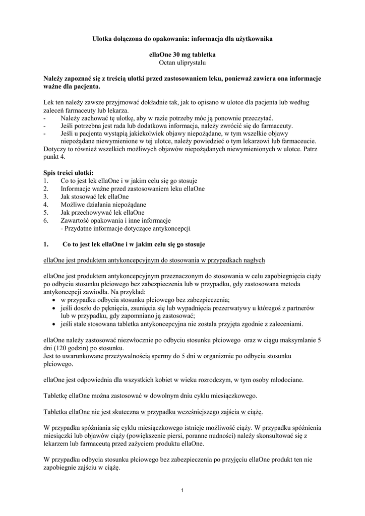 Ulotka dołączona do opakowania: informacja dla użytkownika ellaOne 30 mg tabletka Octan uliprystalu Należy zapoznać się z treścią ulotki przed zastosowaniem leku, ponieważ zawiera ona informacje ważne dla pacjenta. Lek ten należy zawsze przyjmować dokładnie tak, jak to opisano w ulotce dla pacjenta lub według zaleceń farmaceuty lub lekarza. Należy zachować tę ulotkę, aby w razie potrzeby móc ją ponownie przeczytać. Jeśli potrzebna jest rada lub dodatkowa informacja, należy zwrócić się do farmaceuty. Jeśli u pacjenta wystąpią jakiekolwiek objawy niepożądane, w tym wszelkie objawy niepożądane niewymienione w tej ulotce, należy powiedzieć o tym lekarzowi lub farmaceucie. Dotyczy to również wszelkich możliwych objawów niepożądanych niewymienionych w ulotce. Patrz punkt 4. Spis treści ulotki: 1. Co to jest lek ellaOne i w jakim celu się go stosuje 2. Informacje ważne przed zastosowaniem leku ellaOne 3. Jak stosować lek ellaOne 4. Możliwe działania niepożądane 5. Jak przechowywać lek ellaOne 6. Zawartość opakowania i inne informacje - Przydatne informacje dotyczące antykoncepcji 1. Co to jest lek ellaOne i w jakim celu się go stosuje ellaOne jest produktem antykoncepcyjnym do stosowania w przypadkach nagłych ellaOne jest produktem antykoncepcyjnym przeznaczonym do stosowania w celu zapobiegnięcia ciąży po odbyciu stosunku płciowego bez zabezpieczenia lub w przypadku, gdy zastosowana metoda antykoncepcji zawiodła. Na przykład: • w przypadku odbycia stosunku płciowego bez zabezpieczenia; • jeśli doszło do pęknięcia, zsunięcia się lub wypadnięcia prezerwatywy u któregoś z partnerów lub w przypadku, gdy zapomniano ją zastosować; • jeśli stale stosowana tabletka antykoncepcyjna nie została przyjęta zgodnie z zaleceniami. ellaOne należy zastosować niezwłocznie po odbyciu stosunku płciowego oraz w ciągu maksymlanie 5 dni (120 godzin) po stosunku. Jest to uwarunkowane przeżywalnością spermy do 5 dni w organizmie po odbyciu stosunku płciowego. ellaOne jest odpowiednia dla wszystkich kobiet w wieku rozrodczym, w tym osoby młodociane. Tabletkę ellaOne można zastosować w dowolnym dniu cyklu miesiączkowego. Tabletka ellaOne nie jest skuteczna w przypadku wcześniejszego zajścia w ciążę. W przypadku spóźniania się cyklu miesiączkowego istnieje możliwość ciąży. W przypadku spóźnienia miesiączki lub objawów ciąży (powiększenie piersi, poranne nudności) należy skonsultować się z lekarzem lub farmaceutą przed zażyciem produktu ellaOne. W przypadku odbycia stosunku płciowego bez zabezpieczenia po przyjęciu ellaOne produkt ten nie zapobiegnie zajściu w ciążę. 1 Stosunek płciowy bez zabezpieczenia w dowolnym dniu cyklu miesiączkowego może prowadzić do zajścia w ciążę. ellaOne nie jest przeznaczona do stosowania jako stała metoda antykoncepcji. W przypadku braku stałej metody anktykoncepcji należy zwrócić się do lekarza lub farmaceuty o wybranie odpowiedniej metody. Jak działa ellaOne ellaOne zawiera substancję o nazwie octan uliprystalu, wpływającą na aktywność naturalnego hormonu, progesteronu, którego obecność jest niezbędna w celu wystąpienia owulacji. W rezultacie lek działa poprzez opóźnienie owulacji. Antykoncepcja w przypadkach nagłych nie zawsze jest skuteczna. Na 100 kobiet, które zastosują ellaOne w przybliżeniu dwie zajdą w ciążę. ellaOne jest metodą antykoncepcyjną stosowaną w celu zapobiegnięcia zajścia w ciążę. W przypadku bycia w ciąży nie spowoduje ona przerwania istniejącej ciąży. Antykoncepcja w przypadkach nagłych nie chroni przed zakażeniami przenoszonymi drogą płciową. Przed zakażeniami przenoszonymi drogą płciową chronią wyłącznie prezerwatywy. Lek ellaOne nie zapewnia ochrony przed zarażeniem wirusem HIV lub innymi chorobami przenoszonymi drogą płciową (np. chlamydioza, opryszczka narządów płciowych, kłykciny kończyste, rzeżączka, zapalenie wątroby typu B i kiła). W przypadku obaw należy skonsultować się z lekarzem lub farmaceutą. Na końcu niniejszej ulotki znajduje się więcej informacji na temat antykoncepcji. 2. Informacje ważne przed zastosowaniem leku ellaOne Kiedy nie przyjmować leku ellaOne • W przypadku stwierdzenia uczulenia na octan uliprystalu lub którykolwiek z pozostałych składników tego leku (wymienionych w punkcie 6). Ostrzeżenia i środki ostrożności Przed rozpoczęciem przyjmowania ellaOne należy omówić to z lekarzem lub farmaceutą • W przypadku spóźnienia miesiączki lub objawów ciąży (powiększenie piersi, poranne nudności), sugerujących bycie w ciąży (patrz punkt „Ciąża, karmienie piersią i wpływ na płodność”); • W przypadku występowania ciężkiej astmy; • W przypadku ciężkiej choroby wątroby. U wszystkich kobiet należy zastosować niezwłocznie antykoncepcję w przypadkach nagłych po odbyciu stosunku płciowego bez zabezpieczenia. Istnieją dowody, że tabletka ellaOne może być mniej skuteczna w przypadku wzrostu masy ciała lub wskaźnika masy ciała (BMI), jednak dane te są ograniczone i nieprzekonujące. Z tego względu tabletki ellaOne są nadal zalecane dla wszystkich kobiet, bez względu na ich masę lub BMI. Zaleca się konsultację z farmaceutą lub lekarzem w przypadku wątpliwości lub jakichkolwiek problemów związanych ze stosowaniem antykoncepcji w przypadkach nagłych. W przypadku zajścia w ciążę pomimo zażycia tabletki ellaOne ważne jest zwrócenie się do lekarza. Patrz punkt „Ciąża, karmienie piersią i wpływ na płodność” w celu uzyskania dodatkowych informacji. 2 Inne leki antykoncepcyjne i ellaOne Produkt ellaOne może tymczasowo zmniejszyć skuteczność zażywanych regularnie środków antykoncepcyjnych, takich jak pigułki i plastry. W przypadku stosowania antykoncepcji hormonalnej należy kontynuować jej zażywanie w sposób normalny po zażyciu ellaOne, jednak należy stos