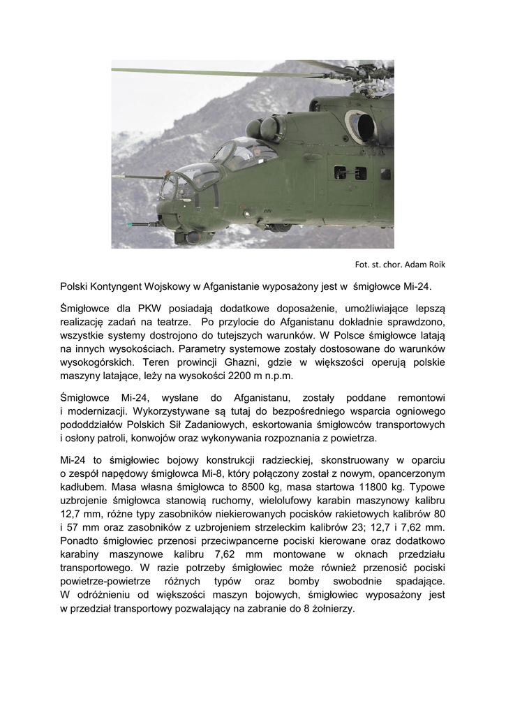 Fot. st. chor. Adam Roik Polski Kontyngent Wojskowy w Afganistanie wyposażony jest w śmigłowce Mi-24. Śmigłowce dla PKW posiadają dodatkowe doposażenie, umożliwiające lepszą realizację zadań na teatrze. Po przylocie do Afganistanu dokładnie sprawdzono, wszystkie systemy dostrojono do tutejszych warunków. W Polsce śmigłowce latają na innych wysokościach. Parametry systemowe zostały dostosowane do warunków wysokogórskich. Teren prowincji Ghazni, gdzie w większości operują polskie maszyny latające, leży na wysokości 2200 m n.p.m. Śmigłowce Mi-24, wysłane do Afganistanu, zostały poddane remontowi i modernizacji. Wykorzystywane są tutaj do bezpośredniego wsparcia ogniowego pododdziałów Polskich Sił Zadaniowych, eskortowania śmigłowców transportowych i osłony patroli, konwojów oraz wykonywania rozpoznania z powietrza. Mi-24 to śmigłowiec bojowy konstrukcji radzieckiej, skonstruowany w oparciu o zespół napędowy śmigłowca Mi-8, który połączony został z nowym, opancerzonym kadłubem. Masa własna śmigłowca to 8500 kg, masa startowa 11800 kg. Typowe uzbrojenie śmigłowca stanowią ruchomy, wielolufowy karabin maszynowy kalibru 12,7 mm, różne typy zasobników niekierowanych pocisków rakietowych kalibrów 80 i 57 mm oraz zasobników z uzbrojeniem strzeleckim kalibrów 23; 12,7 i 7,62 mm. Ponadto śmigłowiec przenosi przeciwpancerne pociski kierowane oraz dodatkowo karabiny maszynowe kalibru 7,62 mm montowane w oknach przedziału transportowego. W razie potrzeby śmigłowiec może również przenosić pociski powietrze-powietrze różnych typów oraz bomby swobodnie spadające. W odróżnieniu od większości maszyn bojowych, śmigłowiec wyposażony jest w przedział transportowy pozwalający na zabranie do 8 żołnierzy.