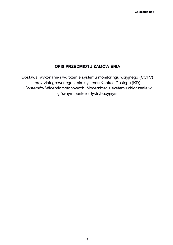 Załącznik nr 8 OPIS PRZEDMIOTU ZAMÓWIENIA Dostawa, wykonanie i wdrożenie systemu monitoringu wizyjnego (CCTV) oraz zintegrowanego z nim systemu Kontroli Dostępu (KD) i Systemów Wideodomofonowych. Modernizacja systemu chłodzenia w głównym punkcie dystrybucyjnym 1 1 INFORMACJE PODSTAWOWE 1.1 PRZEDMIOT ZAMÓWIENIA Przedmiotem zamówienia jest dostawa, wykonanie i wdrożenie systemu monitoringu wizyjnego (CCTV) oraz zintegrowanego z nim systemu Kontroli Dostępu (KD) i Systemów Wideodomofonowych obejmującego: w zakresie CCTV budynki A, A1, B, C, D, E, F, G, H, Z wraz z instalacją okablowania, dostawą szaf i przełączników, w zakresie KD budynki A, A1, B, C, D, E, F wraz z instalacją okablowania, dostawą szaf i przełączników oraz modernizacja systemu chłodzenia w głównym punkcie dystrybucyjnym dla Samodzielnego Publicznego Zakładu Opieki Zdrowotnej w Bielsku Podlaskim. 1.2 KLAUZULA Wykonawca wymienionego zakresu robót, powinien zapoznać się z całością dostępnej dokumentacji i dokonać obliczeń dla poszczególnych zakresów robót, w przypadku stosowania jakichkolwiek rozwiązań systemowych należy przy wycenie uwzględnić wszystkie elementy danego systemu, niezbędne do zrealizowania całości prac, niezależnie od stopnia dokładności i precyzji dokumentów otrzymanych od Zamawiającego definiującej usługę do wykonania, Wykonawca zobowiązany jest do uzyskania dobrego rezultatu końcowego, w związku z powyższym wykonane instalacje muszą zapewnić utrzymanie założonych parametrów, specyfikacje i opisy uwzględniają standard minimalny dla materiałów i instalacji, niezbędny do właściwego funkcjonowania projektowanego obiektu. Wykonawca może zaproponować alternatywne rozwiązania pod warunkiem zachowania minimalnego wymaganego standardu, po uzyskaniu pisemnej akceptacji przez Zamawiającego, wszystkie elementy nie ujęte w niniejszym opracowaniu (opisie, specyfikacji i rysunkach), a zdaniem Wykonawcy niezbędne do prawidłowego działania instalacji muszą być zamontowane i dostarczone, w przypadku błędu, pomyłki lub wątpliwości interpretacyjnych w jakimkolwiek z elementów dokumentacji, Wykonawca, przed złożeniem oferty, powinien wyjaśnić sporne kwestie z Zamawiającym, który jako jedyny jest upoważniony do wprowadzania zmian. Wszelkie niesygnalizowane niejasności będą interpretowane z korzyścią dla Zamawiającego, rysunki należy traktować jako dokumenty pomocnicze do opisu W hierarchii ważności opis funkcjonalny jest wyższej rangi od rysunku, do zakresu prac Wykonawcy wchodzą próby, regulacja, uruchomienia urządzeń i instalacji wg obowiązujących norm i przepisów oraz oddanie ich do użytkowania lub eksploatacji zgodnie z obowiązującym przepisami, zaleceniami Zamawiającego i Producenta. funkcjonalnego. 1.3 WARUNKI DOPUSZCZENIA WYKONAWCÓW DO PRAC Niezbędnym warunkiem do spełnienia przez Wykonawcę prac instalacyjnych, przed przystąpieniem do prac jest przedstawienie następujących dokumentów potwierdzających uprawnienia pracowników: licencja pracownika zabezpieczenia technicznego dla osób nadzorujących prace instalacyjne, uprawnienia SEP, firma wykonująca zadanie powinna posiadać koncesję MSWiA, firma wykonująca zadanie powinna posiadać ubezpieczenie od odpowiedzialności cywilnej wymagane i odpowiednie do przedmiotu zamówienia. 1.4 PRZEDMIOT SPECYFIKACJI TECHNICZNEJ Przedmiotem niniejszej specyfikacji technicznej są wymagania dotyczące wykonania i odbioru robót związanych z układaniem i montażem elementów instalacji KD, CCTV i WD oraz systemu chłodzenia w głównym punkcie dystrybucyjnym. 2 1.5 ZAKRES STOSOWANIA SPECYFIKACJI TECHNICZNEJ Specyfikacja techniczna jest stosowana jako dokument przetargowy przy zlecaniu i realizacji robót wymienionych w pkt. 1.1 Odstępstwa od wymagań podanych w niniejszej specyfikacji mogą mieć miejsce tylko w przypadkach prostych robót o niewielkim znaczeniu, dla których istnieje pewność, że podstawowe wymagania bądź spełnione przy zastosowaniu metod wykonania wynikających z doświadczenia oraz uznanych reguł i zasad sztuki budowlanej. 1.6 PRZEDMIOT Z ZAKRESU ROBÓT OBJĘTYCH SPECYFIKACJĄ TECHNICZNĄ Roboty, których dotyczy specyfikacja obejmują wszystkie czynności umożliwiające i mające na celu wykonanie instalacji Kontroli Dostępu, instalacji Monitoringu Wizyjnego i instalacji wideo domofonowej oraz systemu chłodzenia w głównym punkcie dystrybucyjnym w SPZOZ w Bielsku Podlaskim. Zakres robót obejmuje: zaprojektowanie i montaż systemu chłodzenia w głównym punkcie dystrybucyjnym, ułożenie wszystkich materiałów w sposób i w miejscu zgodnym z dokumentacją techniczną, uruchomienie systemów KD, CCTV i WD i przeszkolenie personelu administrującego danymi systemami, przeprowadzeniem wymaganych prób i badań oraz potwierdzenie protokołami kwalifikującymi montowany element instalacji, prace wykończeniowe. budowę tras kablowych, budowę punktów dystrybucyjnych, wykonanie wszelkich robót pomocniczych w celu przygotowania podłoża (w szczególności roboty murarskie, ślusarsko-spawalnicze, montaż elementów osprzętu instalacyjnego, itp.), układanie kabli i przewodów, montaż kontrolerów KD, okablowanie drzwi z montażem elementów KD, montaż serwera KD, montaż serwerów CCTV, terminowanie kabli w osprzęcie, montaż urządzeń WD, wykonanie oznakowania zgodnego z dokumentacją techniczną wszystkich wyznaczonych kabli i przewodów, 1.7 OKREŚLENIA PODSTAWOWE, DEFINICJE Określenia podane w niniejszej specyfikacji technicznej (ST) są zgodne z odpowiednimi normami oraz określeniami podanymi w ST „Wymagania ogólne” Kod CPV 45000000-7, pkt 1.6. a także podanymi poniżej: Specyfikacja techniczna – dokument zawierający zespół cech wymaganych dla procesu wytwarzania lub dla samego wyrobu, w zakresie parametrów technicznych, jakości, wymogów bezpieczeństwa, wielkości charakterystycznych, a także co do naz