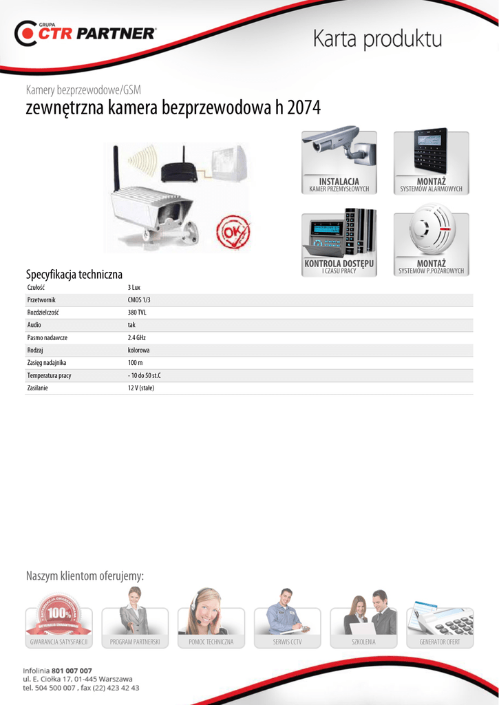 Kamery bezprzewodowe/GSM zewnętrzna kamera bezprzewodowa h 2074 INSTALACJA KAMER PRZEMYSŁOWYCH KONTROLA DOSTĘPU I CZASU PRACY Specyfikacja techniczna Czułość 3 Lux Przetwornik CMOS 1/3 Rozdzielczość 380 TVL Audio tak Pasmo nadawcze 2.4 GHz Rodzaj kolorowa Zasięg nadajnika 100 m Temperatura pracy - 10 do 50 st.C Zasilanie 12 V (stałe) MONTAŻ SYSTEMÓW ALARMOWYCH MONTAŻ SYSTEMÓW P.POŻAROWYCH Naszym klientom oferujemy: GWARANCJA SATYSFAKCJI PROGRAM PARTNERSKI POMOC TECHNICZNA SERWIS CCTV SZKOLENIA GENERATOR OFERT