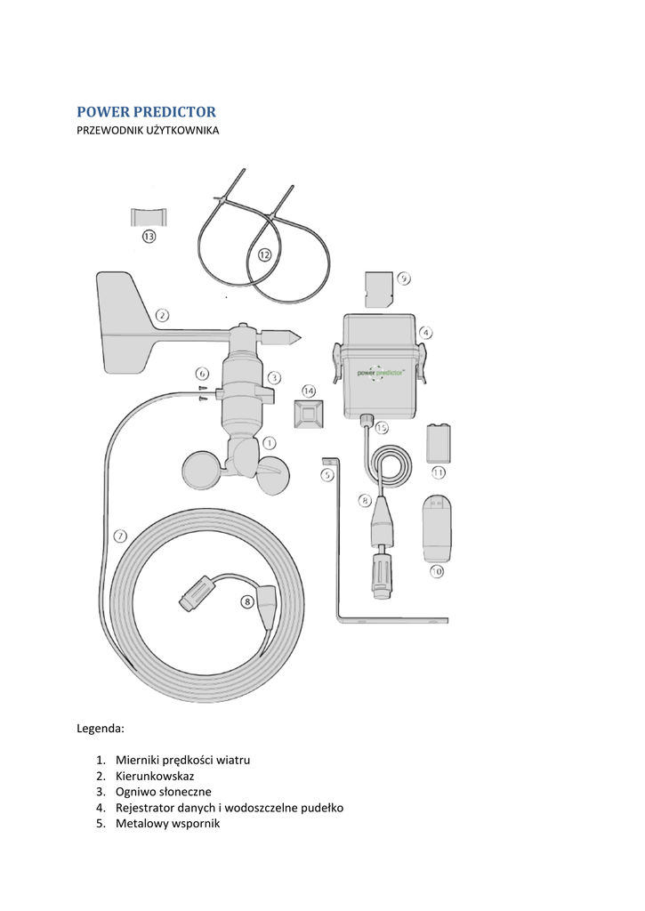 POWER PREDICTOR PRZEWODNIK UŻYTKOWNIKA Legenda: 1. 2. 3. 4. 5. Mierniki prędkości wiatru Kierunkowskaz Ogniwo słoneczne Rejestrator danych i wodoszczelne pudełko Metalowy wspornik 6. 2 śruby Philips 7. Przewód 5 m 8. 2 gumowe osłony przewodów 9. Karta pamięci 10. Czytnik kart USB 11. Kwadratowa bateria 9V 12. Opaski zaciskowe 13. Torebka pochłaniająca wilgoć 14. Samoprzylepny klips 15. Dławik Czego będziesz potrzebował: Śrubokręt Maszt Przedłużacz (w zależności od wysokości masztu) 1. Konfiguracja rejestratora danych a) Włóż baterię Upewnij się, że karta pamięci jest włożona do rejestratora danych. Poluzuj zacisk na dnie pudełka, otwórz pokrywkę i wysuń rejestrator danych, popychając wzdłuż przewodu tak jak jest to wymagane. Wyrównaj baterie z łącznikami i włóż na miejsce. Ekran LCD włączy się automatycznie i zacznie odliczanie: Ekran będzie teraz wyświetlał: Czas- Prędkość wiatru- - wskazanie słoneczne Włóż rejestrator danych z powrotem do wodoszczelnego pudełka, wepchnij nadmiar przewodów (żaden przewód nie powinien być widoczny poza pudełkiem), i ściśnij zacisk, upewniając się, że gumowa uszczelka jest na miejscu. Torebka pochłaniająca wilgoć Wewnątrz wodoszczelnego pudełka jest biała żelowa torebka. Powinna być za każdym razem gdy rejestrator danych absorbuje wilgoć. b) Ustawianie daty i czasu Czas i data powinny być ustawione przed zapisywaniem danych. Naciśnij i puść lewy przycisk raz, aby wejść do ustawień menu. Naciśnij prawy przycisk raz, aby wybrać ustawienia daty. Wciśnij prawy przycisk ponownie aby wybrać rok, kiedy już wybrałeś odpowiedni rok, wciśnij lewy przycisk aby wybrać miesiąc, ponownie użyj prawego przycisku aby wybrać miesiąc. Kiedy odpowiedni miesiąc jest wyświetlony, wciśnij lewy przycisk aby ustawić dzień, przewiń dni tygodnia używając prawego przycisku. Wciśnij lewy przycisk raz, aby opuścić ustawienia. Powrócisz do: Jeśli popełniłeś błąd w ustawieniach daty, wciśnij prawy przycisk ponownie aby wejść do ustawień daty. Aby kontynuować i ustawić czas, wciśnij lewy przycisk. Wciśnij prawy przycisk raz, aby wybrać ustawienia czasu. Użyj tych samych przycisków do ustawienia czasu. Kiedy wyświetlana jest poprawna godzina wciśnij lewy przycisk, aby wyjść z ustawień. Powrócisz do: Jeśli popełniłeś błąd ustawiając czas, wciśnij prawy przycisk jeszcze raz, aby wejść do ustawień czasu i kontynuuj procedurę ustawiania, lub powróć do ekranu głównego i zacznij od początku. c) Ustawienie odliczania Przy ustawieniach domyślnych czas hibernacji jest ustawiony na 5 minut, co oznacza, że rejestrator danych przejdzie w stan uśpienia po 5 minutach i ekran LCD wyłączy się, aby przedłużyć działanie baterii. Można wydłużać ten czas do 10 lub 20 minut, lecz nie jest to zalecane, ponieważ znacznie skraca to żywotność baterii. Aby ustawić czas hibernacji wciśnij lewy przycisk. Użyj lewego i prawego przycisku, jak poprzednio, aby dokonać wyboru. Naciśnij lewy przycisk, aby wyjść z ustawień limitu czasu, naciśnij lewy przycisk ponownie, aby opuścić menu ustawień. d) Ustawienia końcowe Ekran będzie teraz wyświetlał: CzasPrędkość wiatru m/s- -wskazuje czy urządzenie nagrywa -wskazanie słoneczne 2. Zapis danych z badań Zalecamy przeprowadzenie testu od 24 do 48 godzin, aby upewnić się, że zestaw jest skonfigurowany poprawnie zanim zostawimy go do nagrywania na dłuższy okres czasu. a) Podłącz czujnik do metalowego wzmocnienia Przymocuj metalowy wspornik do czujnika za pomocą dwóch dołączonych śrubek tak jak pokazano poniżej. Będziesz potrzebował do tego śrubokręta. b) Podłącz rejestrator danych do czujnika Podłącz męskie i żeńskie wtyczki razem i przekręć aby zablokować. Jeśli masz przedłużacz będziesz musiał połączyć go między czujnikiem i rejestratorem danych. c) Przykryj połączenia przewodów osłoną Pociągnij pokrywę przewodów tak aby pokryć nią styki przewodów. Pokrywa dłuższego przewodu (na styku męskim) powinna być nakryta na krótszy. Jest zalecane, żeby połączenia przewodów były ułożone poziomo z żeńskim połączeniem i krótszym przewodem na górze. d) Lokalizacja Tymczasowo zamontuj Power Predictor w dostępnym miejscu (np. płocie) i pozostaw do zapisu danych energii wiatrowej i słonecznej na co najmniej 24 godziny. e) Włączanie/wyłączanie Prawy przycisk włącza i wyłącza jednostkę. Kiedy wyświetlane jest „R”, jednostka jest w trakcie nagrywania. Aby wyłączyć nagrywanie, wciśnij prawy przycisk i „R” zniknie. Aby rozpocząć nagrywanie naciśnij prawy przycisk ponownie i „R” się pojawi. Bardzo ważne jest wyłączanie jednostki przed wyjęciem karty pamięci. Jeśli jednostka przeszła w stan uśpienia możesz włączyć ekran naciskając lewy lub prawy przycisk. Aby włączyć lub wyłączyć nagrywanie należy wyjść ze stanu uśpienia. 3. Ustaw swoje konto online a) Aktywuj swoje konto Wejdź na stronę www.powerpredictor.com i kliknij „Aktywacja”. Wypełnij formularz aktywacyjny; będzie potrzebny 10-cyfrowy kod aktywacyjny, który znajduje się na końcu instrukcji lub na bocznej stronie pudełka. Po dokonaniu aktywacji konta, otrzymasz e-mail potwierdzający nazwę użytkownika i hasło. b) Dodaj szczegóły Wybierz z paska menu „dodaj nowe miejsce”, i wypełnij formularz. Jeśli twoje miejsce nie ma nazwy ulicy, użyj nazwy najbliższej ulicy. Możesz poruszać pinezką na mapie, aby znaleźć dokładne położenie twojego miejsca - po prostu kliknij, przytrzymaj i przeciągnij. Wysokość masztu powinna być podana w metrach bez podawania jednostki, tak więc 10 metrów powinno być wprowadzone jako „10”, a nie 10 m lub 10 metrów. Jeśli ominiesz pole wysokości, program spróbuje uzupełnić je za Ciebie. Jeśli nie będzie to możliwe, będziesz musiał znaleźć i uzupełnić tą informac