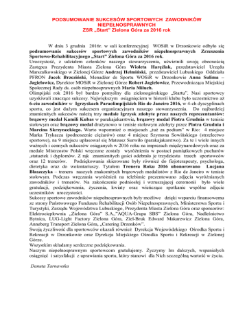PODSUMOWANIE SUKCESÓW SPORTOWYCH ZAWODNIKÓW NIEPEŁNOSPRAWNYCH ZSR „Start” Zielona Góra za 2016 rok W dniu 3 grudnia 2016r. w sali konferencyjnej WOSiR w Drzonkowie odbyło się podsumowanie sukcesów sportowych zawodników niepełnosprawnych Zrzeszenia Sportowo-Rehabilitacyjnego „Start” Zielona Góra za 2016 rok. Uroczystość, z udziałem członków naszego stowarzyszenia, uświetnili swoją obecnością Zastępca Prezydenta Miasta Zielona Góra Wioleta Haręźlak, przedstawiciel Urzędu Marszałkowskiego w Zielonej Górze Andrzej Hełmiński, przedstawiciel Lubuskiego Oddziału PFRON Jacek Brzeziński, Menadżer ds Sportu WOSiR w Drzonkowie Anna Sulima – Jagiełowicz, Dyrektor MOSiR w Zielonej Górze Robert Jagiełowicz, Przewodnicząca Miejskiej Społecznej Rady ds. osób niepełnosprawnych Maria Miłuch. Olimpijski rok 2016 był bardzo pomyślny dla zielonogórskiego „Startu”. Nasi sportowcy uzyskiwali znaczące sukcesy. Największym osiągnięciem w historii klubu było uczestnictwo aż 6-ciu zawodników w Igrzyskach Paraolimpijskich Rio de Janeiro 2016, w 4-ch dyscyplinach sportu, co jest dużym sukcesem organizacyjnym naszego stowarzyszenia. Do najbardziej znamienitych sukcesów należą trzy medale Igrzysk zdobyte przez naszych reprezentantów: brązowy medal Kamili Kubas w parakajakarstwie, brązowy medal Piotra Grudnia w tenisie stołowym oraz brązowy medal drużynowo w tenisie stołowym zdobyty przez Piotra Grudnia i Marcina Skrzyneckiego. Warto wspomnieć o miejscach „tuż za podium” w Rio: 4 miejsce Marka Trykacza (podnoszenie ciężarów) oraz 4 miejsce Szymona Sowińskiego (strzelectwo sportowe), na 9 miejscu uplasował się Mateusz Surwiło (parakajakarstwo). Za te i wiele innych ważnych i cennych sukcesów osiąganych w 2016 roku na imprezach międzynarodowych oraz za medale Mistrzostw Polski wręczone zostały wyróżnienia w postaci pamiątkowych pucharów ,statuetek i dyplomów. Z rąk znamienitych gości odebrało je trzydziestu trzech sportowców oraz 12 trenerów. Podziękowania skierowane były również do fizjoterapeuty, psychologa, dietetyka oraz do wolontariuszy. Tytułem Trenera Roku 2016 uhonorowano Lucjana Błaszczyka – trenera naszych znakomitych brązowych medalistów z Rio de Janeiro w tenisie stołowym. Podczas wręczania wyróżnień na telebimie prezentowano zdjęcia wyróżnianych zawodników i trenerów. Na zakończenie podniosłej i wzruszającej ceremonii było wiele gratulacji, podziękowania, życzenia, kwiaty oraz wieńczące spotkanie wspólne zdjęcie uczestników uroczystości. Sukcesy sportowe zawodników niepełnosprawnych były możliwe dzięki wsparciu finansowemu ze strony Państwowego Funduszu Rehabilitacji Osób Niepełnosprawnych, Ministerstwa Sportu i Turystyki, Zarządu Województwa Lubuskiego, Prezydenta Miasta Zielona Góra oraz sponsorów: Elektrociepłownia „Zielona Góra” S.A.,”AQUA-Grupa SBS” Zielona Góra, Nadleśnictwo Bytnica, LUG-Light Factory Zielona Góra, Ziel-Bruk Edward Makarewicz Zielona Góra, Anneberg Transport Zielona Góra, „Catering Drzonków”. Swoją życzliwość dla sportowców okazali również Dyrekcja Wojewódzkiego Ośrodka Sportu i Rekreacji w Drzonkowie oraz Dyrekcja Miejskiego Ośrodka Sportu i Rekreacji w Zielonej Górze. Wszystkim składamy serdeczne podziękowania. Naszym niepełnosprawnym sportowcom gratulujemy. Życzymy Im dalszych, wspaniałych osiągnięć i satysfakcji z uprawiania sportu, który stanowi dla Nich szczególną wartość w życiu. Danuta Tarnawska NAJWIĘKSZE SUKCESY SPORTOWE ZAWODNIKÓW ZSR START ZIELONA GÓRA w 2016 roku Zrzeszenie Sportowo - Rehabilitacyjne „Start” w Zielonej Górze w 2016 roku prowadziło swoją działalność w zakresie sportu osób niepełnosprawnych w ośmiu sekcjach sportowych: lekkoatletyka, tenis stołowy, podnoszenie ciężarów, pływanie, strzelectwo sportowe, piłka siatkowa, boccia, parakajakarstwo. Stowarzyszenie liczy 116 członków - osób niepełnosprawnych z dysfunkcją narządu ruchu i innymi schorzeniami. Zawodnicy - dzieci, młodzież i osoby dorosłe uczestniczą w systematycznych zajęciach sportowych, które odbywają się w obiektach sportowych: w Zielonej Górze, Drzonkowie, Poznaniu, Małomicach, Wolsztynie. Treningi prowadzi wykwalifikowana kadra trenersko - instruktorska, znająca specyfikę sportu osób niepełnosprawnych (14 osób). Efektem pracy szkoleniowej jest udział sportowców niepełnosprawnych w zawodach sportowych: Igrzyskach Paraolimpijskich, Mistrzostwach Świata, Mistrzostwach Europy, Pucharach Świata, Zawodach Międzynarodowych, Mistrzostwach Polski, ogólnopolskich, regionalnych. 19 zawodników ZSR „Start” Zielona Góra wchodzi w skład kadry narodowej w dyscyplinach sportowych: piłka siatkowa(4), strzelectwo sportowe (3), tenis stołowy (5), boccia (2), podnoszenie ciężarów (2), parakajakarstwo (3). Rok 2016 był bardzo ważny, gdyż odbywały się Igrzyska paraolimpijskie w Rio de Janeiro, sukcesem znakomitym był udział naszych 6-ciu zawodników w czterech dyscyplinach sportowych w tej najważniejszej imprezie sportowej, co jest największym w historii stowarzyszenia osiągnięciem. W 2016 roku nasi zawodnicy brali udział w 58 imprezach. Reprezentacja ZSR START Zielona Góra brała udział w Mistrzostwach Polski w ośmiu dyscyplinach, w których prowadzone jest szkolenie. Nasi zawodnicy zdobyli w 2016 roku ogółem 53 medale (13 złotych, 20 srebrnych, 20 brązowych) w ośmiu dyscyplinach, w tym trzy brązowe medale Igrzysk Paraolimpijskich. Zrzeszenie Sportowo - Rehabilitacyjne „Start” w 2016 roku było organizatorem 8 imprez sportowych, w których uczestniczyło ogółem 525 osób, w tym dwa obozy z udziałem łącznie 60 osób. Integracyjny Turniej Bocci „Puchar Wiosny 2016” - 24.03.2016r. VIII Integracyjne Mistrzostwa Zielonej Góry w bocci - 18.05.2016r. Międzynarodowy Turniej Niepełnosprawnych w piłce siatkowej plażowej - 26-29.05.2016r. Mist