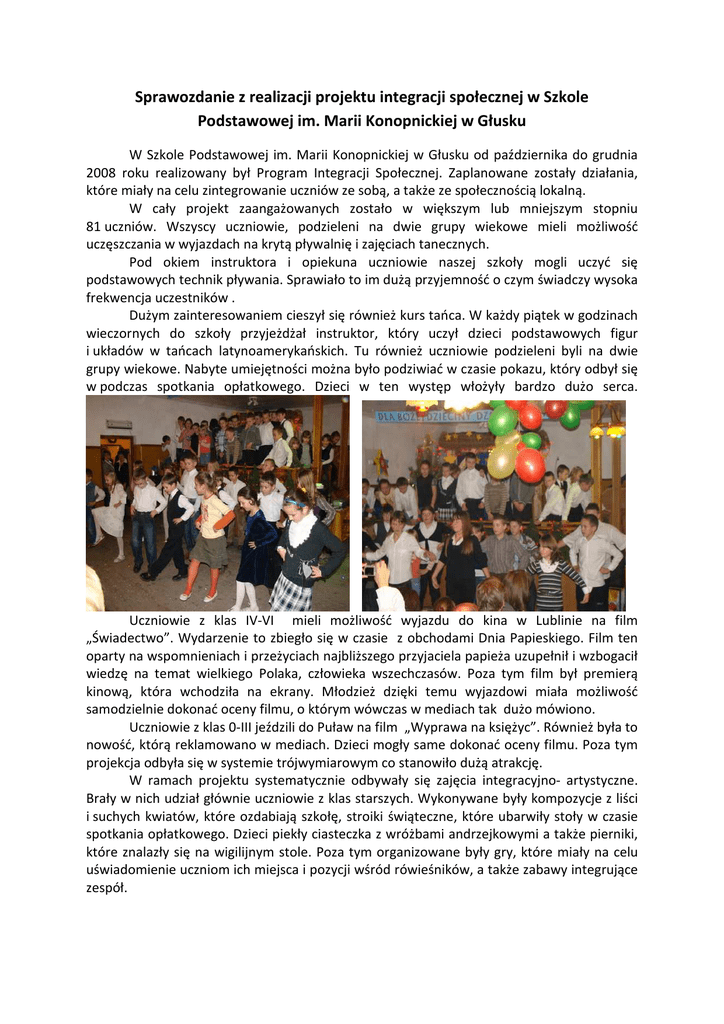 Sprawozdanie z realizacji projektu integracji społecznej w Szkole Podstawowej im. Marii Konopnickiej w Głusku W Szkole Podstawowej im. Marii Konopnickiej w Głusku od października do grudnia 2008 roku realizowany był Program Integracji Społecznej. Zaplanowane zostały działania, które miały na celu zintegrowanie uczniów ze sobą, a także ze społecznością lokalną. W cały projekt zaangażowanych zostało w większym lub mniejszym stopniu 81 uczniów. Wszyscy uczniowie, podzieleni na dwie grupy wiekowe mieli możliwość uczęszczania w wyjazdach na krytą pływalnię i zajęciach tanecznych. Pod okiem instruktora i opiekuna uczniowie naszej szkoły mogli uczyć się podstawowych technik pływania. Sprawiało to im dużą przyjemność o czym świadczy wysoka frekwencja uczestników . Dużym zainteresowaniem cieszył się również kurs tańca. W każdy piątek w godzinach wieczornych do szkoły przyjeżdżał instruktor, który uczył dzieci podstawowych figur i układów w tańcach latynoamerykańskich. Tu również uczniowie podzieleni byli na dwie grupy wiekowe. Nabyte umiejętności można było podziwiać w czasie pokazu, który odbył się w podczas spotkania opłatkowego. Dzieci w ten występ włożyły bardzo dużo serca. Uczniowie z klas IV-VI mieli możliwość wyjazdu do kina w Lublinie na film „Świadectwo”. Wydarzenie to zbiegło się w czasie z obchodami Dnia Papieskiego. Film ten oparty na wspomnieniach i przeżyciach najbliższego przyjaciela papieża uzupełnił i wzbogacił wiedzę na temat wielkiego Polaka, człowieka wszechczasów. Poza tym film był premierą kinową, która wchodziła na ekrany. Młodzież dzięki temu wyjazdowi miała możliwość samodzielnie dokonać oceny filmu, o którym wówczas w mediach tak dużo mówiono. Uczniowie z klas 0-III jeździli do Puław na film „Wyprawa na księżyc”. Również była to nowość, którą reklamowano w mediach. Dzieci mogły same dokonać oceny filmu. Poza tym projekcja odbyła się w systemie trójwymiarowym co stanowiło dużą atrakcję. W ramach projektu systematycznie odbywały się zajęcia integracyjno- artystyczne. Brały w nich udział głównie uczniowie z klas starszych. Wykonywane były kompozycje z liści i suchych kwiatów, które ozdabiają szkołę, stroiki świąteczne, które ubarwiły stoły w czasie spotkania opłatkowego. Dzieci piekły ciasteczka z wróżbami andrzejkowymi a także pierniki, które znalazły się na wigilijnym stole. Poza tym organizowane były gry, które miały na celu uświadomienie uczniom ich miejsca i pozycji wśród rówieśników, a także zabawy integrujące zespół. Dużym wydarzeniem był festyn andrzejkowy. W czasie zabawy zintegrowali się uczniowie klas młodszych i starszych. Przygotowania bardzo wszystkich wciągnęły. Dekoracjami, opracowaniem przebiegu wróżb zajął się Samorząd Uczniowski pod opieką pani Bożeny Popiołek. W czasie tańców starsi uczniowie zajmowali się zabawianiem młodszych kolegów. Wszyscy mieli możliwość poznania swojej przyszłości w trakcie wróżb andrzejkowych. Najwięcej śmiechu było podczas odczytywania umieszczonych w ciasteczkach andrzejkowych przepowiedni. Nawet nauczyciele i rodzice chętnie częstowali się ciasteczkiem z wróżbą. Mikołajki to czas prezentów. Uczestnicy projektu otrzymali w tym dniu upominki w postaci paczek ze słodyczami. Paczuszki zróżnicowane były pod względem wielkości. Dzieci które systematycznie uczęszczały w zajęciach otrzymały bogatsze paczki. Największym przedsięwzięciem było zorganizowanie Spotkania Opłatkowego. Głównym celem spotkania była integracja społeczności wsi, które są w obwodzie naszej szkoły. Ze względu na planowaną ilość uczestników Wigilia odbyła się w remizie strażackiej w Głusku. Zaprosiliśmy uczniów, ich rodziców, pracowników szkoły w Głusku, emerytów i rencistów, przedstawicieli władz gminy, sołtysów okolicznych wiosek, radnych, dyrektorów szkół i Gminnego Ośrodka Kultury w Karczmiskach, władze straży OSP Głusko i Wolica. Stroną kulinarną zajęli się rodzice z poszczególnych klas i to dzięki nim stoły zapełniły się wigilijnymi smakołykami. Pani Anna Walencik przygotowała „Jasełka” a pani Maria Nowaczek zajęła się montażem słowno - muzycznym. W dniu 18.12 2008r. o godzinie 17.00 w remizie OSP w Głusku zrobiło się gwarno. Dzieci w przygotowanych strojach oczekiwały na występ, remiza odświętnie przystrojona wypełniała się gośćmi. Kiedy już wszyscy zasiedli do stołów pani dyrektor Joanna Brzozowska – Samolej powitała przybyłych i przekazała głos młodym wykonawcom. Przedstawienie małych artystów zakręciło łzę w niejednym oku. Szczególnie wzruszający był moment kiedy wszyscy połączyli się za ręce i wspólnie przekazali sobie znak pokoju zgodnie ze słowami pastorałki „Przekażmy sobie znak pokoju…”. Nie zabrakło również fragmentu Pisma Świętego mówiącego o narodzinach Syna Bożego, które przeczytała pani dyrektor. Jak gwiazdki z nieba posypały się życzenia świąteczne składane najpierw przez dzieci, a później przez zaproszonych gości. Sekretarz Gminy pan Edward Rudnicki podkreślił między innymi znaczenie tego spotkania w integracji społecznej, życząc spokojnych i zdrowych świąt. Do jego życzeń dołączył sołtys Głuska pan Jan Kapusta, radny pan Marian Watras i radny, a za razem strażak Wolicy i przedstawiciel Rady Rodziców pan Jacek Bojarski. Odśpiewana została kolęda i wszyscy zaczęli dzielić się opłatkiem. Na zakończenie dzieci popisały się swoimi umiejętnościami tanecznymi a salę rozświetlił błysk fleszy aparatów. Zarówno to spotkanie jak i cała realizacja projektu dostarczyła dzieciom wielu wrażeń. Rodzice również chętnie włączali się do działania. Wszystko to na długo zostawi w pamięci piękne wspomnienia. Chcielibyśmy aby nasza szkoła w przyszłości również miała