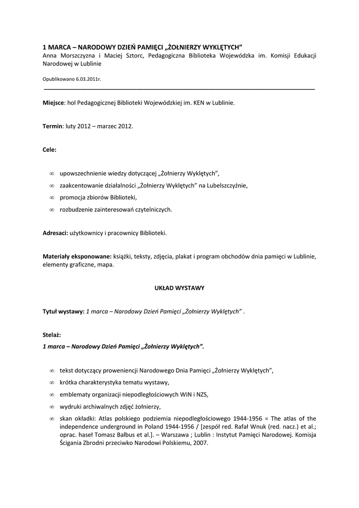 1 MARCA – NARODOWY DZIEŃ PAMIĘCI „ŻOŁNIERZY WYKLĘTYCH” Anna Morszczyzna i Maciej Sztorc, Pedagogiczna Biblioteka Wojewódzka im. Komisji Edukacji Narodowej w Lublinie Opublikowano 6.03.2011r. __________________________________________________________________________________ Miejsce: hol Pedagogicznej Biblioteki Wojewódzkiej im. KEN w Lublinie. Termin: luty 2012 – marzec 2012. Cele: • upowszechnienie wiedzy dotyczącej „Żołnierzy Wyklętych”, • zaakcentowanie działalności „Żołnierzy Wyklętych” na Lubelszczyźnie, • promocja zbiorów Biblioteki, • rozbudzenie zainteresowań czytelniczych. Adresaci: użytkownicy i pracownicy Biblioteki. Materiały eksponowane: książki, teksty, zdjęcia, plakat i program obchodów dnia pamięci w Lublinie, elementy graficzne, mapa. UKŁAD WYSTAWY Tytuł wystawy: 1 marca – Narodowy Dzień Pamięci „Żołnierzy Wyklętych” . Stelaż: 1 marca – Narodowy Dzień Pamięci „Żołnierzy Wyklętych”. • tekst dotyczący proweniencji Narodowego Dnia Pamięci „Żołnierzy Wyklętych”, • krótka charakterystyka tematu wystawy, • emblematy organizacji niepodległościowych WiN i NZS, • wydruki archiwalnych zdjęć żołnierzy, • skan okładki: Atlas polskiego podziemia niepodległościowego 1944-1956 = The atlas of the independence underground in Poland 1944-1956 / [zespół red. Rafał Wnuk (red. nacz.) et al.; oprac. haseł Tomasz Balbus et al.]. – Warszawa ; Lublin : Instytut Pamięci Narodowej. Komisja Ścigania Zbrodni przeciwko Narodowi Polskiemu, 2007. Tablica ogłoszeniowa: • plakat promujący obchody Narodowego Dnia Pamięci „Żołnierzy Wyklętych”, • program obchodów Narodowego Dnia Pamięci „Żołnierzy Wyklętych” w Lublinie. Gablota 1: „Żołnierze Wyklęci” na Lubelszczyźnie. Książki ze zbiorów PBW w Lublinie: • Księgi więzienia na Zamku w Lublinie 1944-1954. T. 1, Księga główna więźniów śledczych 9 X-11 XII 1944 / red. i oprac. Andrzej T. Filipek, Marcin Krzysztofik ; Instytut Pamięci Narodowej Komisja Ścigania Zbrodni przeciwko Narodowi Polskiemu. Oddział w Lublinie. – Lublin: Instytut Pamięci Narodowej - Komisja Ścigania Zbrodni przeciwko Narodowi Polskiemu. Oddział, 2009. • Lubelski Okręg AK - DSZ i WiN 1944-1947 / Rafał Wnuk. – Warszawa : "Volumen", 2000. • Podziemie polityczno-wojskowe w Inspektoracie Lublin w latach 1944-1956 / Piotr Gawryszczak ; przedm. Tomasz Strzembosz. – Lublin : "Norbertinum", 1998. • Rok pierwszy : powstanie i działalność aparatu bezpieczeństwa publicznego na Lubelszczyźnie (lipiec 1944 - czerwiec 1945) / wstęp Sławomir Poleszak ; wybór i oprac. Leszek Pietrzak [et al.]. – Warszawa : Instytut Pamięci Narodowej - Komisja Ścigania Zbrodni przeciwko Narodowi Polskiemu, 2004. • Studium zniewalania : walka aparatu bezpieczeństwa z polskim zbrojnym podziemiem niepodległościowym na Lubelszczyźnie (1944-1947) / Anna Grażyna Kister. – Kraków: "Arcana", 2005. Gablota 2: Józef Franczak „Lalek” - ostatni partyzant. • historia działalności partyzanckiej Józefa Franczaka, • wydruk archiwalnego zdjęcia Józefa Franczaka, • zdjęcia pomnika Józefa Franczaka „Lalka” w Piaskach (woj. lubelskie), • wydruk emblematu Armii Krajowej. Gablota 3: Miejsce kaźni „Żołnierzy Wyklętych”. Nieznany obóz UB i NKWD w Krzesimowie. • tekst opisujący historię działalności obozu w Krzesimowie, • zdjęcia obozu i miejsca pochówku pomordowanych więźniów, • mapka z zaznaczonym położeniem Krzesimowa w okolicy Lublina.
