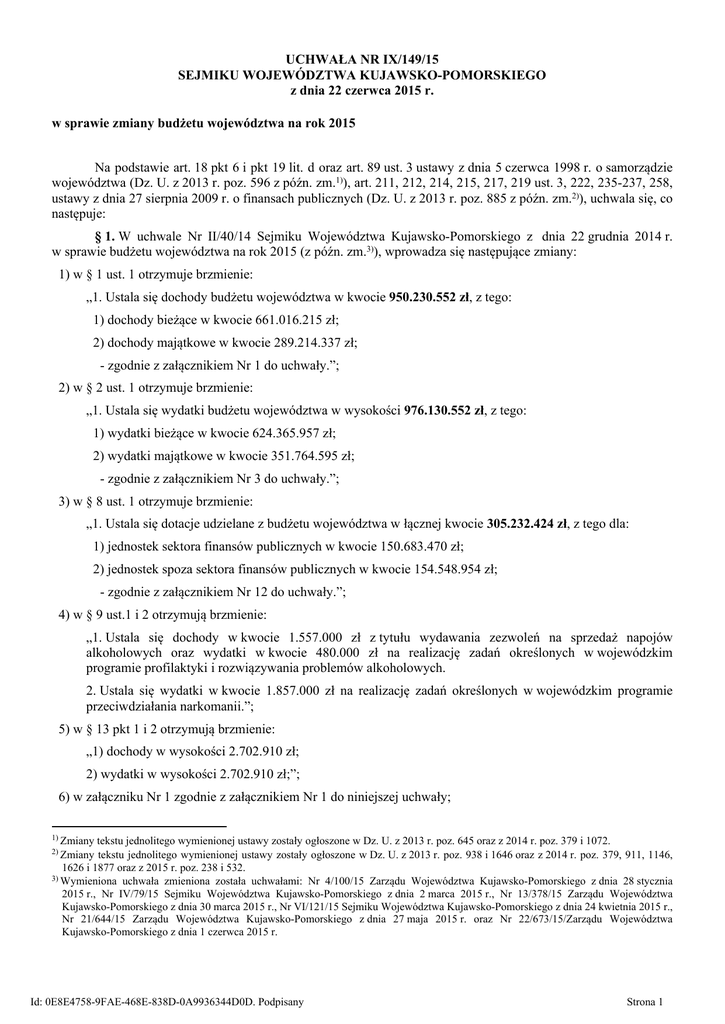 UCHWAŁA NR IX/149/15 SEJMIKU WOJEWÓDZTWA KUJAWSKO-POMORSKIEGO z dnia 22 czerwca 2015 r. w sprawie zmiany budżetu województwa na rok 2015 Na podstawie art. 18 pkt 6 i pkt 19 lit. d oraz art. 89 ust. 3 ustawy z dnia 5 czerwca 1998 r. o samorządzie województwa (Dz. U. z 2013 r. poz. 596 z późn. zm.1)), art. 211, 212, 214, 215, 217, 219 ust. 3, 222, 235-237, 258, ustawy z dnia 27 sierpnia 2009 r. o finansach publicznych (Dz. U. z 2013 r. poz. 885 z późn. zm.2)), uchwala się, co następuje: § 1. W uchwale Nr II/40/14 Sejmiku Województwa Kujawsko-Pomorskiego z dnia 22 grudnia 2014 r. w sprawie budżetu województwa na rok 2015 (z późn. zm.3)), wprowadza się następujące zmiany: 1) w § 1 ust. 1 otrzymuje brzmienie: „1. Ustala się dochody budżetu województwa w kwocie 950.230.552 zł, z tego: 1) dochody bieżące w kwocie 661.016.215 zł; 2) dochody majątkowe w kwocie 289.214.337 zł; - zgodnie z załącznikiem Nr 1 do uchwały.”; 2) w § 2 ust. 1 otrzymuje brzmienie: „1. Ustala się wydatki budżetu województwa w wysokości 976.130.552 zł, z tego: 1) wydatki bieżące w kwocie 624.365.957 zł; 2) wydatki majątkowe w kwocie 351.764.595 zł; - zgodnie z załącznikiem Nr 3 do uchwały.”; 3) w § 8 ust. 1 otrzymuje brzmienie: „1. Ustala się dotacje udzielane z budżetu województwa w łącznej kwocie 305.232.424 zł, z tego dla: 1) jednostek sektora finansów publicznych w kwocie 150.683.470 zł; 2) jednostek spoza sektora finansów publicznych w kwocie 154.548.954 zł; - zgodnie z załącznikiem Nr 12 do uchwały.”; 4) w § 9 ust.1 i 2 otrzymują brzmienie: „1. Ustala się dochody w kwocie 1.557.000 zł z tytułu wydawania zezwoleń na sprzedaż napojów alkoholowych oraz wydatki w kwocie 480.000 zł na realizację zadań określonych w wojewódzkim programie profilaktyki i rozwiązywania problemów alkoholowych. 2. Ustala się wydatki w kwocie 1.857.000 zł na realizację zadań określonych w wojewódzkim programie przeciwdziałania narkomanii.”; 5) w § 13 pkt 1 i 2 otrzymują brzmienie: „1) dochody w wysokości 2.702.910 zł; 2) wydatki w wysokości 2.702.910 zł;”; 6) w załączniku Nr 1 zgodnie z załącznikiem Nr 1 do niniejszej uchwały; 1) Zmiany tekstu jednolitego wymienionej ustawy zostały ogłoszone w Dz. U. z 2013 r. poz. 645 oraz z 2014 r. poz. 379 i 1072. tekstu jednolitego wymienionej ustawy zostały ogłoszone w Dz. U. z 2013 r. poz. 938 i 1646 oraz z 2014 r. poz. 379, 911, 1146, 1626 i 1877 oraz z 2015 r. poz. 238 i 532. 3) Wymieniona uchwała zmieniona została uchwałami: Nr 4/100/15 Zarządu Województwa Kujawsko-Pomorskiego z dnia 28 stycznia 2015 r., Nr IV/79/15 Sejmiku Województwa Kujawsko-Pomorskiego z dnia 2 marca 2015 r., Nr 13/378/15 Zarządu Województwa Kujawsko-Pomorskiego z dnia 30 marca 2015 r., Nr VI/121/15 Sejmiku Województwa Kujawsko-Pomorskiego z dnia 24 kwietnia 2015 r., Nr 21/644/15 Zarządu Województwa Kujawsko-Pomorskiego z dnia 27 maja 2015 r. oraz Nr 22/673/15/Zarządu Województwa Kujawsko-Pomorskiego z dnia 1 czerwca 2015 r. 2) Zmiany Id: 0E8E4758-9FAE-468E-838D-0A9936344D0D. Podpisany Strona 1 7) w załączniku Nr 2 zgodnie z załącznikiem Nr 2 do niniejszej uchwały; 8) w załączniku Nr 3 zgodnie z załącznikiem Nr 3 do niniejszej uchwały; 9) w załączniku Nr 4 zgodnie z załącznikiem Nr 4 do niniejszej uchwały; 10) w załączniku Nr 5 zgodnie z załącznikiem Nr 5 do niniejszej uchwały; 11) w załączniku Nr 6 zgodnie z załącznikiem Nr 6 do niniejszej uchwały; 12) w załączniku Nr 8 zgodnie z załącznikiem Nr 7 do niniejszej uchwały; 13) w załączniku Nr 10 zgodnie z załącznikiem Nr 8 do niniejszej uchwały; 14) w załączniku Nr 11 zgodnie z załącznikiem Nr 9 do niniejszej uchwały; 15) w załączniku Nr 12 zgodnie z załącznikiem Nr 10 do niniejszej uchwały; 16) w załączniku Nr 13 zgodnie z załącznikiem Nr 11 do niniejszej uchwały; 17) w załączniku Nr 15 zgodnie z załącznikiem Nr 12 do niniejszej uchwały; 18) w załączniku Nr 16 zgodnie z załącznikiem Nr 13 do niniejszej uchwały. § 2. Wykonanie uchwały powierza się Zarządowi Województwa Kujawsko-Pomorskiego. § 3. Uchwała podlega publikacji w Dzienniku Urzędowym Województwa Kujawsko-Pomorskiego. § 4. Uchwała wchodzi w życie z dniem podjęcia. Przewodniczący Sejmiku Ryszard Bober Id: 0E8E4758-9FAE-468E-838D-0A9936344D0D. Podpisany Strona 2 Załącznik Nr 1 do Uchwały Nr IX/149/15 Sejmiku Województwa z dnia 22.06.2015 r. W załączniku Nr 1 "Dochody budŜetu Województwa Kujawsko-Pomorskiego wg źródeł pochodzenia. Plan na rok 2015" do uchwały Nr II/40/14 Sejmiku Województwa Kujawsko-Pomorskiego z dnia 22 grudnia 2014 r. w sprawie budŜetu na rok 2015 (z późn. zm.), wprowadza się następujące zmiany: w złotych Dotacje i środki na finansowanie: Dział 1 Nazwa Ogółem 2 DOCHODY BIEśĄCE 600 TRANSPORT I ŁĄCZNOŚĆ 710 DZIAŁALNOŚĆ USŁUGOWA 750 ADMINISTRACJA PUBLICZNA Pozostałe zadań z udziałem środków z budŜetu Unii Europejskiej dochody własne i innych źródeł zagranicznych uzyskiwane z budŜetu państwa - budŜet przez z budŜetu środków krajowych od jednostek Województwo państwa z funduszy samorządu i jednostki celowych budŜet środków na finansowanie na finansowanie terytorialnego budŜetowe europejskich części unijnej części krajowej Udziały w podatkach i subwencje 3 4 5 6 7 8 9 zadań pozostałych z innych źródeł zagranicznych 10 11 od jednostek samorządu terytorialnego z budŜetu państwa 12 13 z funduszy celowych 14 a 664 236 906 405 886 126 36 616 527 74 336 747 37 314 000 21 873 406 0 265 401 1 395 321 77 703 898 4 481 632 4 363 848 b -3 220 691 0 -2 984 208 0 0 0 0 0 -185 663 15 000 0 -65 820 c 661 016 215 405 886 126 33 632 319 74 336 747 37 314 000 21 873 406 0 265 401 1 209 658 77 718 898 4 481 632 4 298 028 a 73 603 242 0 15 901 450 670 181 0 0 0 0 0 56 852 198 179 413 0 b -3 070 500 0 -3 070 500 0 0 0 0 0 0 0 0 0 c 70 532 742 0 12 830 950 670 181 0 0
