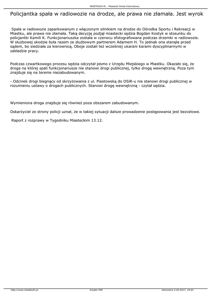 MIASTKO24.PL - Miastecki Portal Internetowy Policjantka spała w radiowozie na drodze, ale prawa nie złamała. Jest wyrok Spała w radiowozie zaparkowanym z włączonym silnikiem na drodze do Ośrodka Sportu i Rekreacji w Miastku, ale prawa nie złamała. Taką decyzję podjął miastecki sędzia Bogdan Kostyk w stosunku do policjantki Kamili K. Funkcjonariuszka została w czerwcu sfotografowana podczas drzemki w radiowozie. W służbowej skodzie była razem ze służbowym partnerem Adamem H. To jednak ona stanęła przed sądem, bo siedziała za kierownicą. Oboje zostali też wcześniej ukarani karami dyscyplinarnymi w zakładzie pracy. Podczas czwartkowego procesu sędzia odczytał pismo z Urzędu Miejskiego w Miastku. Okazało się, że droga na której spali funkcjonariusze nie stanowi drogi publicznej, tylko drogę wewnętrzną. Poza tym znajduje się na terenie niezabudowanym. - Odcinek drogi biegnący od skrzyżowania z ul. Piastowską do OSiR-u nie stanowi drogi publicznej w rozumieniu ustawy o drogach publicznych. Stanowi drogę wewnętrzną - czytał sędzia. Wymieniona droga znajduje się również poza obszarem zabudowanym. Oskarżyciel ze strony policji uznał, że w takiej sytuacji dalsze prowadzenie postępowania jest bezcelowe. Raport z rozprawy w Tygodniku Miasteckim 13.12. http://www.miastko24.pl Kreator PDF Utworzono 2-03-2017, 19:03
