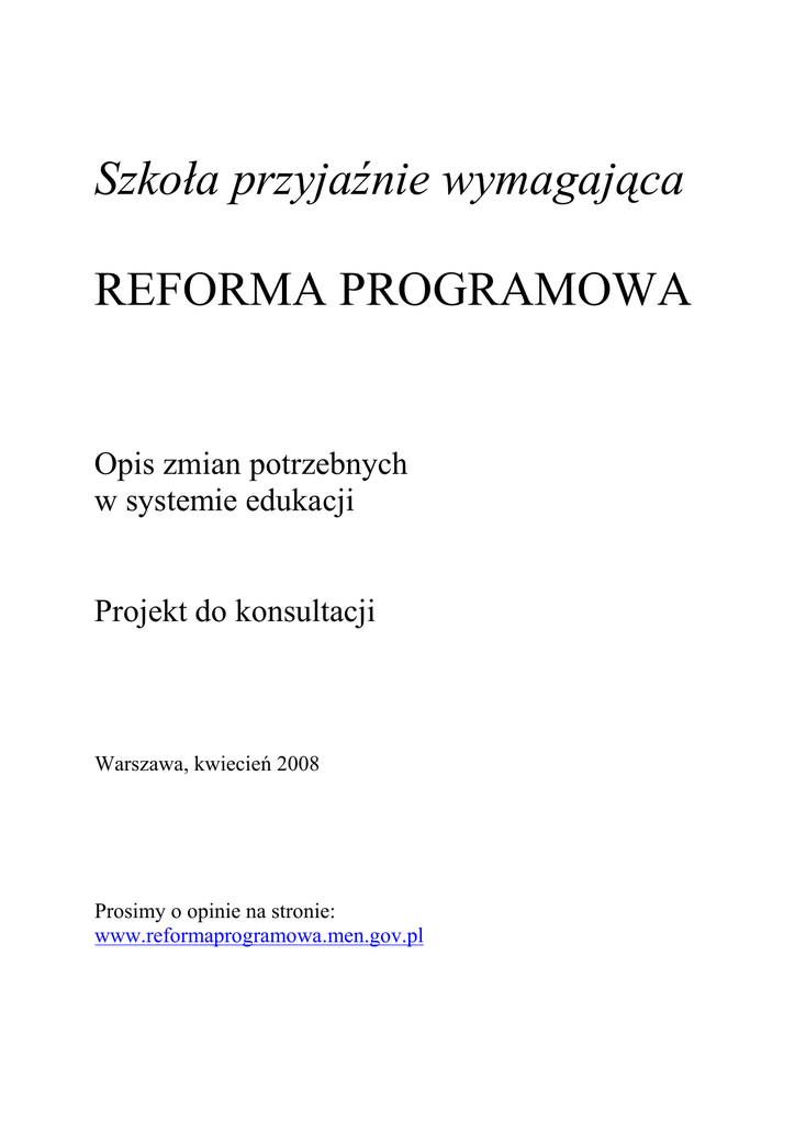 Szkoła przyjaźnie wymagająca REFORMA PROGRAMOWA Opis zmian potrzebnych w systemie edukacji Projekt do konsultacji Warszawa, kwiecień 2008 Prosimy o opinie na stronie: www.reformaprogramowa.men.gov.pl Szanowni Państwo! Chcemy, aby polska szkoła była przyjaźnie wymagająca – to znaczy dająca wszystkim dzieciom równe szanse dostępu do edukacji, zapewniająca uczniom poczucie bezpieczeństwa i sprzyjająca rozwojowi ich indywidualnych zainteresowań, a takŜe klarownie formułująca wymagania, których spełnienie przyniesie satysfakcjonujące efekty kształcenia. Proponowana reforma programowa została zaprojektowana przez zespół ekspertów tak, by osiągnąć powyŜsze cele. Na stronie internetowej www.reformaprogramowa.men.gov.pl znajdą Państwo opis planowanych zmian organizacyjnych oraz obszerne fragmenty przygotowywanego dokumentu: podstawa programowa kształcenia ogólnego dla przedszkoli, szkół podstawowych, gimnazjów i szkół pogimnazjalnych, a takŜe narzędzie do zgłaszania uwag i opinii. Serdecznie zapraszam do zapoznania się z projektem i wyraŜenia o nim swojej opinii. Bardzo liczę na pomoc wszystkich środowisk, którym leŜy na sercu jakość polskiej oświaty. Katarzyna Hall JAKA MA BYĆ POLSKA OŚWIATA? RÓWNY START Chcemy, aby polska szkoła była przyjaźnie wymagająca. Szczególnie zaleŜy nam na tym, aby była bardziej przyjazna dla uczniów i ich rodziców. By zapewnić równy start wszystkim dzieciom podejmującym naukę w rozpoczynających reformę programową klasach zadbamy o to, by podręczniki były tam za darmo. Zakupimy podręczniki dla wszystkich pierwszaków w szkole podstawowej i w gimnazjum. W naszych działaniach przygotowujących zmiany zwracamy szczególną uwagę na równy dostęp do edukacji. Zamierzamy dać wszystkim dzieciom równe szanse, chcemy zadbać o ich bezpieczeństwo i zapewnić dobre efekty edukacyjne na wszystkich poziomach kształcenia. Proponowana reforma programowa została zaprojektowana tak, by osiągnąć powyŜsze cele. Jej głównymi przesłankami są: • Skuteczniejsze wyrównywanie szans edukacyjnych, poprzez zapewnienie lepszego dostępu najmłodszych dzieci do edukacji. • Poprawa efektów kształcenia na dwóch ostatnich etapach edukacyjnych. • Podniesienie rangi nauczania języków obcych w polskich szkołach. • WdroŜenie elastyczniejszego modelu kształcenia, lepiej dopasowanego do indywidualnych potrzeb i zdolności uczniów. WaŜnym celem naszych działań są zmiany dotyczące zerówek i szkół podstawowych, a więc najmłodszych dzieci. Od paru lat dzieci sześcioletnie objęte są obowiązkiem nauki. Przechodząc z zerówki do szkoły uczeń powtarza w pierwszej klasie prawie to samo, czego uczył się w zerówce. Zmienimy to, aby uczniowie nie powtarzali juŜ zrealizowanego materiału. Rodzice obawiają się, czy dzieci w nowej szkole będą bezpieczne. Obecnie nie wszystkie szkoły są przystosowane do tego, by zaopiekować się dzieckiem, zwłaszcza małym. Rodzice sześciolatka będą mogli wystąpić o opóźnienie startu szkolnego swojego dziecka. Pozostawiamy tu rodzicom prawo decyzji. To rodzic będzie mógł decydować o odroczeniu posłania sześciolatka do szkoły. Skierowanie sześciolatków z obowiązkowych zerówek do klas pierwszych w szkołach podstawowych będzie połączone z przeniesieniem do szkoły przedszkolnego standardu opieki nad nimi. Chcemy, by wysokie standardy opieki nad małymi dziećmi obowiązywały we wszystkich szkołach. Naszym priorytetem jest zapewnienie takiej samej jak w przedszkolu opieki po zajęciach szkolnych nad najmłodszymi uczniami. Nowy standard opieki po zajęciach będzie dostępny równieŜ dla dzieci starszych klas szkoły podstawowej. Wzmocnienie funkcji opiekuńczej szkoły pozwoli na istotne wsparcie rodziców pracujących. Chcemy takŜe złączyć programowo gimnazjum i szkołę pogimnazjalną. Celem tej zmiany jest przede wszystkim unowocześnienie programu szkoły i uniknięcie powtórzeń treści programowych. ZaleŜy nam na zwiększeniu moŜliwości indywidualizacji nauki pozwalającej na zróŜnicowanie programu w zaleŜności od zainteresowań ucznia. Chcemy stworzyć takie rozwiązania organizacyjne, które będą sprzyjały systematycznemu wdraŜaniu młodego człowieka do świadomego dokonywania wyboru. Uczniowie gimnazjum i szkoły pogimnazjalnej powinni mieć większe moŜliwości uzupełniania obowiązkowych zajęć, zarówno o zajęcia rozwijające ich indywidualne pasje i zainteresowania, jak i o zajęcia dopełniające wiedzę szkolną z dziedzin nieobjętych rozszerzonym programem kształcenia. Naszym priorytetem jest teŜ doprowadzenie do sytuacji, w której – po raz pierwszy w powojennej historii – uczeń kończący szkołę będzie posługiwał się na poziomie zaawansowanym przynajmniej jednym językiem obcym. Ponadto od poziomu gimnazjum obowiązkowe będzie nauczanie dwóch języków obcych, w tym jednego kontynuowanego. Oczekujemy, Ŝe dzięki tym zmianom do roku 2015 edukacja przedszkolna i wczesnoszkolna będą dobrze przygotowywać uczniów do nauki szkolnej. Działania na rzecz jakości edukacji zaowocują lepszym przygotowaniem uczniów do studiów i aktywności na rynku pracy. Poprawimy równieŜ poziom kształcenia i dzięki temu doprowadzimy do poprawy wyników polskich uczniów w międzynarodowych badaniach porównawczych PISA. Zgodnie z potrzebami gospodarki i rynku pracy podwoi się liczba maturzystów wybierających kierunki ścisłe i techniczne. REFORMA PROGRAMOWA JAKOŚĆ I ZAUFANIE Główna zasada przyjęta w przedstawianej wizji programowej to JAKOŚĆ I ZAUFANIE. Proponowane zmiany pozwolą kaŜdemu nauczycielowi polegać na tym, Ŝe ten, kto uczył jego uczniów wcześniej, miał odpowiednie warunki i moŜliwości, by z troską o jakość nauczyć ich przynajmniej tego, co jest wymagane. Jednocześnie sam będzie mógł realizować swoje zadania tak, aby nauczyciel uczący na etapie nast