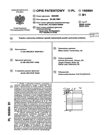RZECZPOSPOLITA POLSKA (12) OPIS PATENTOWY (19)PL (11)166884 (13)B1 (21) Numer zgłoszenia: 294366 (22) Data zgłoszenia: 03.09.1991 (86) Data i numer zgłoszenia międzynarodowego: 03.09.1991,PCT/DE91/00699 Urząd Patentowy Rzeczypospolitej Polskiej (5 4 ) (87) Data i numer publikacji zgłoszenia międzynarodowego: 19.03.1992, W092/04247, PCT Gazette 07/92 B65D 43/04 B65D 8/04 nr Puszka z pokrywką wciskaną i sposób wytwarzania puszki z pokrywką wciskaną (30) Pierwszeństwo: 11.09.1990,DE,P 4029146. (43) Zgłoszenie ogłoszono: 21.09.1992 BUP 19/92 (45) O udzieleniu patentu ogłoszono: 30.06.1995 WUP 06/95 (73) Uprawniony z patentu: Effem GmbH, Verden/Aller, DE (72) Twórcy wynalazku: Eckhart Schormair, Otersen, DE Jürgen Pönisch, Brühl, DE Rainer Laaf, Hellenthal, DE (74) Pełnomocnik: Dziamowska Monika, PHZ POLSERVICE (57)1. Puszka z pokrywką wciskaną, zawierająca co ajmniej jednoczęściow y korpus i pokrywkę, która razem z um ieszczonym na końcu korpusu, elementem n PL 166884 B1 ( 5 1 ) In tC l6: korpusu, dostosow anym d o zamykania, tworzy szczelne zamknięcie, przy czym pom iędzy korpusem i pokrywką znajduje się szczelina dźwigniowa do zaczepiania dźwigni, za pom ocą której pokryw ka m oże zostać wyważona, w której pokrywka posiada obw odow ą sprężynującą wargę zazębiającą, w chodzącą w stanie wstępnie naprężonym do dopasow anego do kształtu wargi zazębiającej rowka elem entu korpusu, znamienna tym, że warga zazębiająca (8) um ieszczona jest na zewnętrznym końcu poziom ego kołnierza pierścieniowego (9) pokrywy (4, 4', 4", 4'"), współpracującego z elem entem (6 ,6 0 'korpusu (2) puszki (1), dostosow anym do zam ykania, przy czym kołnierz pierścieniowy (9) jest ukształtow any na końcu sprężynującego ramienia (11) górnej części (5) pokrywki (4 ,4 ', 4", 4'"), a powyżej tego kołnierza pierścieniowego (9) znajduje się obw odow y rowek (12) do siłow ego uchwycenia dźwigni (14), stanowiący elem ent szczeliny dźwigniowej. 15. Sposób wytwarzania puszki z pokrywką wciskaną, hermetycznie zamykanej, zawierającej co najmniej jednoczęściow y korpus i pokrywkę, w której pokrywka tworzy wraz z um ieszczonym na końcu korpusu elem entem , dostosowanym do zamykania, szczelne zam knięcie, znamienne tym, że w elemencie umieszczonym na końcu korpusu wykonuje się górny rowek w ytłoczony prom ieniow o do wewnątrz, bezpośrednio powyżej rowka zam ykającego korpusu puszki, przy czym ten górny rowek pogłębia się dodatkow o po dołączeniu pokrywki w celu ustalenia optym alnej proporcji pom iędzy oporem w ciskania i otwierania zależnie od specyfiki materiału, wymiarów i/lu b materiału wypełniającego. Fig.1 Puszka z pokrywką wciskaną i sposób wytwarzania puszki z pokrywką wciskaną Zastrzeżenia patentowe 1. Puszka z pokrywką wciskaną, zawierająca co najmniej jednoczęściowy korpus i pokrywkę, która razem z umieszczonym na końcu korpusu, elementem korpusu, dostosowanym do zamykania, tworzy szczelne zamknięcie, przy czym pomiędzy korpusem i pokrywką znajduje się szczelina dźwigniowa do zaczepiania dźwigni, za pomocą której pokrywka może zostać wyważona, w której pokrywka posiada obwodową sprężynującą wargę zazębiającą, wchodzącą w stanie wstępnie naprężonym do dopasowanego do kształtu wargi zazębiającej rowka elementu korpusu, znamienna tym, że warga zazębiająca (8) umieszczona jest na zewnętrznym końcu poziomego kołnierza pierścieniowego (9) pokrywy (4, 4', 4", 4"'), współpracującego z elementem (6, 6') korpusu (2) puszki (1), dostosowanym do zamykania, przy czym kołnierz pierścieniowy (9) jest ukształtowany na końcu sprężynującego ramienia (11) górnej części (S) pokrywki (4, 4', 4", 4"'), a powyżej tego kołnierza pierścieniowego (9) znajduje się obwodowy rowek (12) do siłowego uchwycenia dźwigni (14), stanowiący element szczeliny dźwigniowej. 2. Puszka według zastrz. 1, znamienna tym, że rowek zamykający (10, 1O') elementu (6) korpusu (2) puszki (1) jest wytłoczony w kierunku na zewnątrz. 3. Puszka według zastrz. 2, znamienna tym, że pod rowkiem zamykającym (10,10') ma rowek dolny (18) wytłoczony w kierunku do wewnątrz. 4. Puszka według zastrz. 2, znamienna tym, że nad rowkiem zamykającym (10,10') ma rowek górny (20) wytłoczony w kierunku do wewnątrz. 5. Puszka według zastrz. 3 albo 4, znamienna tym, że pomiędzy rowkiem zamykającym (10, 10') korpusu (2) i wargą zazębiającą (8, 8') pokrywy (4, 4', 4", 4'") ma umieszczony środek uszczelniający (22). 6. Puszka według zastrz. 1, znamienna tym, że końcowy element (6, 6') puszki (1) stanowi jedną całość z korpusem (2) puszki (1). 7. Puszka według zastrz. 1, znamienna tym, że element (6, 6') puszki (1) jest połączony ze znajdującym się od strony zamknięcia końcem korpusu (2) za pomocą zamknięcia (24) na podwójną zakładkę. 8. Puszka według zastrz. 1, znamienna tym, że warga zazębiająca (8) jest wykonana przez zawinięcie krawędzi pokrywki (4, 4', 4", 4'"). 9. Puszka według zastrz. 1, znamienna tym, że szerokość szczeliny dźwigniowej (26) co najmniej na części (28) obwodu jest zmniejszona i że naprzeciwko obszaru o zmniejszonej szerokości szczeliny znajduje się obszar (30) do wprowadzania dźwigni zazębiającej. 10. Puszka według zastrz. 1, znamienna tym, że oś (32) odchylenia wargi zazębiającej (8,8') leży powyżej płaszczyzny wyznaczonej przez rowek zamykający (10,10'). 11. Puszka według zastrz. 10, znamienna tym, że oś (32) odchylania wargi zazębiającej (8,8') przebiega na krańcu krawędzi górnej części górnej (5) pokrywki, bezpośrednio obok szczeliny dźwigniowej (26). 12. Puszka według zastrz. 1, znamienna tym, że krawędź górna (16) korpusu (2) jest zawinięta w kierunku do wewnątrz i tworzy powierzchnię oporową dla pokrywki (4, 4', 4", 4'"). 13. Puszka według zastrz. 9, znamienna tym, że szerokość szczeliny
