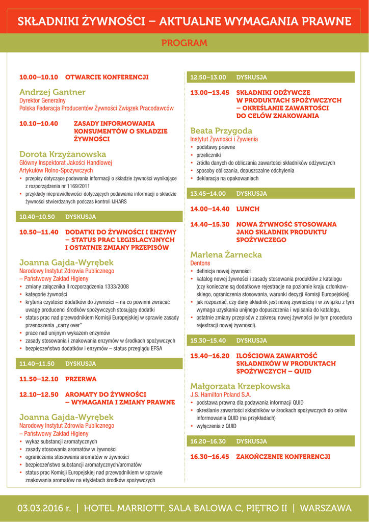 SKŁADNIKI ŻYWNOŚCI – AKTUALNE WYMAGANIA PRAWNE PROGRAM 10.00–10.10 OTWARCIE KONFERENCJI Andrzej Gantner 12.50–13.00 DYSKUSJA 13.00–13.45 SKŁADNIKI ODŻYWCZE W PRODUKTACH SPOŻYWCZYCH – OKREŚLANIE ZAWARTOŚCI DO CELÓW ZNAKOWANIA Dyrektor Generalny Polska Federacja Producentów Żywności Związek Pracodawców 10.10–10.40 ZASADY INFORMOWANIA KONSUMENTÓW O SKŁADZIE ŻYWNOŚCI Dorota Krzyżanowska Główny Inspektorat Jakości Handlowej Artykułów Rolno-Spożywczych przepisy dotyczące podawania informacji o składzie żywności wynikające z rozporządzenia nr 1169/2011 przykłady nieprawidłowości dotyczących podawania informacji o składzie żywności stwierdzanych podczas kontroli IJHARS 10.40–10.50 DYSKUSJA 10.50–11.40 DODATKI DO ŻYWNOŚCI I ENZYMY – STATUS PRAC LEGISLACYJNYCH I OSTATNIE ZMIANY PRZEPISÓW Joanna Gajda-Wyrębek Narodowy Instytut Zdrowia Publicznego – Państwowy Zakład Higieny zmiany załącznika II rozporządzenia 1333/2008 kategorie żywności kryteria czystości dodatków do żywności – na co powinni zwracać uwagę producenci środków spożywczych stosujący dodatki status prac nad przewodnikiem Komisji Europejskiej w sprawie zasady przenoszenia „carry over” prace nad unijnym wykazem enzymów zasady stosowania i znakowania enzymów w środkach spożywczych bezpieczeństwo dodatków i enzymów – status przeglądu EFSA 11.40–11.50 DYSKUSJA 11.50–12.10 PRZERWA 12.10–12.50 AROMATY DO ŻYWNOŚCI – WYMAGANIA I ZMIANY PRAWNE Beata Przygoda Instytut Żywności i Żywienia podstawy prawne przeliczniki źródła danych do obliczania zawartości składników odżywczych sposoby obliczania, dopuszczalne odchylenia deklaracja na opakowaniach 13.45–14.00 DYSKUSJA 14.00–14.40 LUNCH 14.40–15.30 NOWA ŻYWNOŚĆ STOSOWANA JAKO SKŁADNIK PRODUKTU SPOŻYWCZEGO Marlena Żarnecka Dentons definicja nowej żywności katalog nowej żywności i zasady stosowania produktów z katalogu (czy konieczne są dodatkowe rejestracje na poziomie kraju członkowskiego, ograniczenia stosowania, warunki decyzji Komisji Europejskiej) jak rozpoznać, czy dany składnik jest nową żywnością i w związku z tym wymaga uzyskania unijnego dopuszczenia i wpisania do katalogu, ostatnie zmiany przepisów z zakresu nowej żywności (w tym procedura rejestracji nowej żywności). 15.30–15.40 DYSKUSJA 15.40–16.20 ILOŚCIOWA ZAWARTOŚĆ SKŁADNIKÓW W PRODUKTACH SPOŻYWCZYCH – QUID Małgorzata Krzepkowska Joanna Gajda-Wyrębek Narodowy Instytut Zdrowia Publicznego – Państwowy Zakład Higieny wykaz substancji aromatycznych zasady stosowania aromatów w żywności ograniczenia stosowania aromatów w żywności bezpieczeństwo substancji aromatycznych/aromatów status prac Komisji Europejskiej nad przewodnikiem w sprawie znakowania aromatów na etykietach środków spożywczych J.S. Hamilton Poland S.A. podstawa prawna dla podawania informacji QUID określanie zawartości składników w środkach spożywczych do celów informowania QUID (na przykładach) wyłączenia z QUID 16.20–16.30 DYSKUSJA 16.30–16.45 ZAKOŃCZENIE KONFERENCJI 03.03.2016 r. | HOTEL MARRIOTT, SALA BALOWA C, PIĘTRO II | WARSZAWA