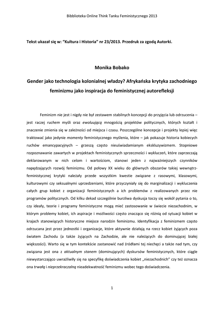 Bibblioteka Online Think Tanku Feministycznego 2013 Tekst ukazał się w: “Kultura i Historia” nr 23/2013. Przedruk za zgodą Autorki. Monika Bobako Gender jako technologia kolonialnej władzy? Afrykańska krytyka zachodniego feminizmu jako inspiracja do feministycznej autorefleksji Feminizm nie jest i nigdy nie był zestawem stabilnych koncepcji do przyjęcia lub odrzucenia – jest raczej ruchem myśli oraz ewoluującą mnogością projektów politycznych, których kształt i znaczenie zmienia się w zależności od miejsca i czasu. Poszczególne koncepcje i projekty lepiej więc traktować jako jedynie momenty feministycznego myślenia, które – jak pokazuje historia kobiecych ruchów emancypacyjnych – grzeszą często nieuświadamianym ekskluzywizmem. Stopniowe rozpoznawanie zawartych w projektach feministycznych sprzeczności i wykluczeń, które zaprzeczają deklarowanym w nich celom i wartościom, stanowi jeden z najważniejszych czynników napędzających rozwój feminizmu. Od połowy XX wieku do głównych obszarów takiej wewnątrzfeministycznej krytyki należały przede wszystkim kwestie związane z rasowymi, klasowymi, kulturowymi czy seksualnymi uprzedzeniami, które przyczyniały się do marginalizacji i wykluczenia całych grup kobiet z organizacji feministycznych a ich problemów z realizowanych przez nie programów politycznych. Od kilku dekad szczególnie burzliwa dyskusja toczy się wokół pytania o to, czy ideały, teorie i programy feministyczne mogą mieć zastosowanie w świecie niezachodnim, w którym problemy kobiet, ich aspiracje i możliwości często znacząco się różnią od sytuacji kobiet w krajach stanowiących historyczne miejsce narodzin feminizmu. Identyfikacja z feminizmem często odrzucana jest przez jednostki i organizacje, które aktywnie działają na rzecz kobiet żyjących poza światem Zachodu (a także żyjących na Zachodzie, ale nie należących do dominującej białej większości). Warto się w tym kontekście zastanowić nad źródłami tej niechęci a także nad tym, czy związana jest ona z aktualnym stanem (dominujących) dyskursów feministycznych, które ciągle niewystarczająco uwrażliwiły się na specyfikę doświadczenia kobiet „niezachodnich” czy też oznacza ona trwałą i nieprzekraczalną nieadekwatność feminizmu wobec tego doświadczenia. 1 Bibblioteka Online Think Tanku Feministycznego 2013 Interesującym punktem wyjścia dla tego typu rozważań może być książka nigeryjskiej autorki Oyèrónké Oyěwùmí zatytułowana The Invention of Women. Making an African Sense of Western Gender Discourse z 1997 roku, której tezy, tyleż kontrowersyjne co inspirujące, wydają mi się warte szczegółowego omówienia (zwłaszcza w polskim kontekście feministycznym, w którym głosy teoretyczek spoza świata Zachodu są bardzo słabo reprezentowane). Książka Oyěwùmí wpisuje sie w nurt krytyki zachodnich koncepcji feministycznych i nie tylko podważa zasadność stosowania kategorii feministycznych do opisu rzeczywistości afrykańskiej, ale także stara się pokazać, że ich aplikacja do tego kontekstu jest elementem długiego procesu kolonizowania afrykańskich ciał i umysłów. Spostrzeżenia zawarte w książce uderzają nie tylko w utrwalone stereotypowe, potoczne narracje dotyczące statusu i sytuacji kobiet w Afryce, reprodukowane w tysiącach filmów, reportaży, książek, dokumentów, skupiające się na ich tradycyjnym podporządkowaniu mężczyznom, zwyczajowym okaleczaniu ich genitaliów, aranżowanych małżeństwach, biedzie, poligamii, przymusie nieustannego rodzenia dzieci, seksualnej eksploatacji, ubezwłasnowolnieniu, etc, ale także w dyskursy feministyczne, które takie narracje biorą za dobrą monetę i na ich podstawie formułują projekty „emancypowania” afrykańskich sióstr.1 W moim przekonaniu znaczenie książki Oyěwùmí dla zachodnich dyskusji feministycznych, także tych prowadzonych na polskim gruncie, nie sprowadza się do tego, że książka ta dostarcza jeszcze jednej fascynującej etnograficznej opowieści dotyczącej życia kobiet i relacji płci w „egzotycznym” zakątku świata, która uświadamia nam jak mało wiemy o społeczeństwach afrykańskich i jak bardzo ich doświadczenie różni się od „naszego”. W odróżnieniu od takiego podejścia chciałabym raczej zasugerować przyjrzenie się pracy nigeryjskiej autorki w sposób, który pozwoli na uzyskanie szczególnej perspektywy do oglądu Zachodnich, nowoczesnych relacji społecznych, ekonomicznych i politycznych oraz wytwarzanego przez nie porządku genderowego a także kontestujących go stanowisk feministycznych. W pewnym sensie proponuję zatem powtórzenie zabiegu, który w swojej książce „Męska dominacja” wykorzystał Pierre Bourdieu. Autor ten starał się zakwestionować przejrzystość, pozorną naturalność i samooczywistość europejskiego porządku genderowego poprzez analizę, której punktem wyjścia było studium relacji płci w społeczności Berberów kabylskich. Ta okrężna podróż przez obszary byłej kolonii francuskiej 1 Narracje takie okazują się niezwykle trwałe mimo prowadzonych od dziesiątków lat badań, które pokazują silna pozycję kobiet w wielu historycznych organizacjach politycznych Afryki. Zob. na przykład wielokrotnie przedrukowywaną książkę ( która po raz pierwszy ukazała się w języku francuskim w roku 1960) Women of Tropical Africa, pod redakcją Denise Paulme, zwłaszcza tekst Annie M. D. Lebeuf, „The Role of Women in the Political Organization of African Societeies” (Lebeuf, 1974, 93-120). Zob. też tekst Chandry Talpade Mohanty, „Under Western Eyes” (Mohanty, 2000). 2 Bibblioteka Online Think Tanku Feministycznego 2013 była, jak mówił, konieczna „by złamać relację zdradzieckiej bliskości, która łączy nas z naszą własną tradycją”( Bourdieu, 2004, 10). Punktem wyjścia w rozważaniach Oyèrónké Oyěwùmí zawart