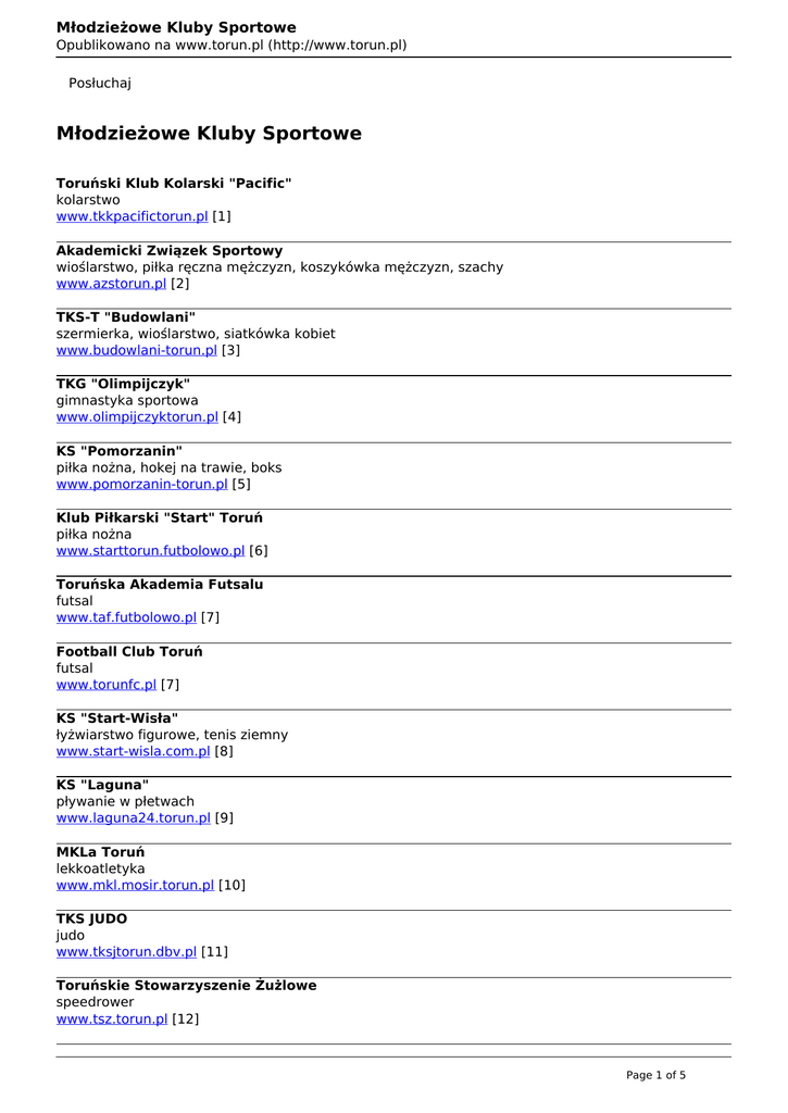 Młodzieżowe Kluby Sportowe Opublikowano na www.torun.pl (http://www.torun.pl) Posłuchaj Młodzieżowe Kluby Sportowe Toruński Klub Kolarski "Pacific" kolarstwo www.tkkpacifictorun.pl [1] Akademicki Związek Sportowy wioślarstwo, piłka ręczna mężczyzn, koszykówka mężczyzn, szachy www.azstorun.pl [2] TKS-T "Budowlani" szermierka, wioślarstwo, siatkówka kobiet www.budowlani-torun.pl [3] TKG "Olimpijczyk" gimnastyka sportowa www.olimpijczyktorun.pl [4] KS "Pomorzanin" piłka nożna, hokej na trawie, boks www.pomorzanin-torun.pl [5] Klub Piłkarski "Start" Toruń piłka nożna www.starttorun.futbolowo.pl [6] Toruńska Akademia Futsalu futsal www.taf.futbolowo.pl [7] Football Club Toruń futsal www.torunfc.pl [7] KS "Start-Wisła" łyżwiarstwo figurowe, tenis ziemny www.start-wisla.com.pl [8] KS "Laguna" pływanie w płetwach www.laguna24.torun.pl [9] MKLa Toruń lekkoatletyka www.mkl.mosir.torun.pl [10] TKS JUDO judo www.tksjtorun.dbv.pl [11] Toruńskie Stowarzyszenie Żużlowe speedrower www.tsz.torun.pl [12] Page 1 of 5 Młodzieżowe Kluby Sportowe Opublikowano na www.torun.pl (http://www.torun.pl) Automobilklub Toruński karting www.automobilklubtorunski.pl [13] Toruński Klub Motorowy karting www.tkm.torun.pl [14] [14]Klub Sportowy Angels Toruń futbol amerykański www.angelstorun.pl [14] KST Energa-Manekin Toruń tenis stołowy www.energa-manekin.pl [15] Stowarzyszenie Miłośników Sportów Motorowych "Stal" Toruń żużel www.speedway.torun.pl [16] Toruński Kub Żeglarski żeglarstwo www.tkz.torun.pl [17] Stowarzyszenie Sportów Walki "Ring Wolny" boks www.ringwolny.info.pl [18] Toruński Klub Bowlingowy bowling www.bowling.info.pl [19] Akademicki Klub Karate Tradycyjnego karate www.akkt.torun.pl [20] Toruński Klub Karate KYOKUSHIN karate www.karate8.host.pl [21] Torunski Klub "Karate Oyama" karate www.januszbrodacki.pl [22] Toruński Klub Karate Tradycyjnego KUMADE karate www.karatekumade.com [23] Klub Karate Shotokan DOJO Toruń karate www.dojotorun.pl [24] Toruński Klub Karate Do-Ronin karate www.ronin.torun.pl [25] Toruński Klub Modelarski "Hercules" modelarstwo Page 2 of 5 Młodzieżowe Kluby Sportowe Opublikowano na www.torun.pl (http://www.torun.pl) www.hercules.mosir.torun.pl [26] Toruński Ludowy Klub Jeździecki jeździectwo www.facebook.com/torunskiklub.jazdykonnej [27] Toruński Klub Jazdy Konnej jeździectwo www.tkjk.org.pl [28] Akademicki Związek Sportowy Organizacja Środowiskowa siatkówka mężczyzn www.azsos.torun.pl [29] Klub Szachowy "Toruń-64" szachy www.64torun.cba.pl [30] Aeroklub Pomorski sporty samolotowe www.aeroklub.torun.pl [31] Toruński Klub Futbolu Stołowego futbol stołowy www.facebooc.com/tkfs [32] Klub Wysokogórski wspinaczka sportowa www.kwtorun.pl [33] Toruńskie StowarzyszeniePaintball "Pro-Paint" paintball www.pro-paint.pl [34] Toruńskie Stowarzyszenie Sportów Walki BUSHI ju-jitsu www.jujitsu-torun.pl [35] Toruńskie Stowarzyszenie Tenisowe tenis ziemny www.facebook.com/tst.torun [36] Ognisko Sportu Niepełnosprawnych „Alfa Sport Toruń” sport osób niepełnosprawnych www.mosir.torun.pl [37] Toruński Klub Sportu Osób Niepełnosprawnych sport osób niepełnosprawnych www.tksonklub.pl.tl [37] ZANSHIN Torunski Kluib Karate Shotokan karate shotokan WKF www.zanshin-torun.pl [38] KS GWIAZDA piłka nożna www.gwiazda-torun.pl [39] Page 3 of 5 Młodzieżowe Kluby Sportowe Opublikowano na www.torun.pl (http://www.torun.pl) Toruń Multisport Team pływanie www.tmt.torun.pl [40] Taneczny Klub Sportowy "DANCE&DANCE" taniec sportowy www.taniec-towarzyski.eu [41] Dziecięca Akademia Piłkarska Sp. z o.o. piłka nożna www.daptorun.pl [42] Młodzieżowa Akademia Footbalu Sp. z o.o. piłka nożna www.maftorun.pl [43] Tenis Klub Torun Sp z o.o. tenis ziemny www.tenisklub-torun.pl [44] Fundacja Kujawsko-Pomorskeich Akademii Piłkarskich JSS Klub Sportowy piłka nożna www.kpjss.pl [45] Odnośniki: [1] http://www.tkkpacifictorun.pl [2] http://www.azstorun.pl [3] http://www.budowlani-torun.pl [4] http://www.olimpijczyktorun.pl [5] http://www.pomorzanin-torun.pl [6] http://www.starttorun.futbolowo.pl [7] http://www.taf.futbolowo.pl [8] http://www.start-wisla.com.pl [9] http://www.laguna24.torun.pl [10] http://www.mkl.mosir.torun.pl [11] http://www.tksjtorun.dbv.pl [12] http://www.tsz.torun.pl [13] http://www.automobilklubtorunski.pl [14] http://www.tkm.torun.pl [15] http://www.energa-manekin.pl/ [16] http://www.speedway.torun.pl [17] http://www.tkz.torun.pl [18] http://www.ringwolny.info.pl [19] http://www.bowling.info.pl [20] http://www.akkt.torun.pl [21] http://www.karate8.host.pl [22] http://www.januszbrodacki.pl [23] http://www.karatekumade.com [24] http://www.dojotorun.pl [25] http://www.ronin.torun.pl [26] http://www.hercules.mosir.torun.pl [27] https://www.facebook.com/torunskiklub.jazdykonnej/ [28] http://www.tkjk.org.pl [29] http://www.azsos.torun.pl [30] http://www.64torun.cba.pl Page 4 of 5 Młodzieżowe Kluby Sportowe Opublikowano na www.torun.pl (http://www.torun.pl) [31] [32] [33] [34] [35] [36] [37] [38] [39] [40] [41] [42] [43] [44] [45] http://www.aeroklub.torun.pl http://www.facebooc.com/tkfs http://www.kwtorun.pl http://www.pro-paint.pl http://www.jujitsu-torun.pl http://www.facebook.com/tst.torun http://www.tksonklub.pl.tl http://www.zanshin-torun.pl http://www.gwiazda-torun.pl http://www.tmt.torun.pl http://www.taniec-towarzyski.eu http://www.daptorun.pl http://www.maftorun.pl http://www.tenisklub-torun.pl http://www.kpjss.pl Page 5 of 5 Powered by TCPDF (www.tcpdf.org)