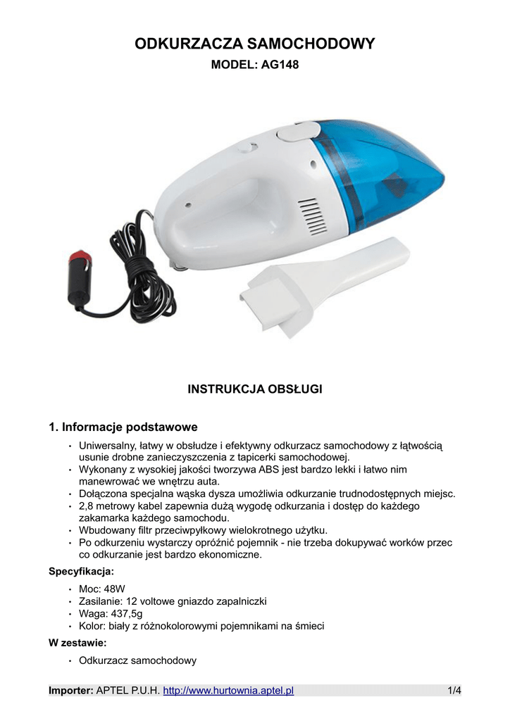 ODKURZACZA SAMOCHODOWY MODEL: AG148 INSTRUKCJA OBSŁUGI 1. Informacje podstawowe • Uniwersalny, łatwy w obsłudze i efektywny odkurzacz samochodowy z łątwością usunie drobne zanieczyszczenia z tapicerki samochodowej. • Wykonany z wysokiej jakości tworzywa ABS jest bardzo lekki i łatwo nim manewrować we wnętrzu auta. • Dołączona specjalna wąska dysza umożliwia odkurzanie trudnodostępnych miejsc. • 2,8 metrowy kabel zapewnia dużą wygodę odkurzania i dostęp do każdego zakamarka każdego samochodu. • Wbudowany filtr przeciwpyłkowy wielokrotnego użytku. • Po odkurzeniu wystarczy opróźnić pojemnik - nie trzeba dokupywać worków przec co odkurzanie jest bardzo ekonomiczne. Specyfikacja: • • • • Moc: 48W Zasilanie: 12 voltowe gniazdo zapalniczki Waga: 437,5g Kolor: biały z różnokolorowymi pojemnikami na śmieci W zestawie: • Odkurzacz samochodowy Importer: APTEL P.U.H. http://www.hurtownia.aptel.pl 1/4 • Wąska dysza odkurzająca • Całość zapakowana w solidne i estetyczne pudełko. 2. Schemat urządzenia Importer: APTEL P.U.H. http://www.hurtownia.aptel.pl 2/4 3. Użytkowanie Importer: APTEL P.U.H. http://www.hurtownia.aptel.pl 3/4 4. Bezpieczeństwo i środki ostrożności • Urządzenie może być zasilane jedynie z gniazda zapalniczki samochodowej o napięciu 12V. • Jeżeli odkurzacz nagle przestał działać sprawdź bezpiecznik znajdujący się we wtyku zapalniczki samochodowej. • Odkurzacz nie jest urządzeniem przeznaczonym do odkurzania dużych powierzchni, a jego długotrwała praca grozi awarią. • Do czyszczenia używać wilgotnej ściereczki, ewentualnie łagodnego detergentu. • Nigdy nie zanurzać silnika urządzenia w wodzie. • Nie narażać na ekstremalnie wysokie i niskie temperatury. • Nie ciągnąć ani nie plątać kabla odkurzacza. deklaracja zgodności urządzenia do pobrania pod adresem: http://www.aptel.pl Importer: APTEL P.U.H. http://www.hurtownia.aptel.pl 4/4