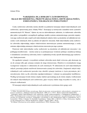 Jolanta Wilsz NARZĘDZIA DLA DORADCY ZAWODOWEGO. SKALE DO MIERZENIA: PRZETWARZALNOŚCI, ODTWARZALNOŚCI, EMISYJNOŚCI, TOLERANCJI I PODATNOŚCI1 Cechy osobowości człowieka można określić na podstawie koncepcji stałych indywidualnych cech osobowości, opracowanej przez Jolantę Wilsz2. Koncepcję tę teoretycznie uzasadnia teoria systemów autonomicznych M. Mazura3. Opiera się ona na udowodnionym założeniu, że traktowanie człowieka jako jeden z przypadków szczególnych ogólnego modelu systemu autonomicznego, pozwala rozpatrywać jego osobowość jako zespół cech indywidualnych stałych, które są niezależne od oddziaływań otoczenia i cech zmiennych, które są zależne od wpływów otoczenia. Stałe indywidualne cechy osobowości człowieka odpowiadają, stałym właściwościom sterowniczym systemu autonomicznego, a cechy zmienne odpowiadają zmiennym właściwościom sterowniczym tego systemu. Ponieważ stałe indywidualne cechy osobowości są niezależne od oddziaływań otoczenia i nie podlegają kształtowaniu – można uznać je za predyspozycje wrodzone pełniące zasadniczą funkcję w działalności zawodowej człowieka, które w najbardziej trwały sposób determinują jego zachowania i funkcjonowanie. Do zgodności sytuacji z wszystkimi cechami człowieka może dojść wówczas, gdy dostosuje się on do sytuacji albo gdy sytuacja zostanie do niego dostosowana. Obydwie te ewentualności mogą występować wyłącznie w odniesieniu do cech zmiennych. W odniesieniu do cech indywidualnych stałych, pozostaje jedynie możliwość dostosowania sytuacji do człowieka. Znajomość stałych indywidualnych cech osobowości pozwala więc określić sytuacje (zarówno w życiu prywatnym, jak i zawodowym), które są dla człowieka najodpowiedniejsze i wskazać na potencjalnie konfliktowe. Według tej koncepcji trwałe różnice między ludźmi sprowadzają się do różnic między wielkościami ich stałych indywidualnych cech osobowości, gdyż wszyscy ludzie mają wszystkie te cechy, ale o różnych wielkościach. W koncepcji stałych indywidualnych cech osobowości wyróżniono dwie grupy cech: 1 J. Wilsz, Narzędzia dla doradcy zawodowego. Skale do mierzenia: przetwarzalności, odtwarzalności, emisyjności, tolerancji i podatności, „Edukacja Ustawiczna Dorosłych”, 2009, nr 4, s. 58-67. Skale te opracowała Jolanta Wilsz. 2 Koncepcja stałych indywidualnych cech osobowości została rozpowszechniona w następujących publikacjach: J. Wilsz, Psychologizowana wersja koncepcji stałych indywidualnych cech osobowości i jej wykorzystanie przy wyborze zawodu, [w:] Kształcenie zawodowe: pedagogika i psychologia, nr III, Wydawnictwo WSP w Częstochowie, red. T. Lewowicki, J. Wilsz, I. Ziaziun i N. Nyczkało, Częstochowa – Kijów 2001, s. 405-415; J. Wilsz, Teoria pracy. Implikacje dla pedagogiki pracy, Oficyna Wydawnicza „Impuls”, Kraków 2009, s. 88-93. 3 M. Mazur, Cybernetyczna teoria układów samodzielnych, PWN, Warszawa 1966. – stałe indywidualne cechy osobowości w dziedzinie funkcji intelektualnych (przetwarzalność, odtwarzalność i talent); – stałe indywidualne cechy osobowości w dziedzinie stosunków interpersonalnych (emisyj- ność, tolerancja, podatność)4. Jeśli chodzi o cechy w dziedzinie funkcji intelektualnych: – p r z e t w a r z a l n o ś ć – jest to stopień doskonałości sfery myślowej; – o d t w a r z a l n o ś ć – jest to stopień doskonałości sfery percepcyjno-mnemicznej; – t a l e n t – jest to stopień doskonałości w określonej dziedzinie działalności. Jeśli chodzi o cechy w dziedzinie stosunków interpersonalnych: – e m i s y j n o ś ć: • dodatnia – jest to skłonność do wydawania resursów do otoczenia, • ujemna – jest to skłonność do pobierania resursów z otoczenia. – t o l e r a n c j a – jest to zakres oddziaływań otoczenia, na które osobowość dobrowolnie adekwatnie reaguje; – p o d a t n o ś ć – jest to zakres oddziaływań otoczenia, na które osobowość pod presją adekwatnie reaguje. Od wartości cech w dziedzinie funkcji intelektualnych zależy efektywność operowania informacjami i poziom funkcjonowania intelektualnego. Natomiast cechy w dziedzinie stosunków interpersonalnych determinują umiejętności interpersonalne i kształtują stosunki międzyludzkie. Ponieważ w zakresie stałych indywidualnych cech osobowości nie jest możliwe dostosowanie się człowieka do wymagań zawodu (może się ono odbywać wyłącznie w ramach cech zmiennych), dlatego do zawodu należy dobierać takiego człowieka, który posiada wartości tych cech pożądane w tej profesji i oczywiście odpowiednie przygotowanie, które pozwala mu dostosować się do zawodu w zakresie cech zmiennych. Dla różnych zawodów można określić zakres dopuszczalnych wartości każdej z sześciu stałych indywidualnych cech osobowości sprzyjających efektywnemu funkcjonowaniu. Aby trafnie wskazać takie zakresy, należy wnikliwie zidentyfikować i przeanalizować funkcje, zadania i czynności realizowane przez pracownika w poszczególnych zawodach, kompetencje, kwalifikacje, umiejętności, wiadomości, cechy psychofizyczne, pożądane w nich – określone w Kwalifikacjach zawodów i specjalności, w Standardach kwalifikacji zawodowych oraz zawarte w innych opracowaniach i dokumentach, w których zamieszczone zostały opisy i charakterystyki zawodów. Następnie należy określić zakresy wartości wszystkich stałych indywidualnych cech osobowości, które z jednej strony będą gwarantowały efektywną pracę, z drugiej będą umożliwiały odpowiednie przygotowanie 4 Definicje tych cech podano w: J. Wilsz, Psychologizowana..., s. 407-408. 2 się do wykonywania danego zawodu w trakcie kształcenia zawodowego, a następnie w procesie ustawicznego doskonalenia zawodowego. Ten tok postępowania zastosowałam w odniesieniu do bardzo wielu różnych zawodów. Najpierw w oparciu o chara